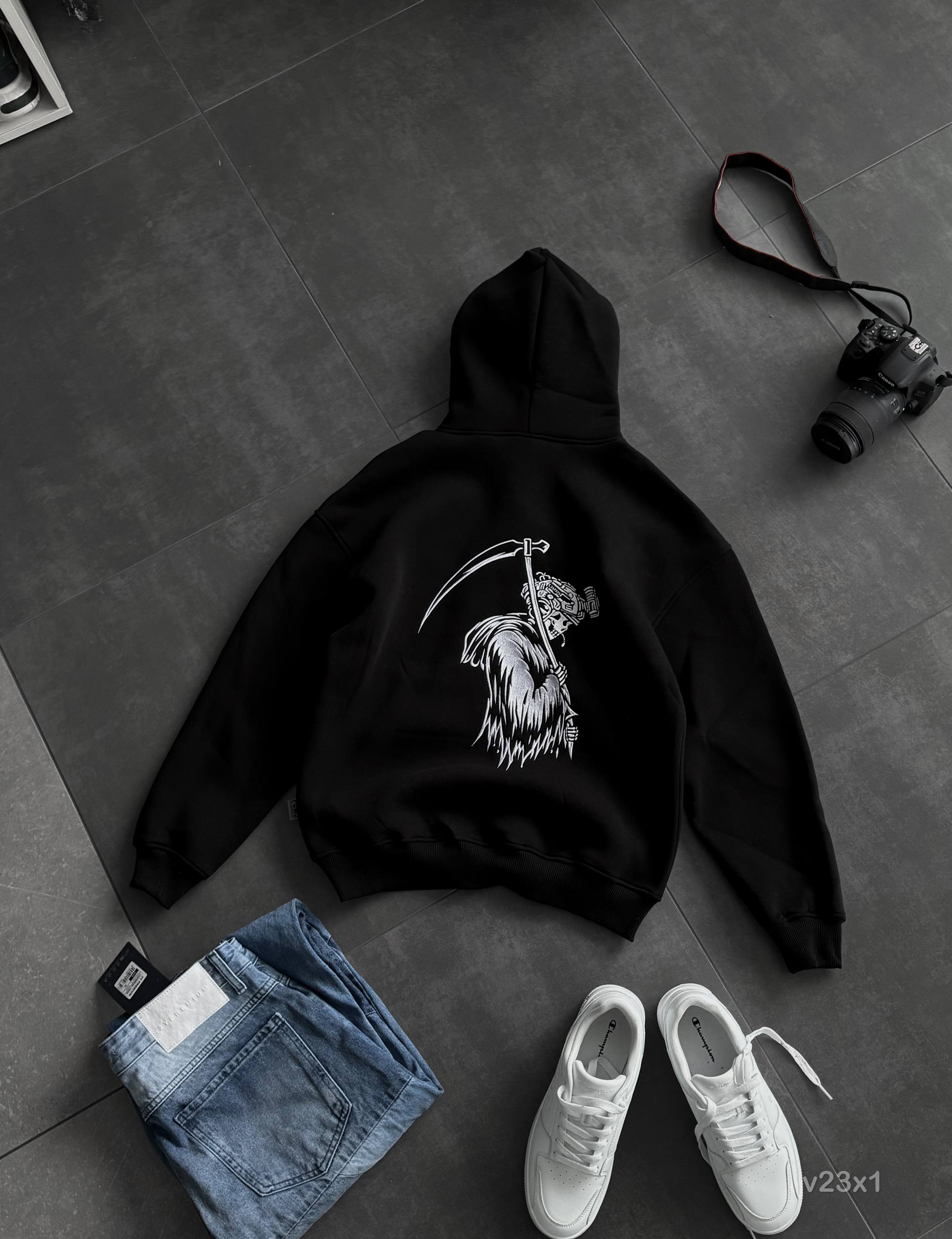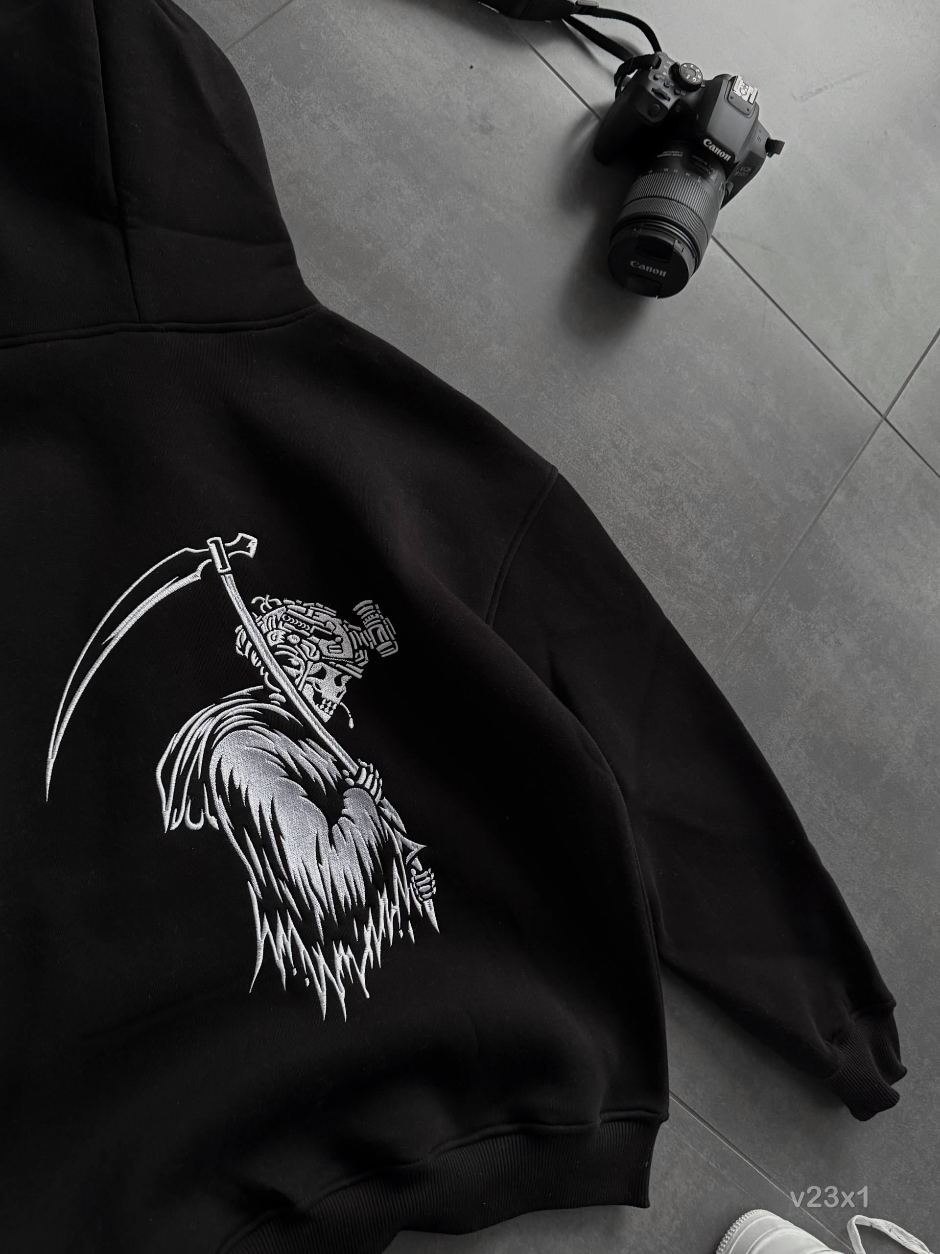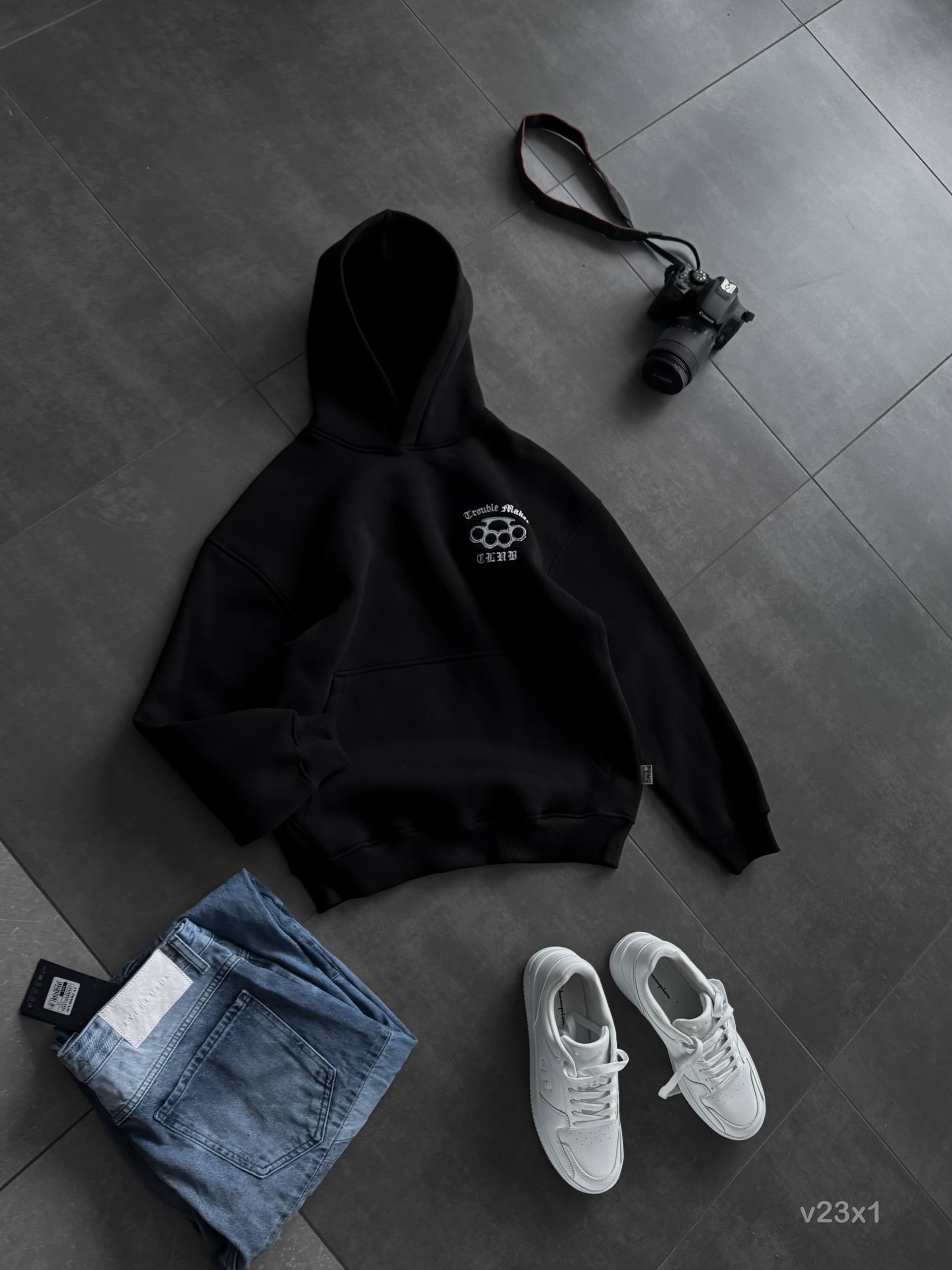Мужское Утепленное Черное Худи на Флисе – Свободного Кроя с Вышивкой на Спине