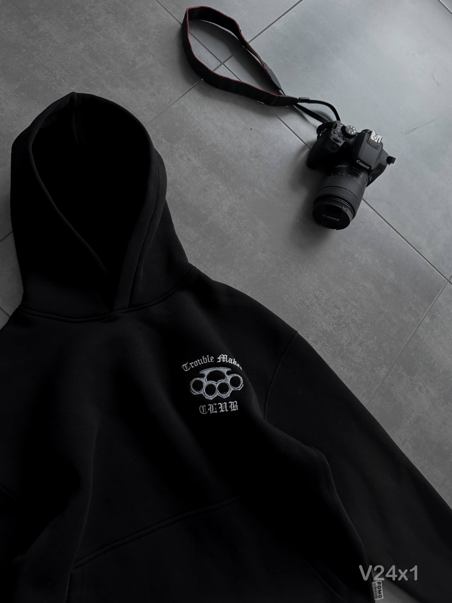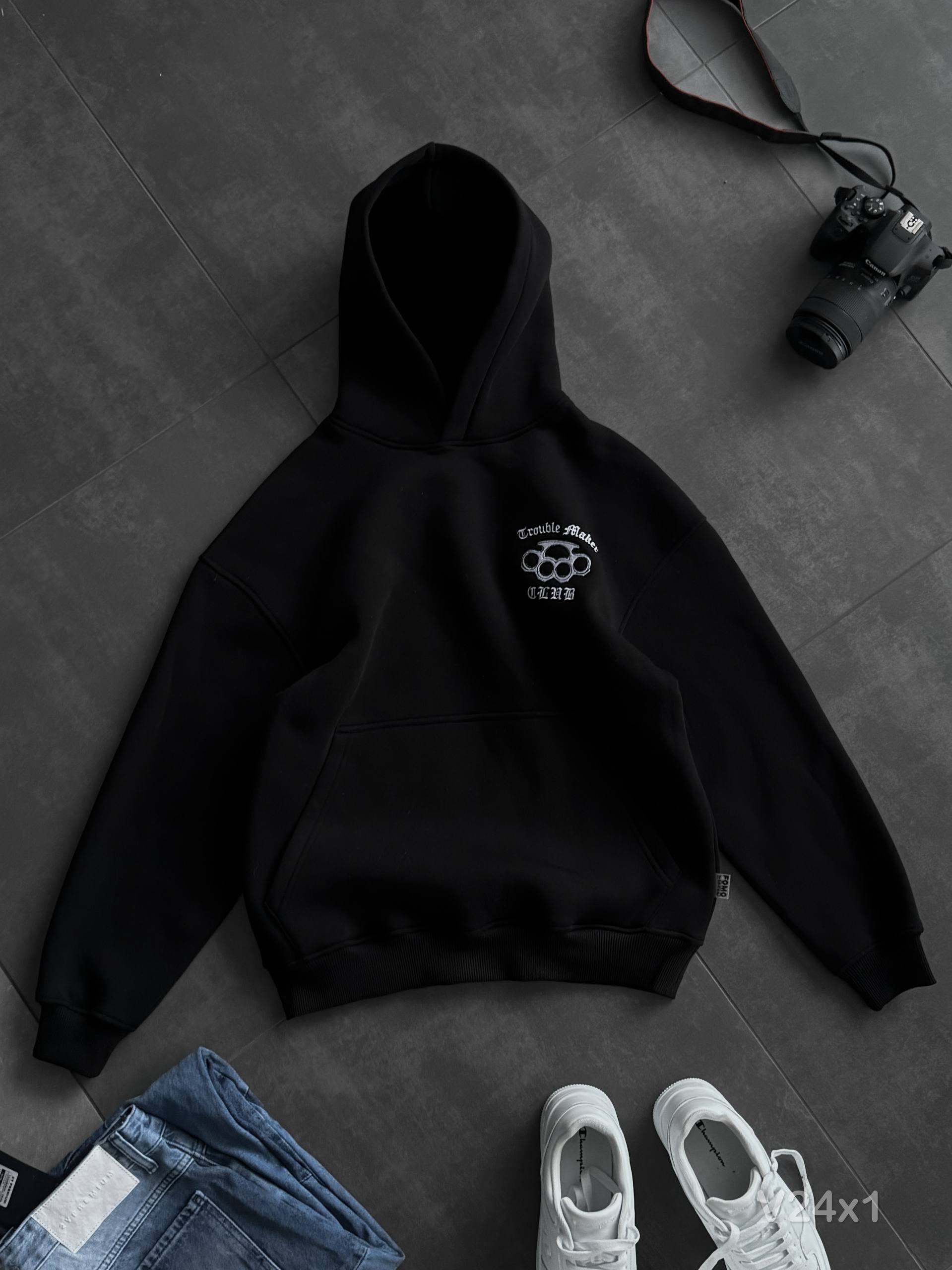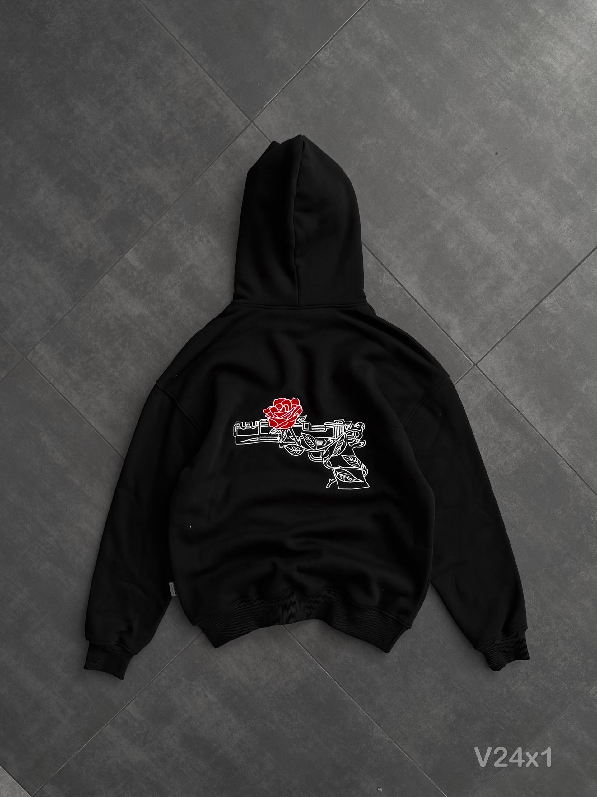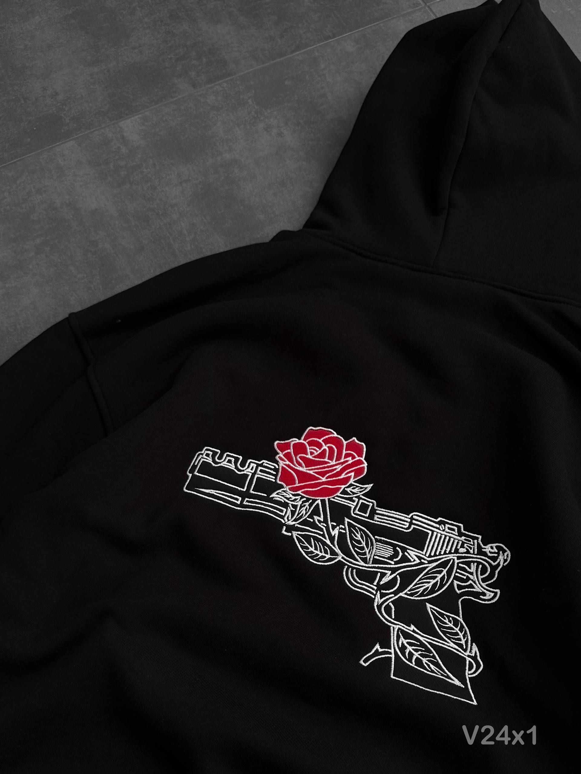 Мужское Утепленное Черное Худи Оверсайз на Флисе с Вышивкой Пистолет