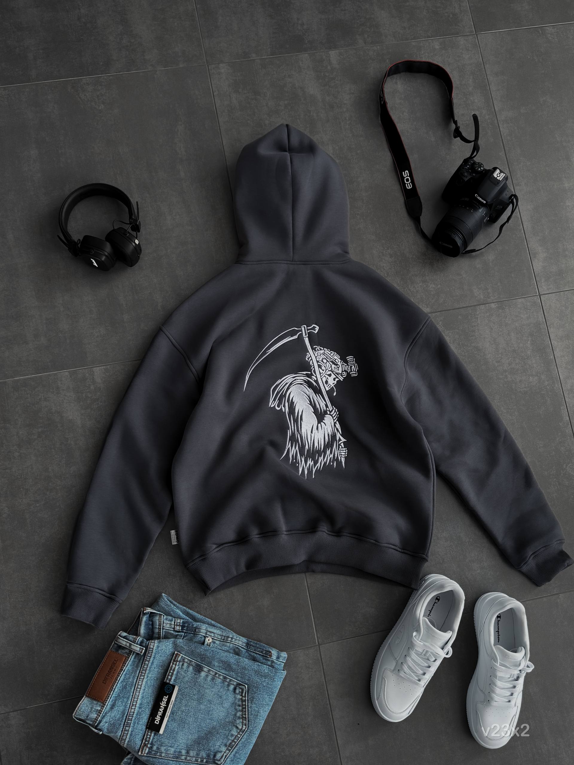 Мужское Утепленное Графитовое Худи на Флисе – Свободного Кроя с Вышивкой на Спине