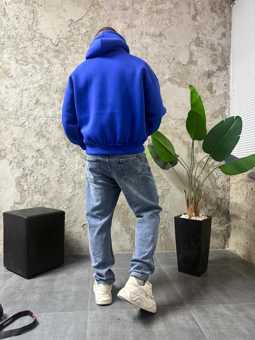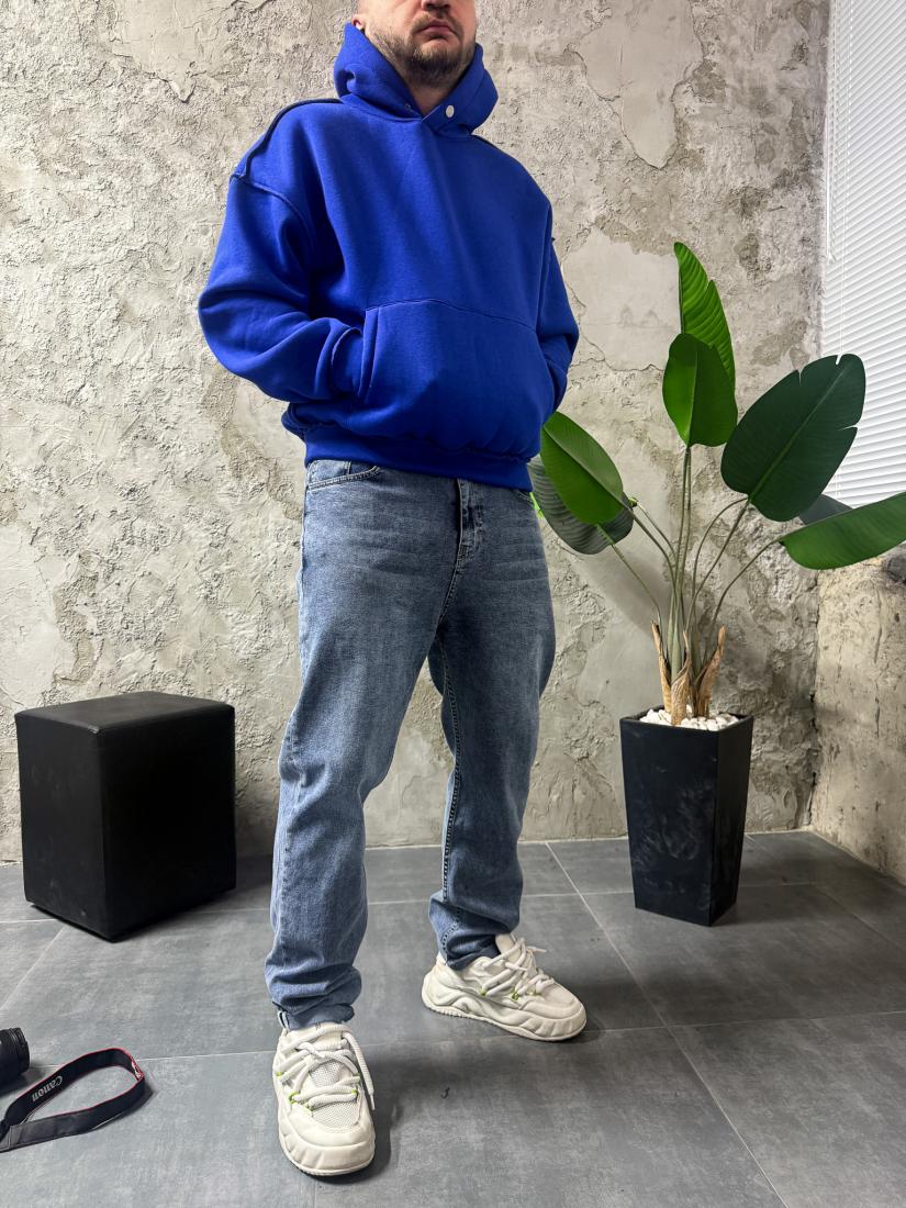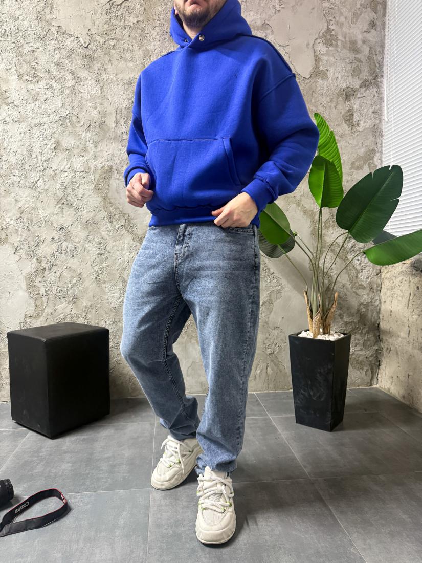 Мужское Утепленное Синее Худи Оверсайз на Флисе со Швами Наружу