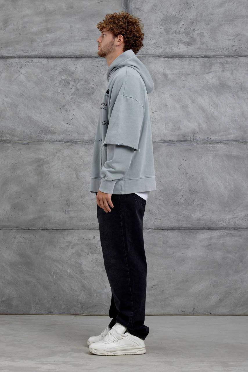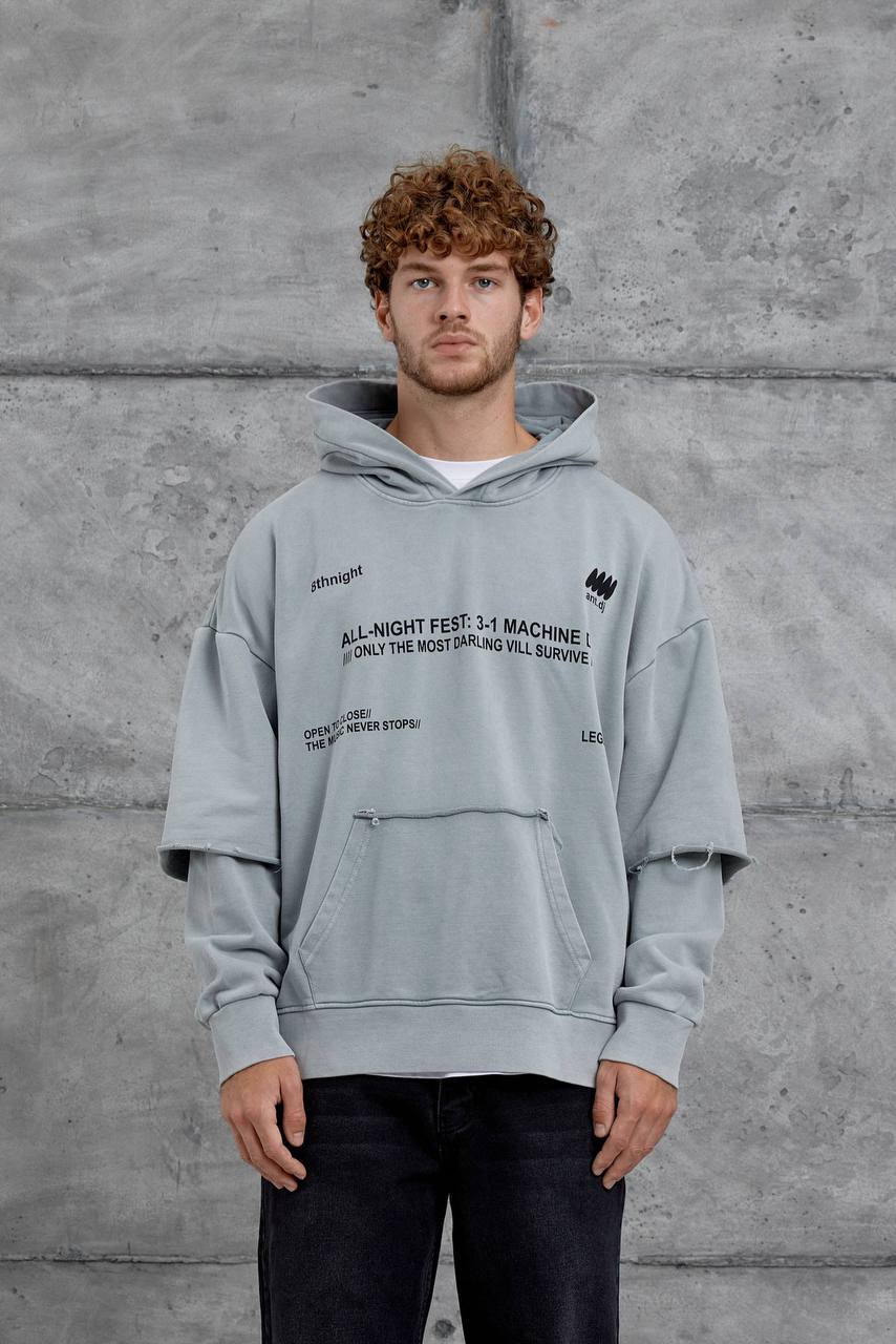 Мужское Вареное Серое Худи Оверсайз с Надписями и Двойными Рукавами