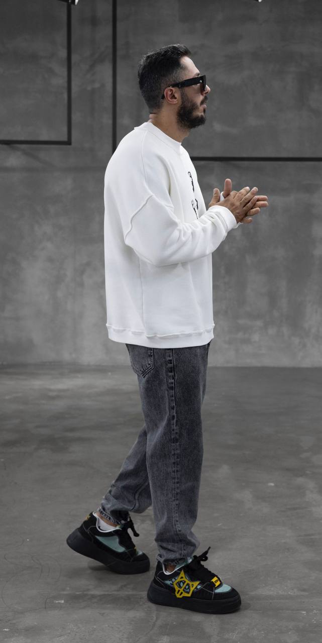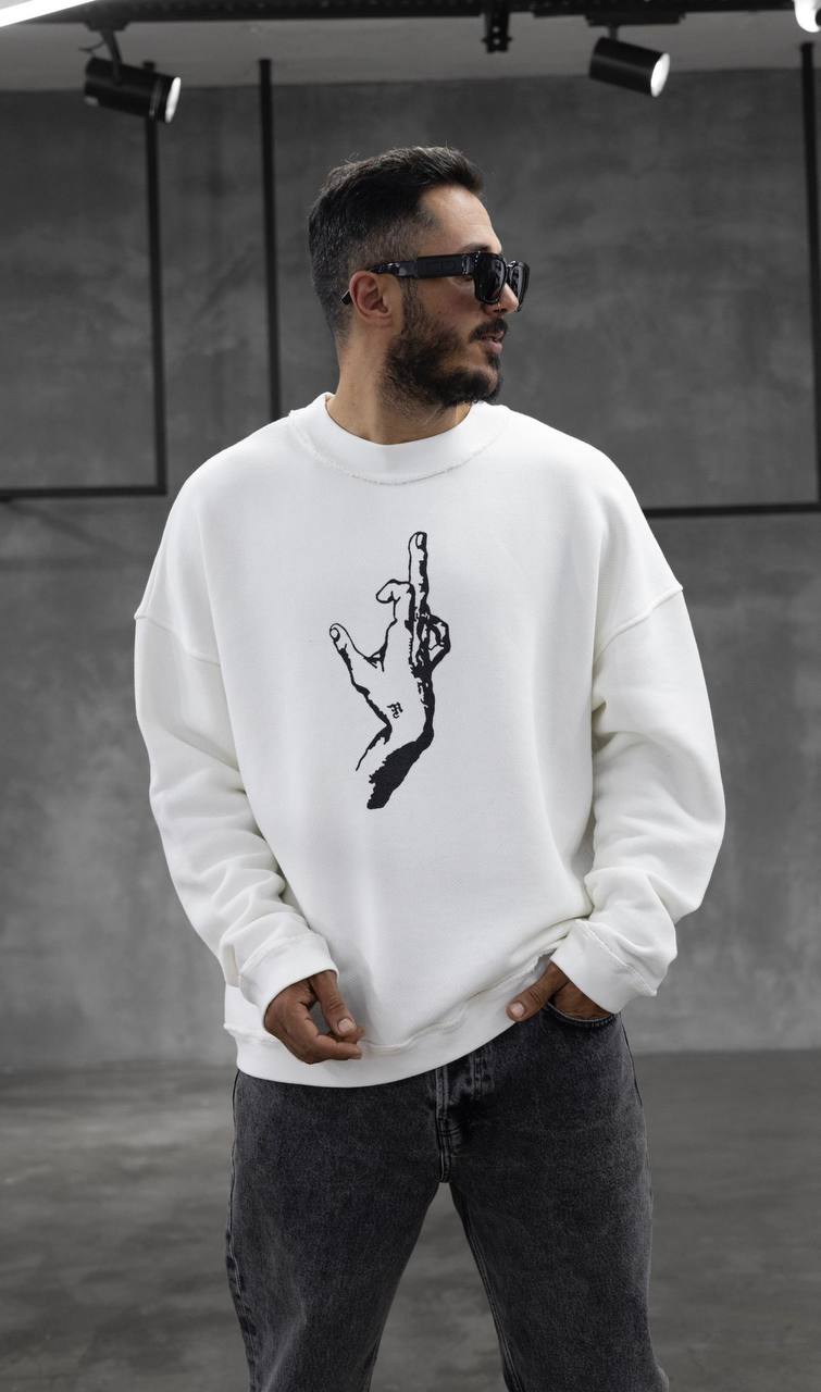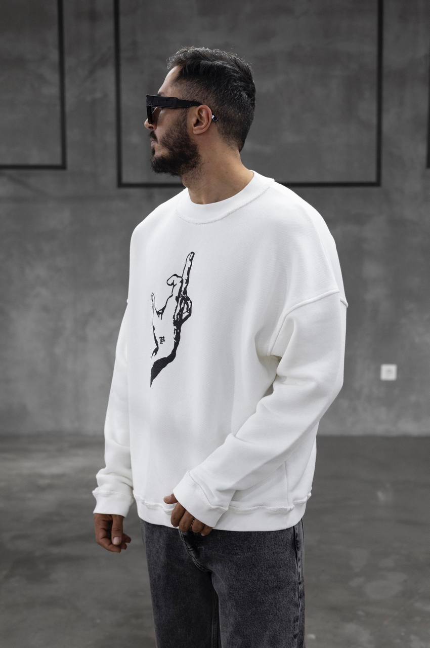 Мужской Белый Свитшот Оверсайз с Принтом Средний Палец – Трехнитка Диагональ