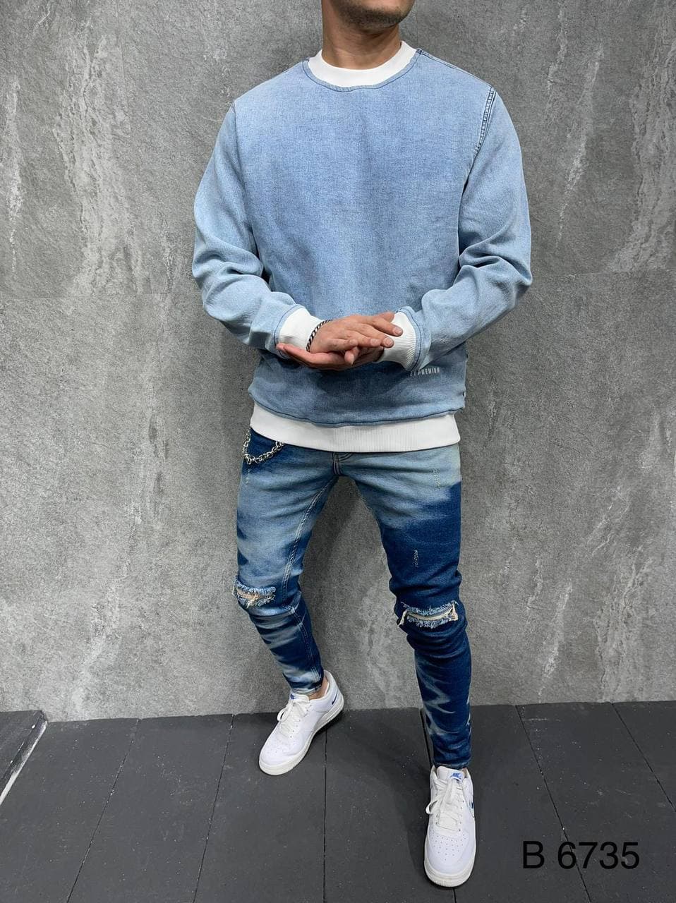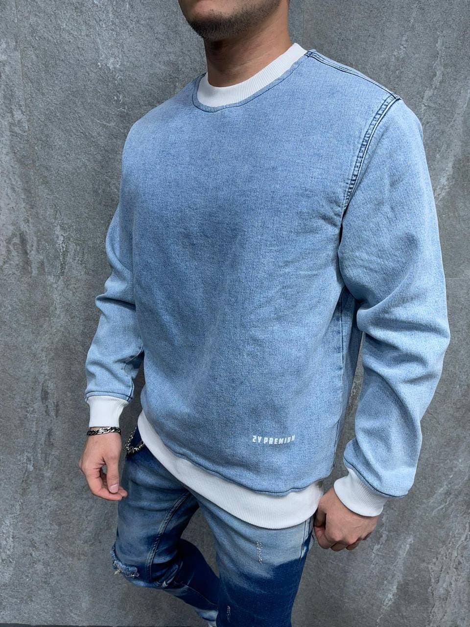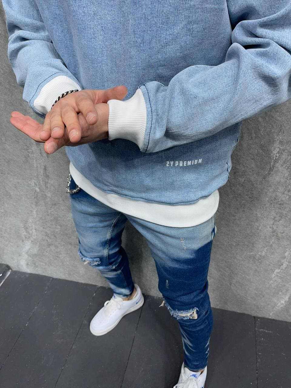 Мужской Голубой Джинсовый Свитшот – на Белых Манжетах Свободный