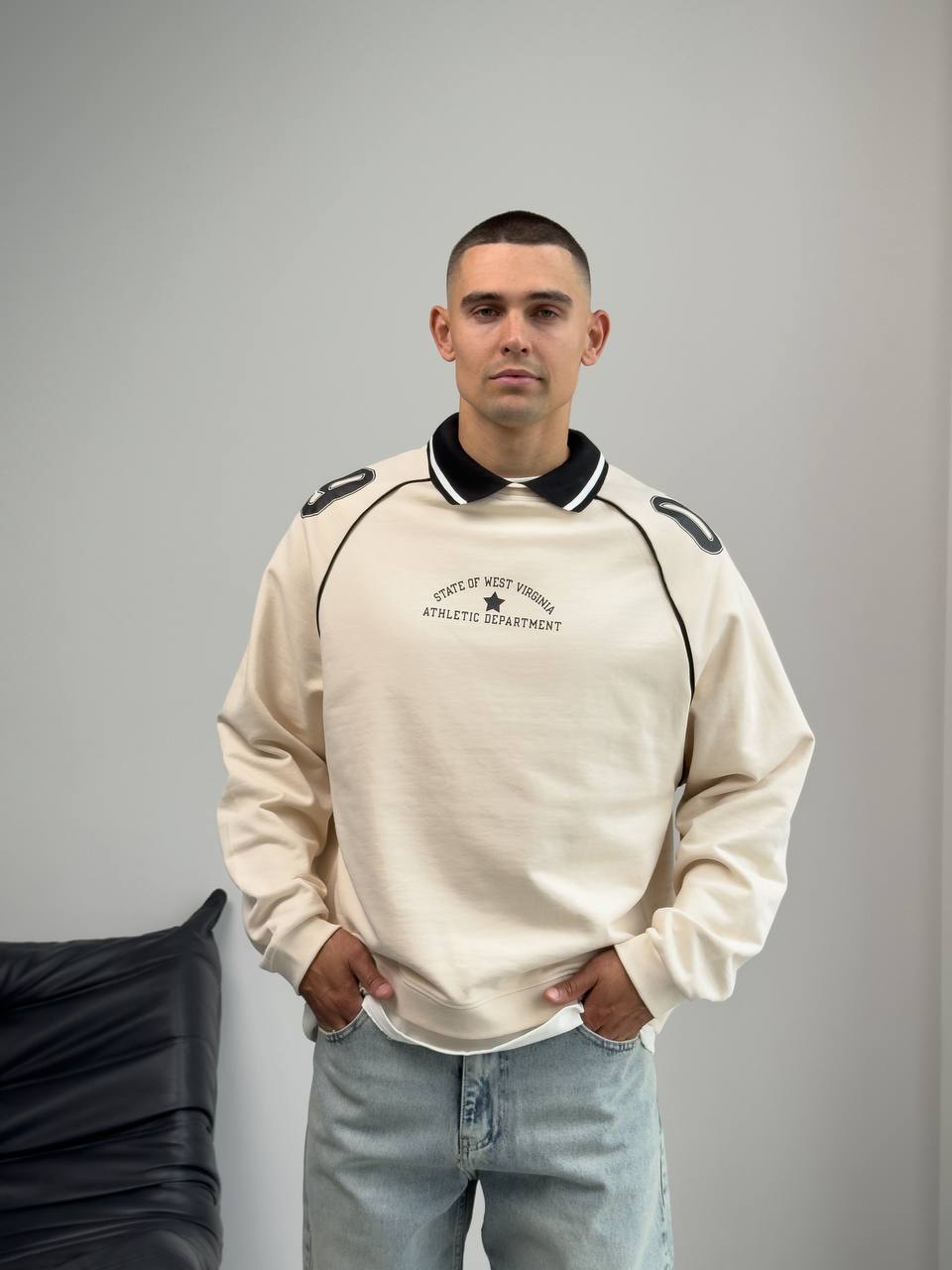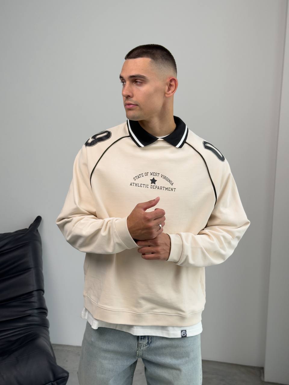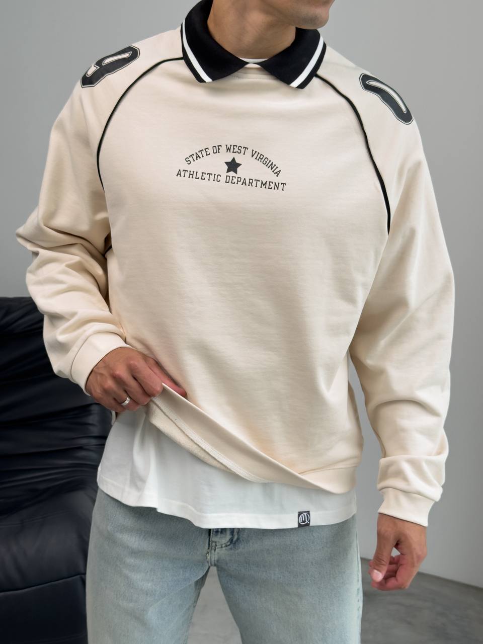Мужской Кремовый Свитшот Реглан Оверсайз с Белым Воротником и Принтом Номером на Спине