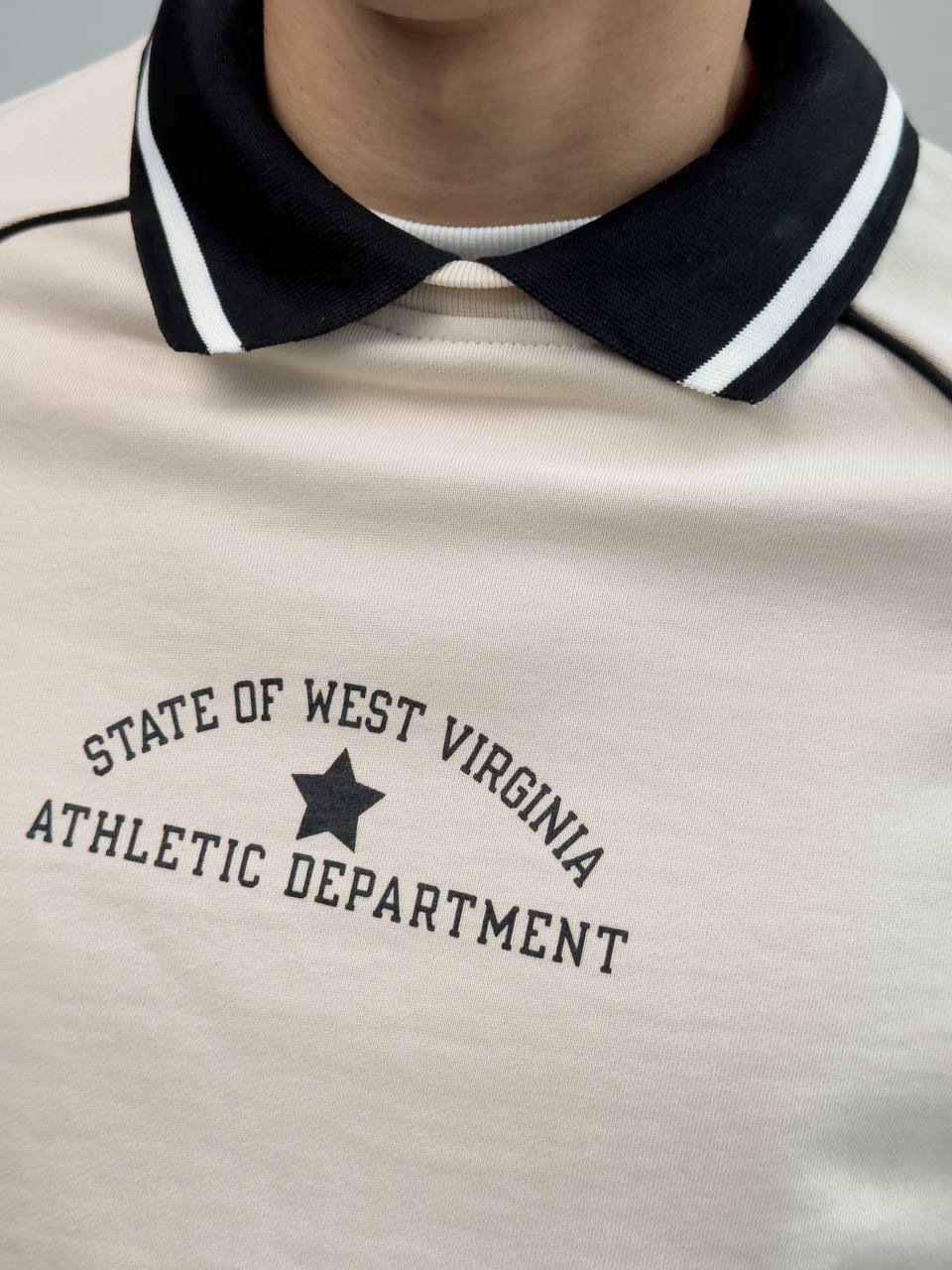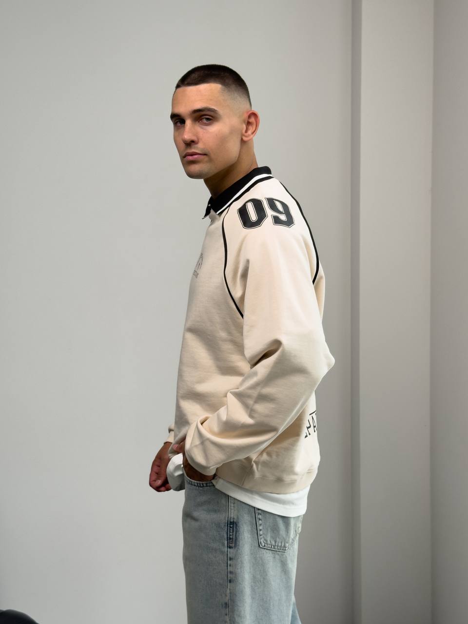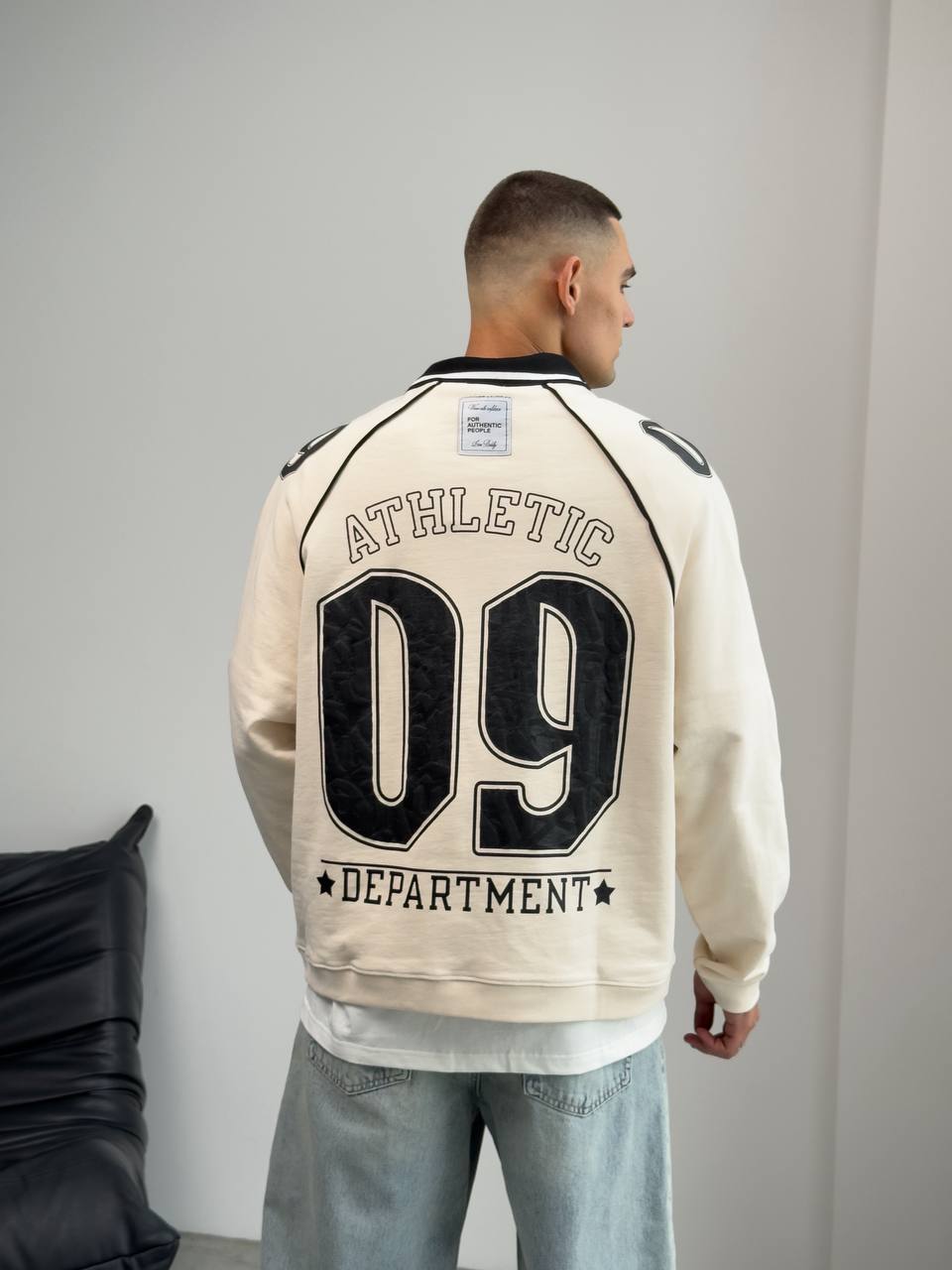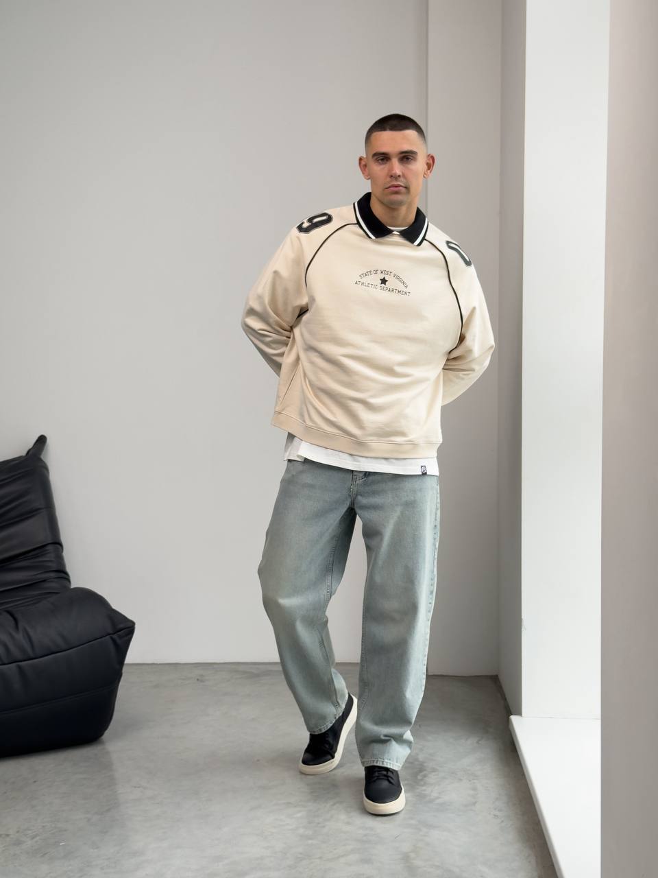Мужской Кремовый Свитшот Реглан Оверсайз с Белым Воротником и Принтом Номером на Спине