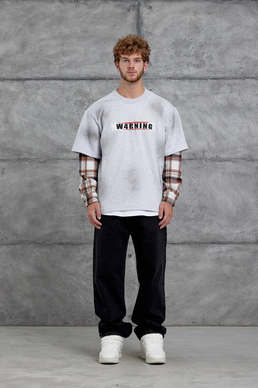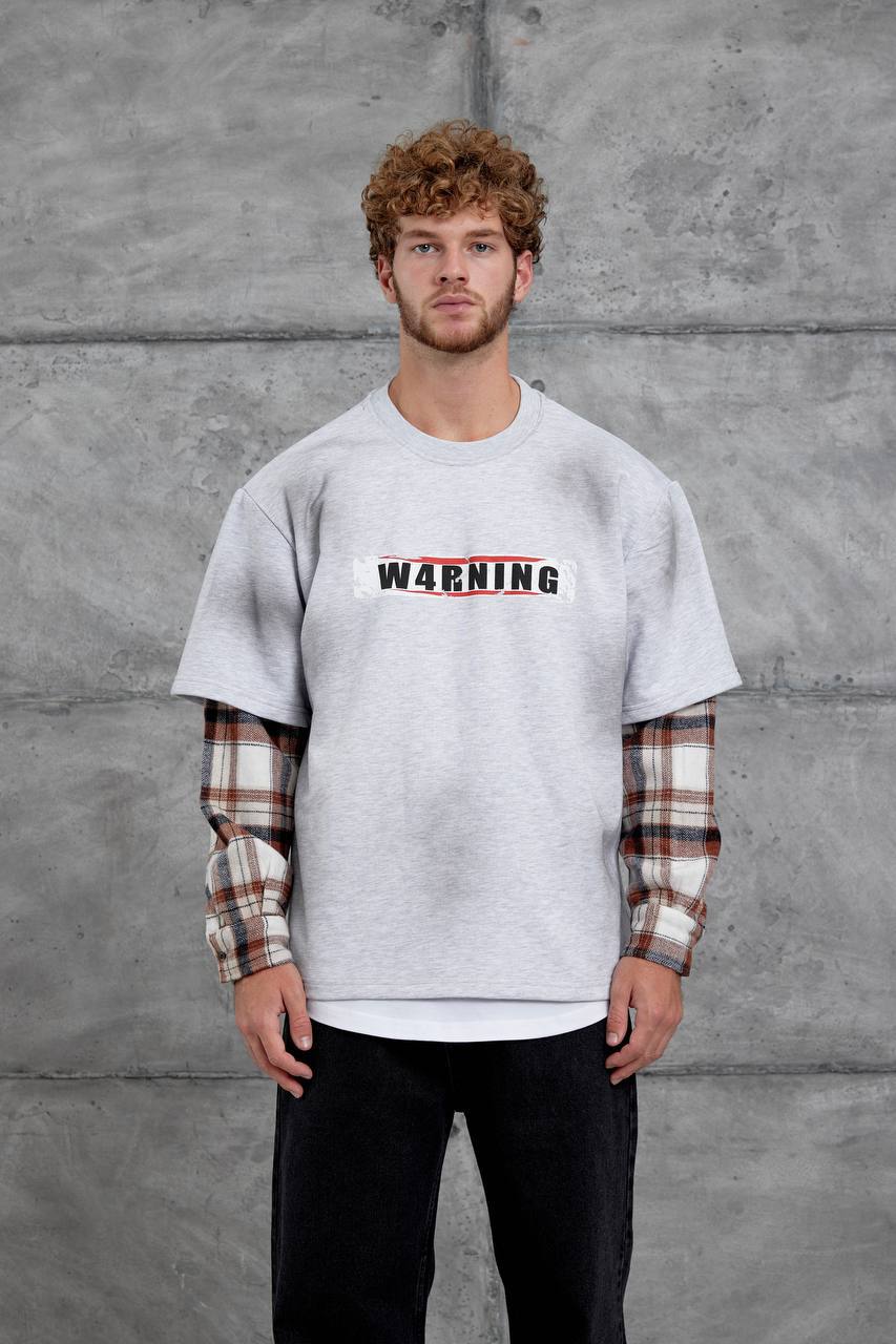 Мужской Серый Меланж Свитшот Оверсайз с Комбинированным Двойным Рукавом в Клеточку