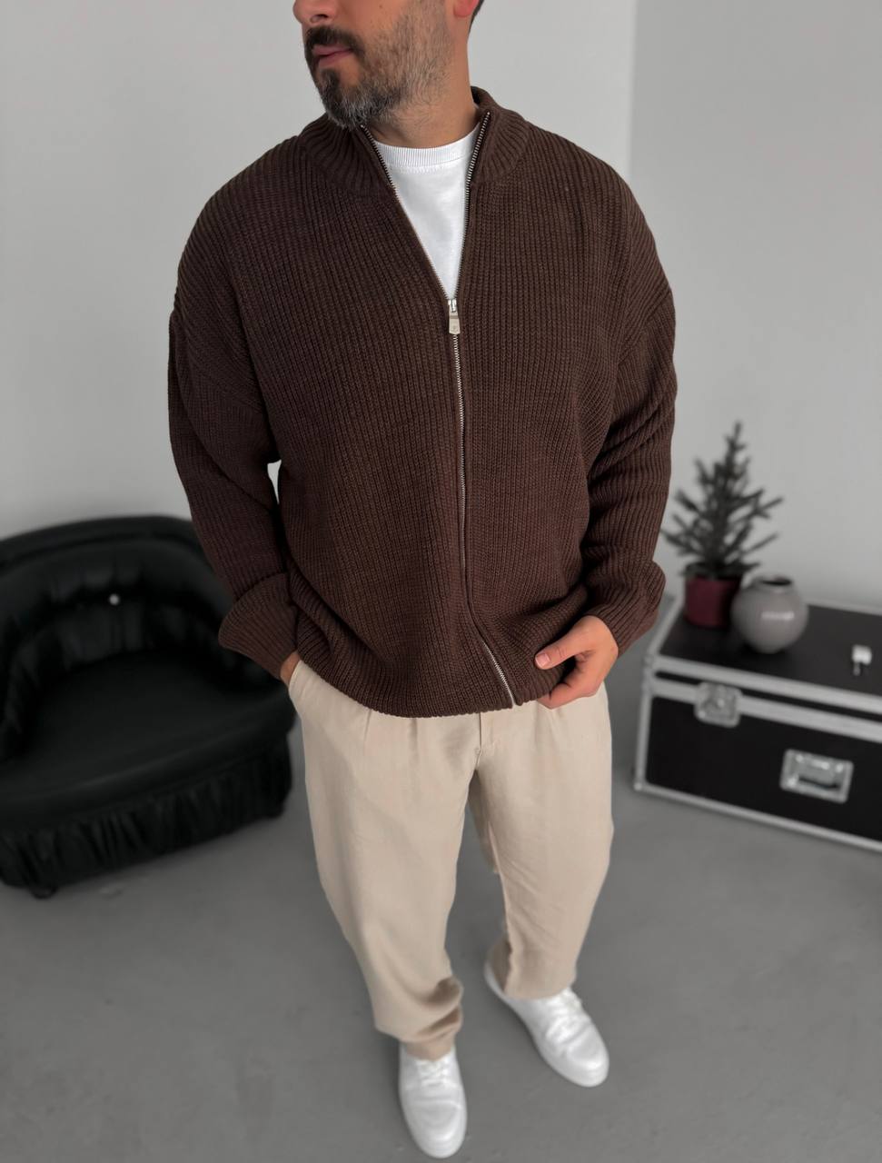 Мужской Классический Вязаный Коричневый Кардиган Свободного Кроя со Змейкой
