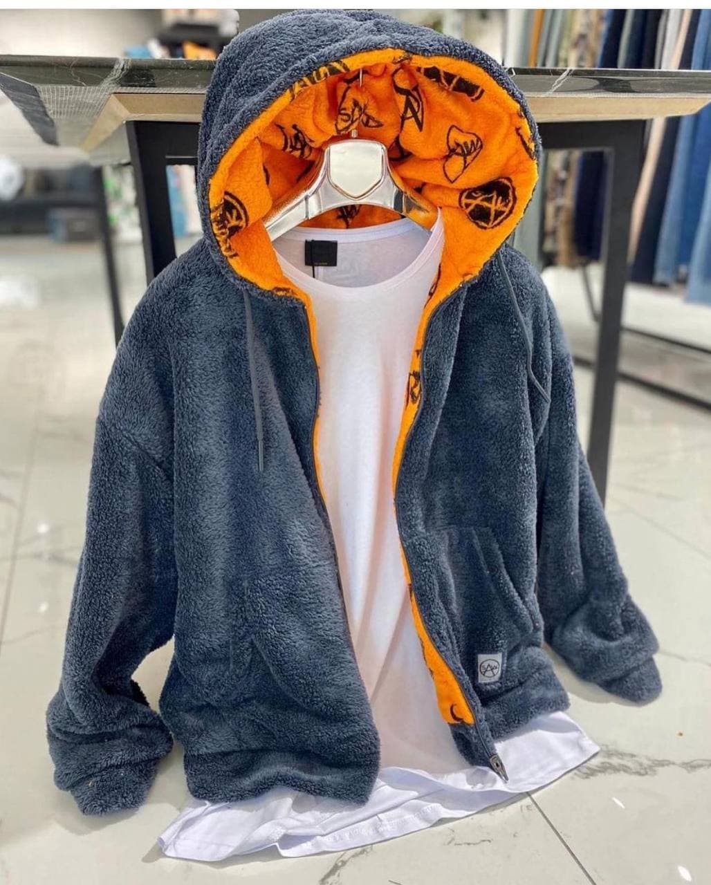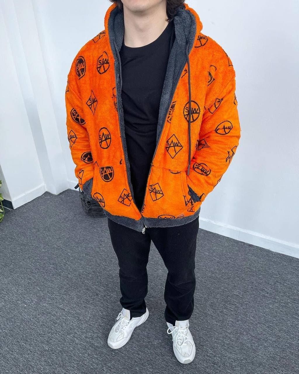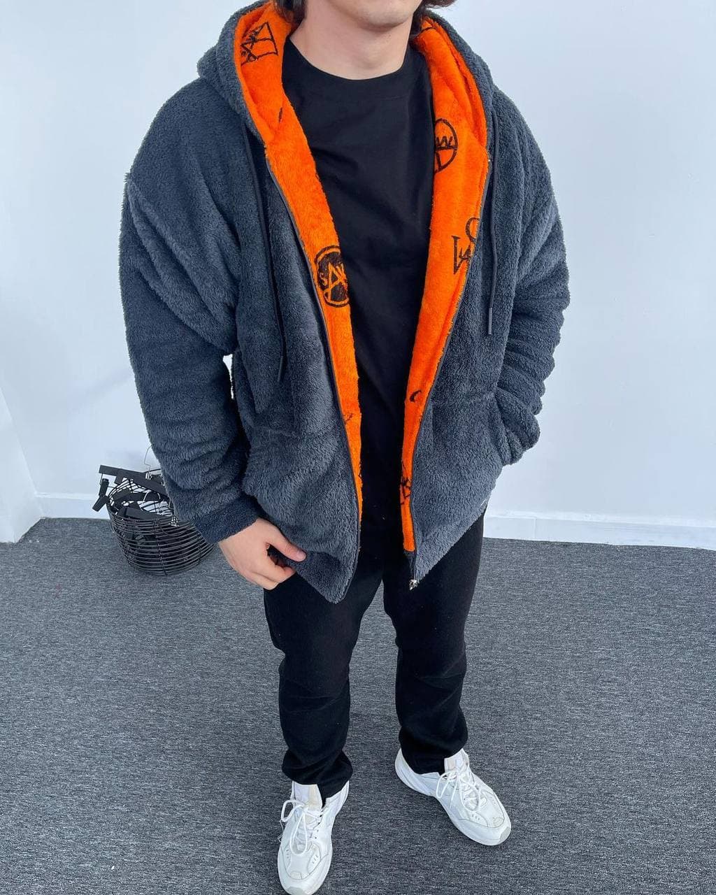 Мужская Двухсторонняя Кофта Оранжевая Серая Плюшевая – с Капюшоном на Молнии