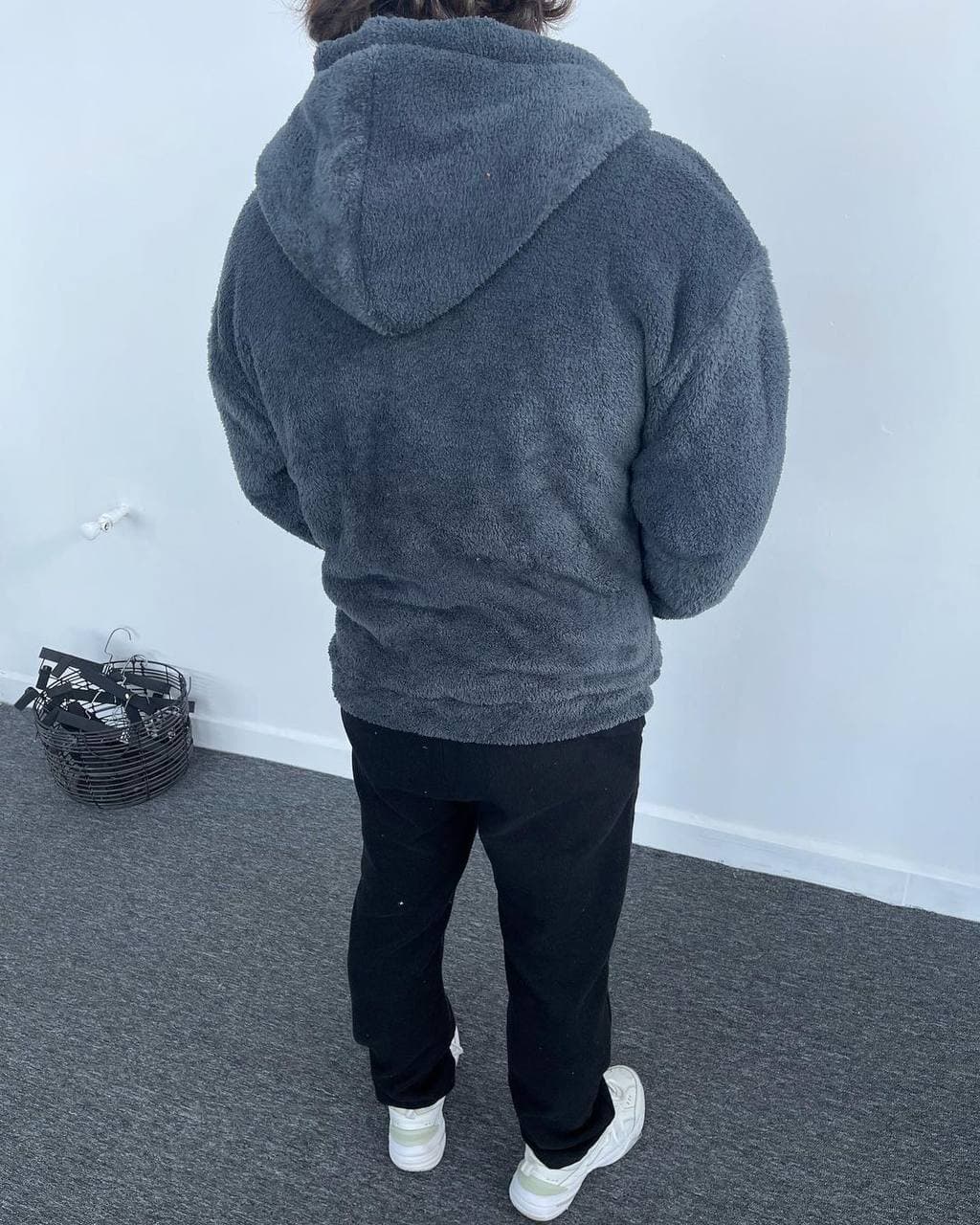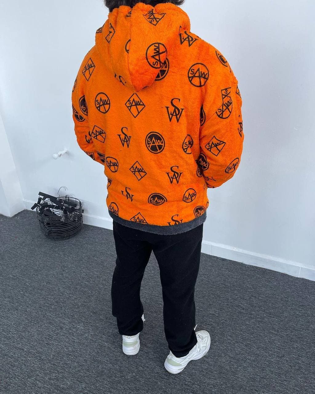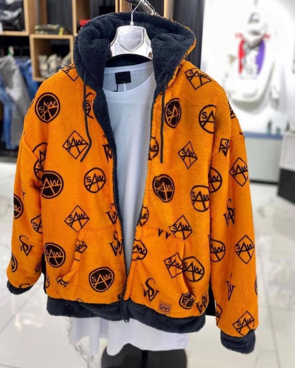 Мужская Двухсторонняя Кофта Оранжевая Серая Плюшевая – с Капюшоном на Молнии