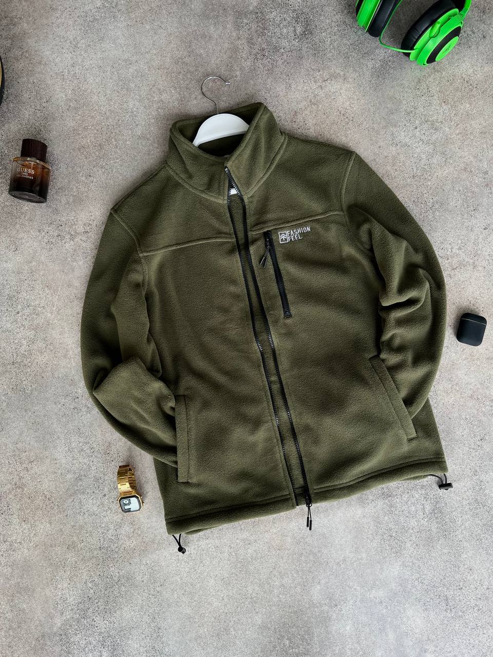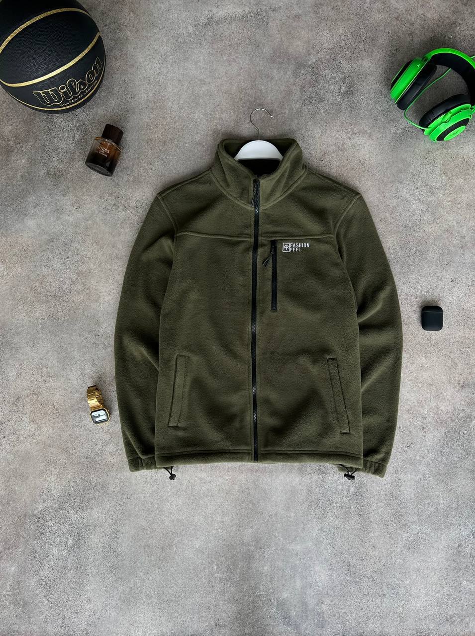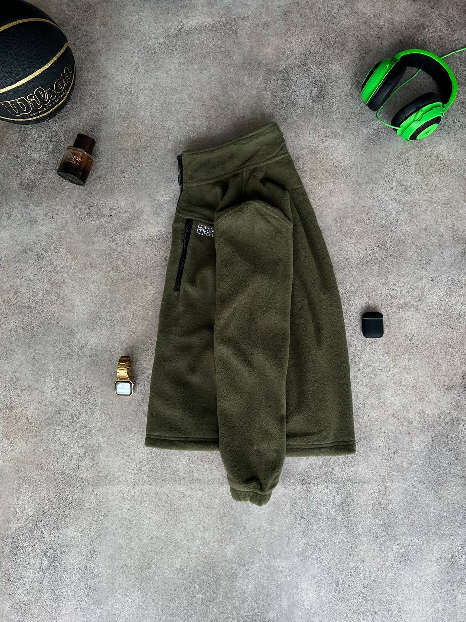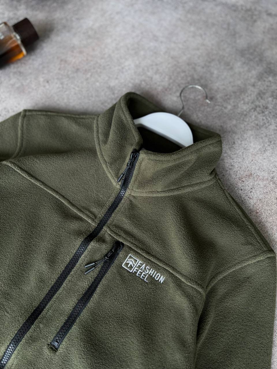 Мужская Теплая Флисовая Кофта Хаки под Горло на Молнии – Флиска с Вышивкой и Фиксаторами