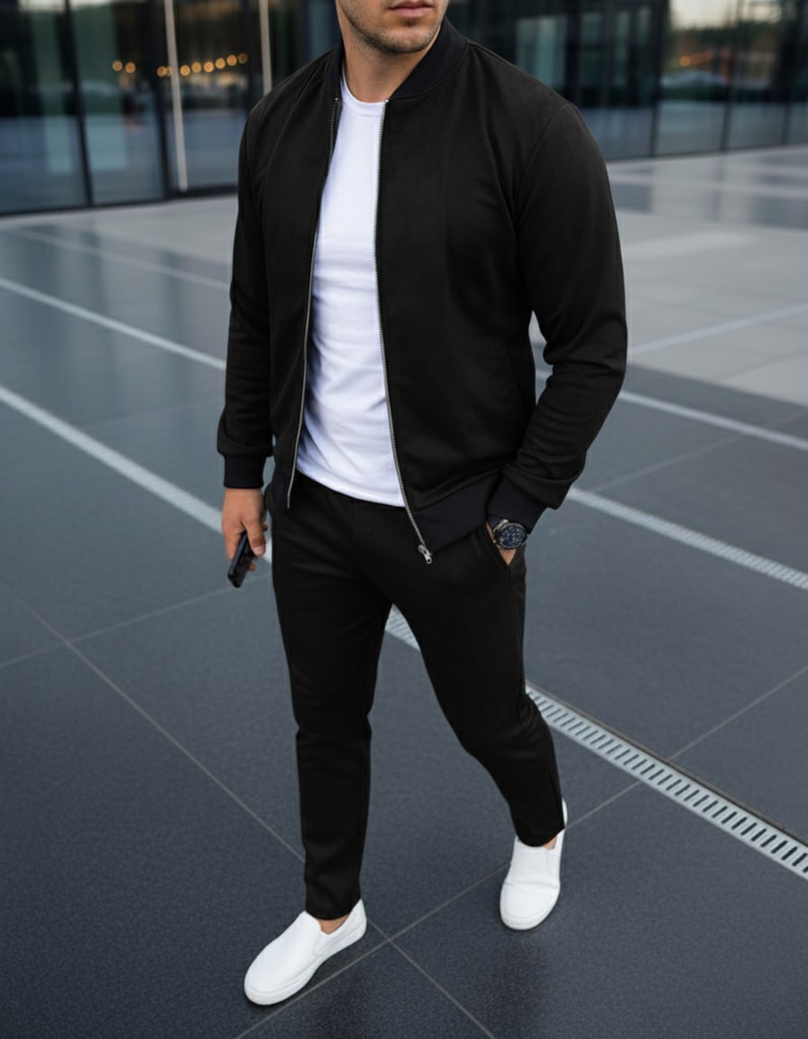 Мужской Базовый Черный Костюм Замша на Молнии – Бомбер + Брюки