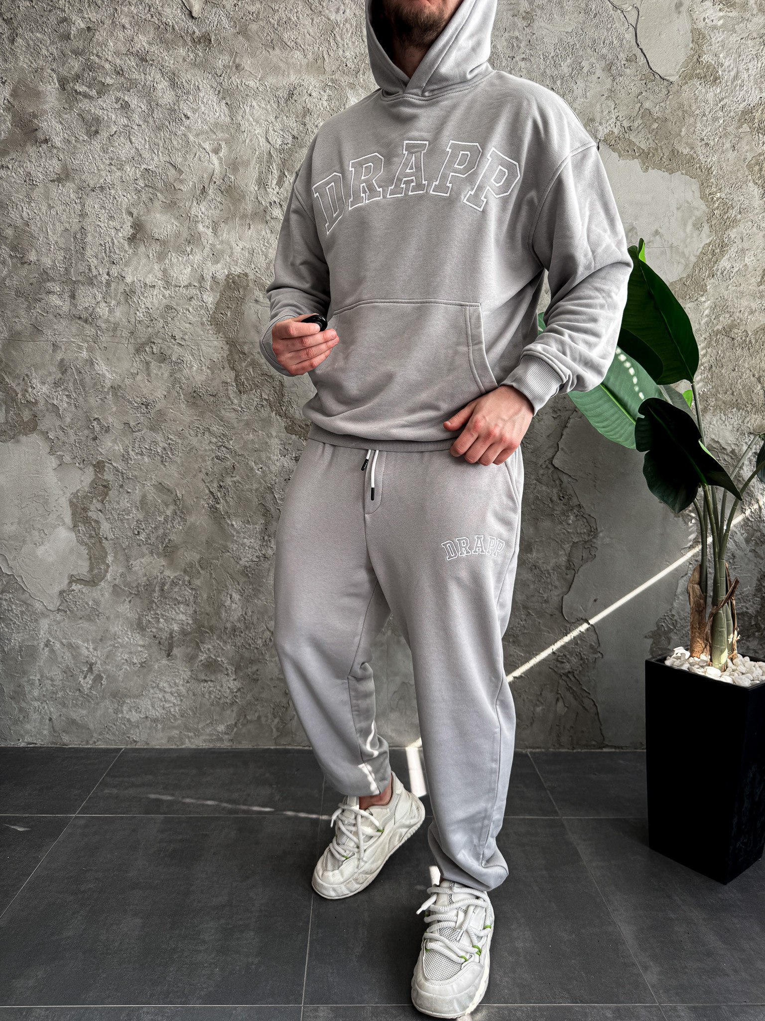 Мужской Базовый Серый Спортивный Костюм Трехнитка Свободного Кроя с Вышивкой