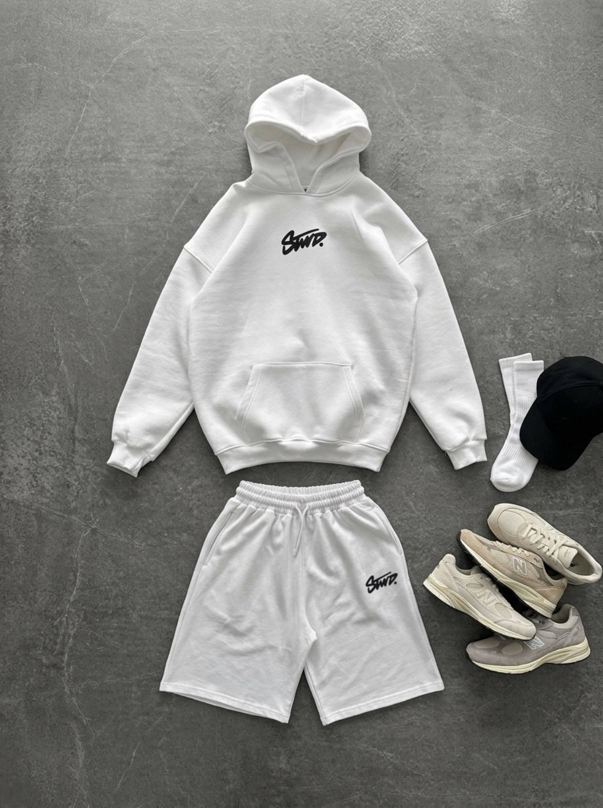 Мужской Белый Костюм Комплект Двойка Оверсайз (Худи + Шорты)