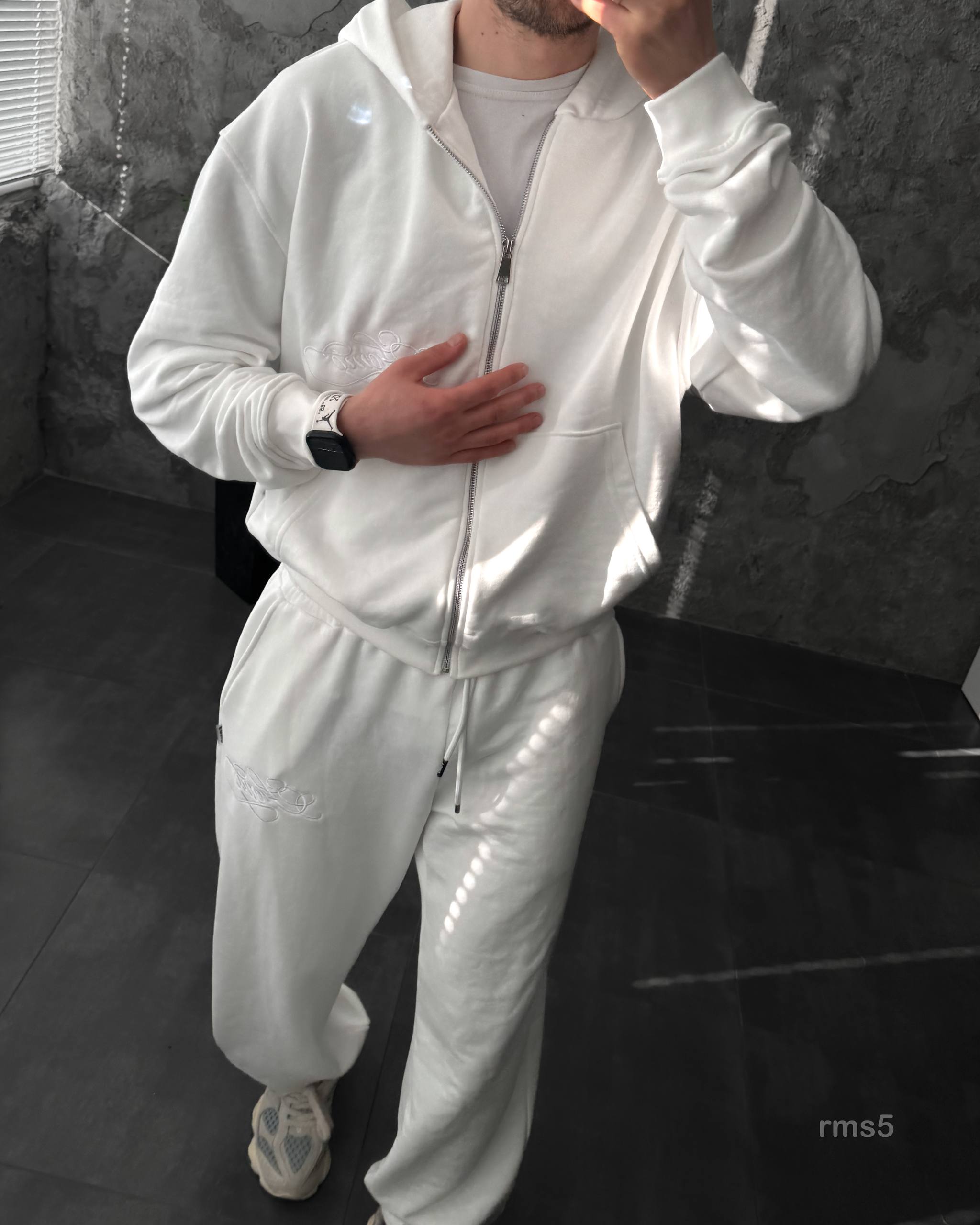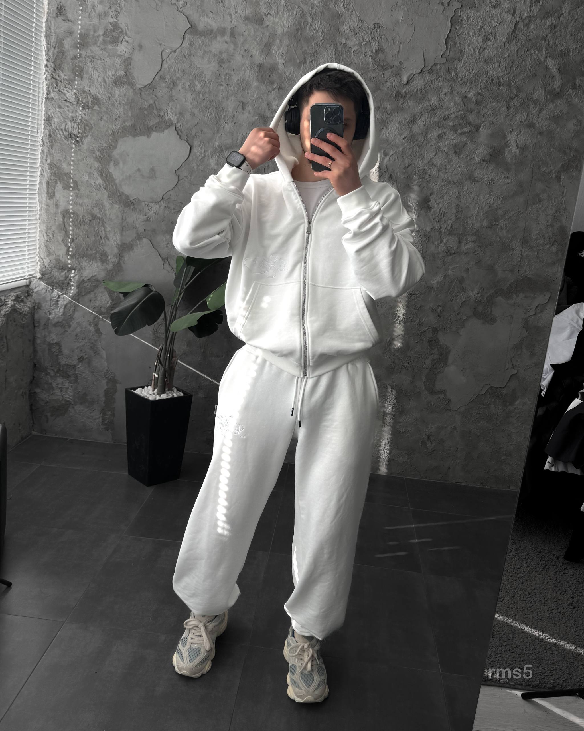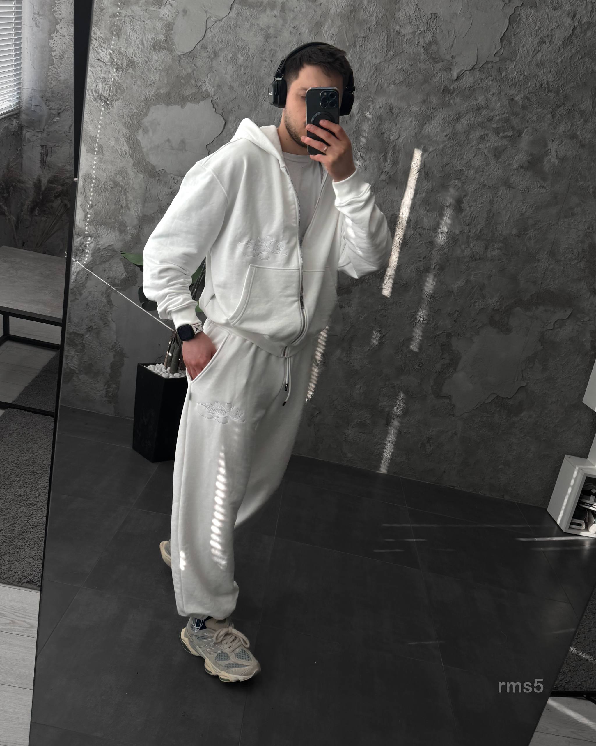 Мужской Белый Спортивный Костюм Оверсайз на Молнии с Вышивками – Трехнитка Петля