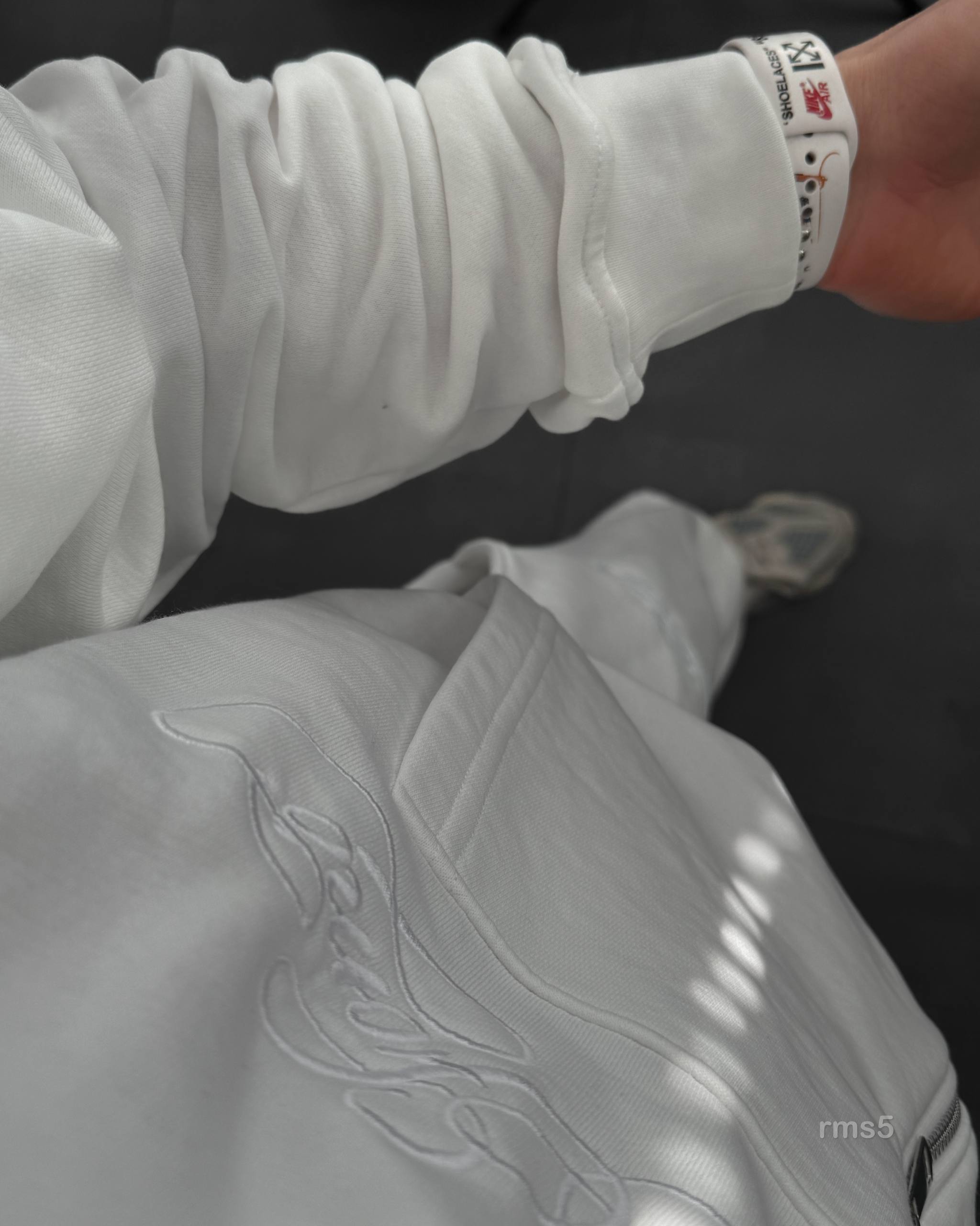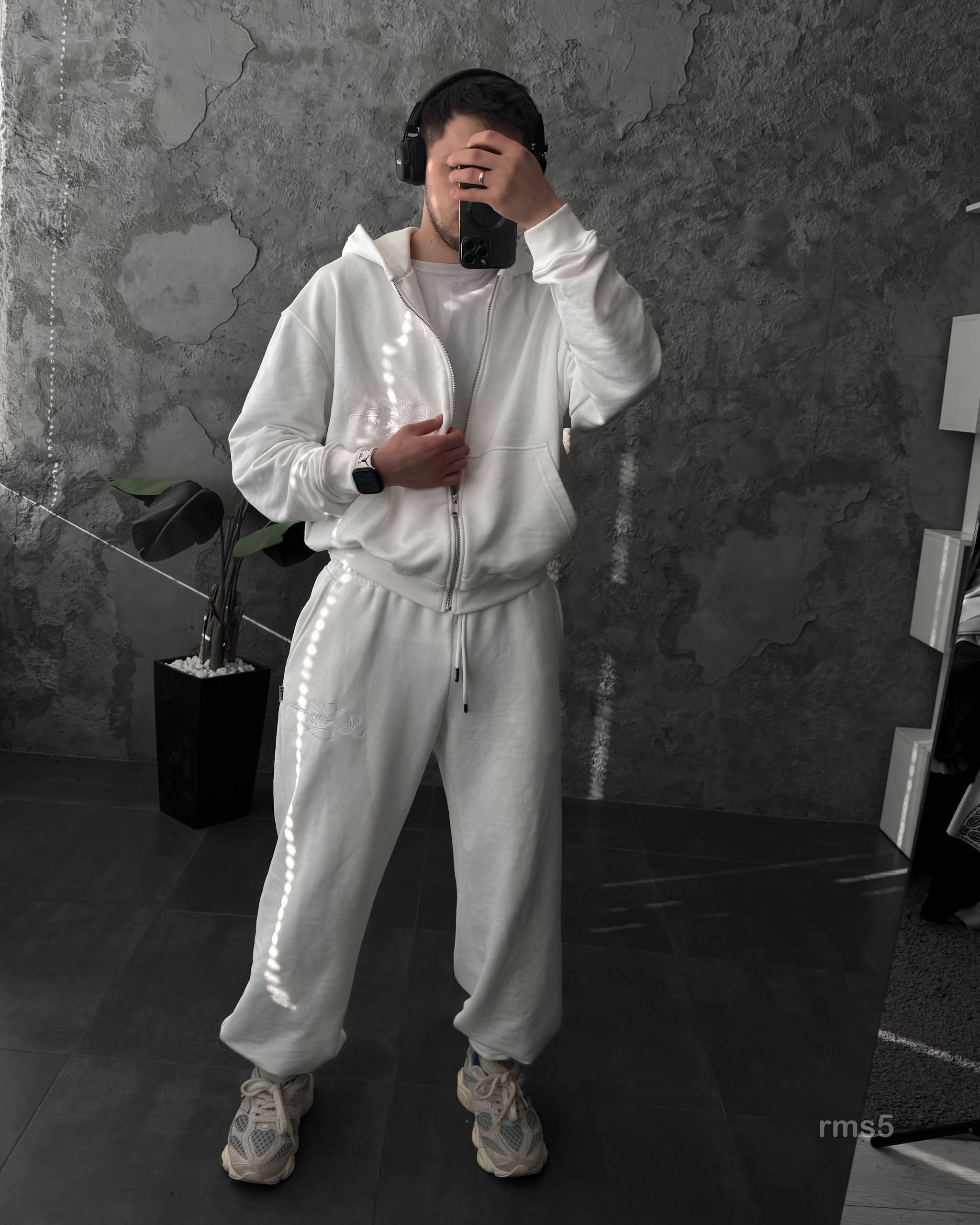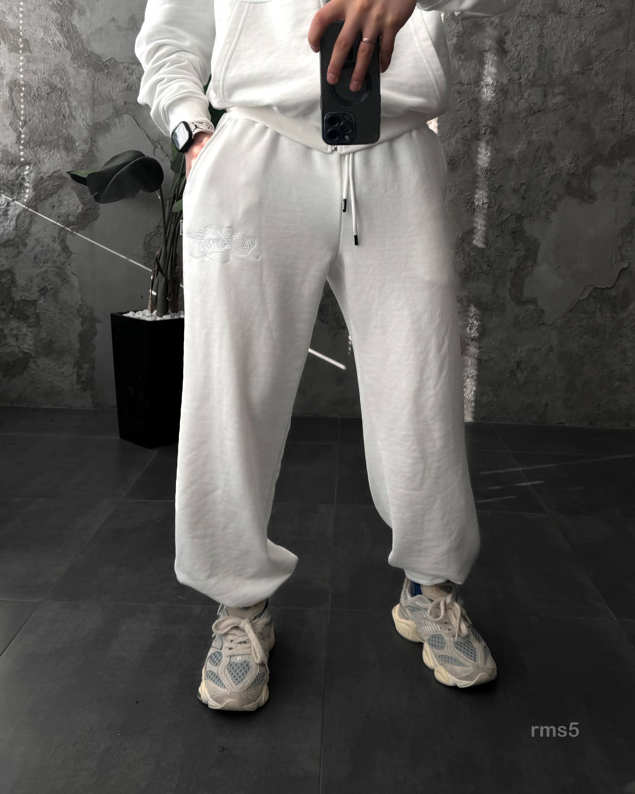 Мужской Белый Спортивный Костюм Оверсайз на Молнии с Вышивками – Трехнитка Петля