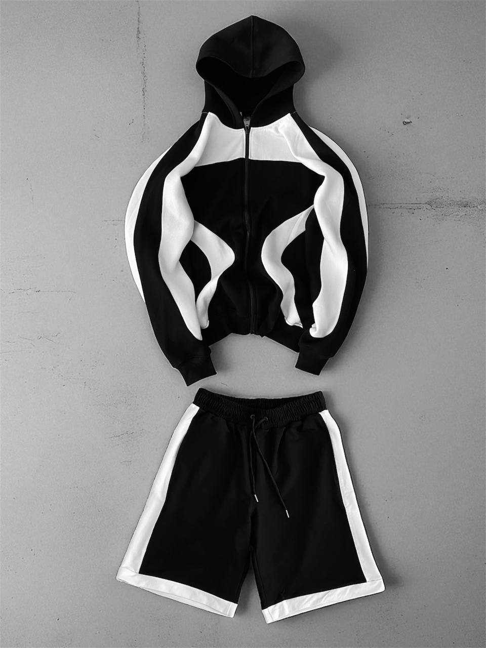 Мужской Черно-Белый Костюм на Молнии с Капюшоном – Худи Зипка + Шорты
