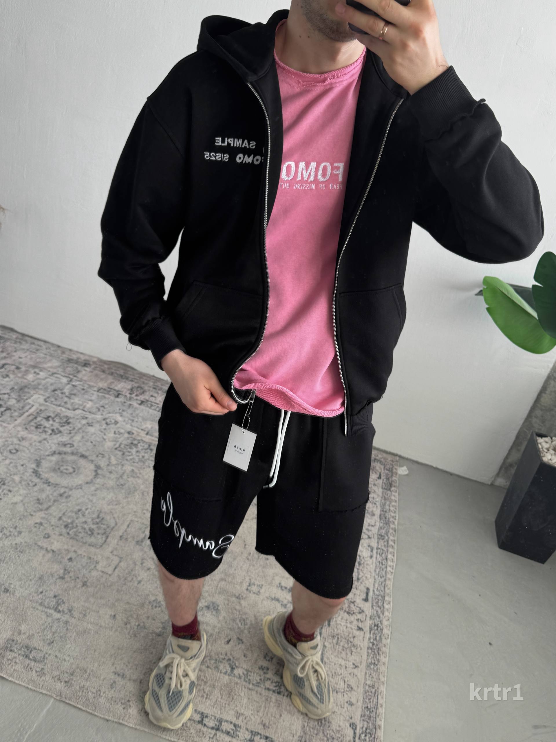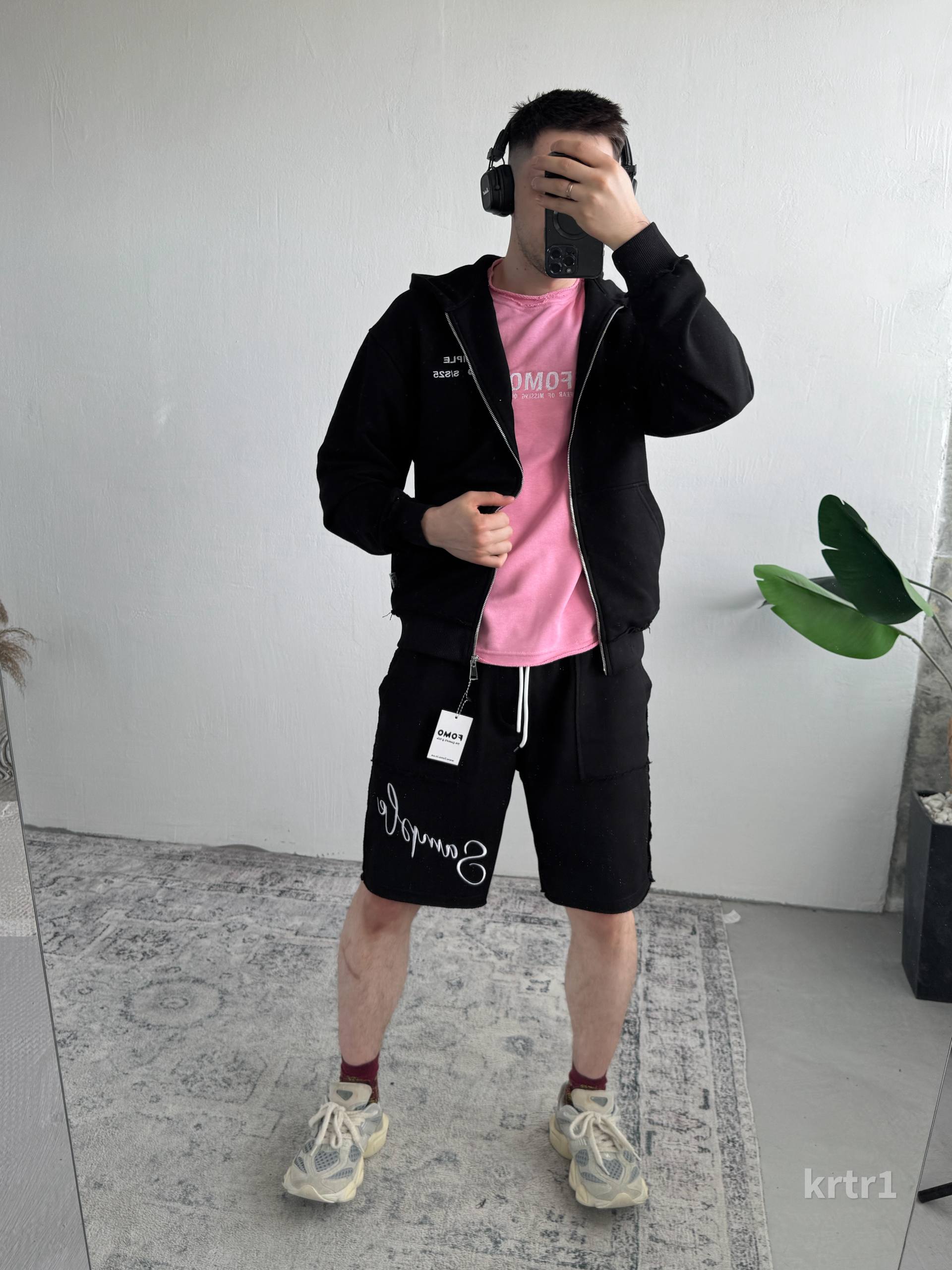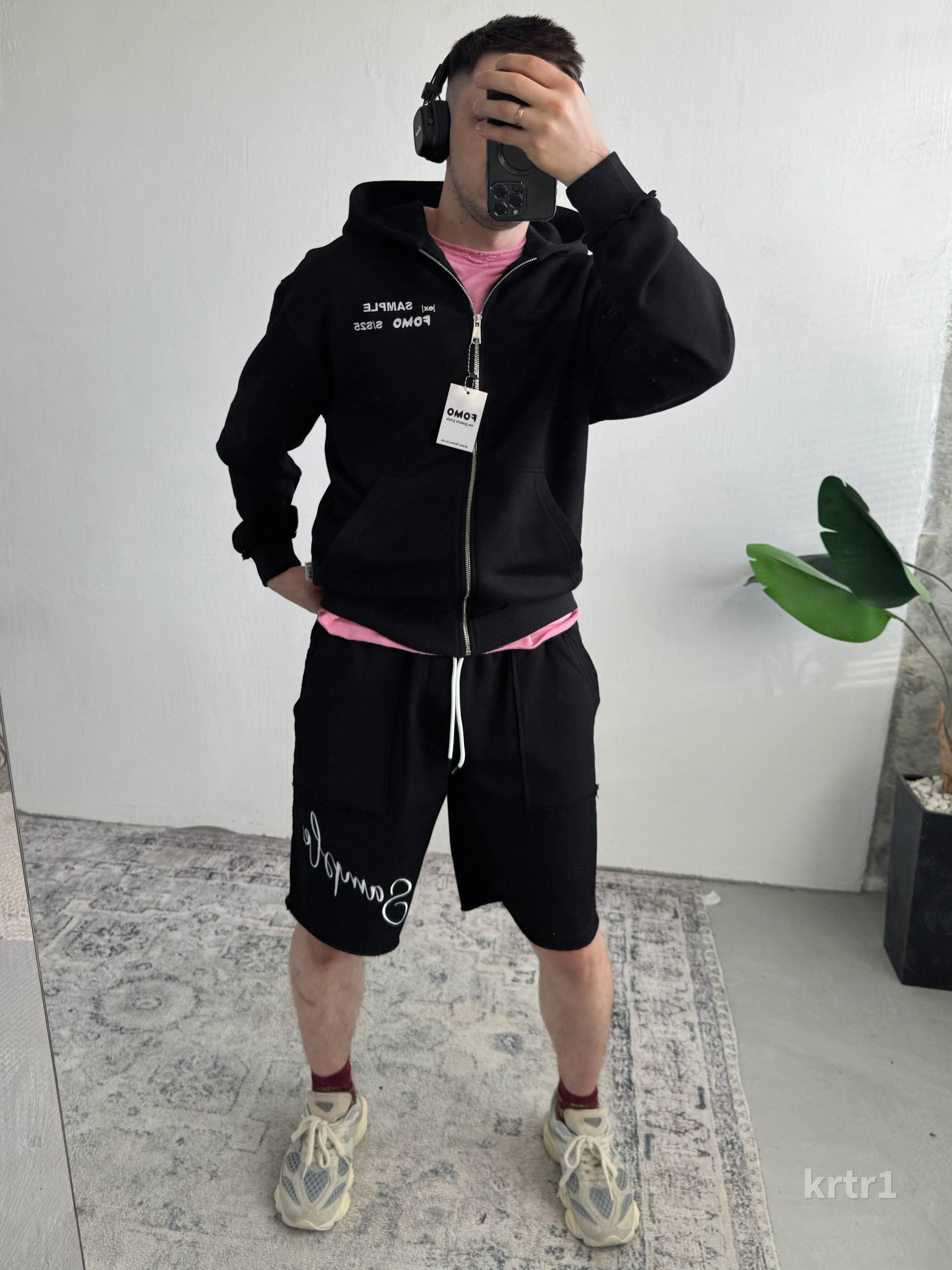 Мужской Черный Костюм на Молнии с Обрезаными Краями – Комплект Зип Худи и Шорты