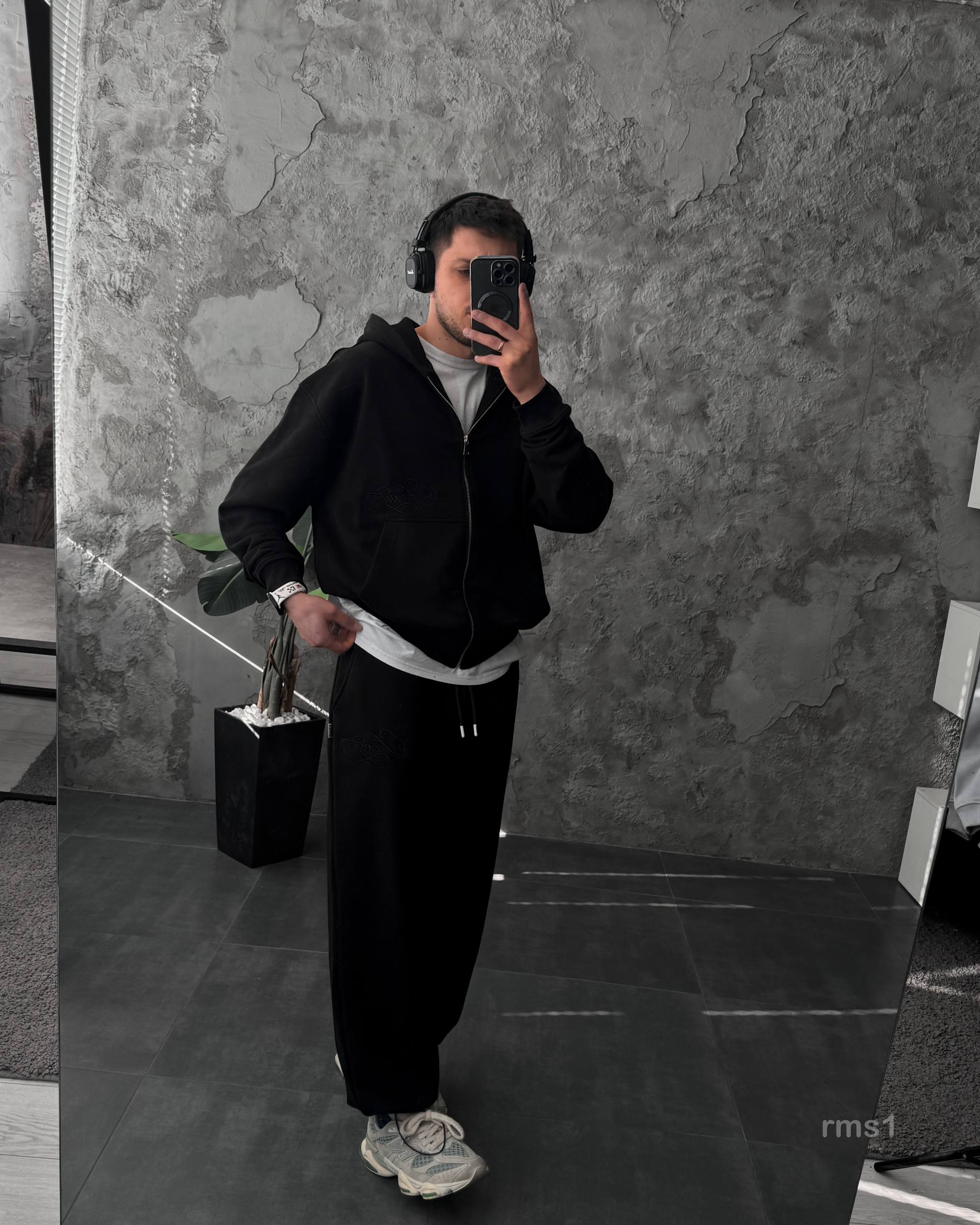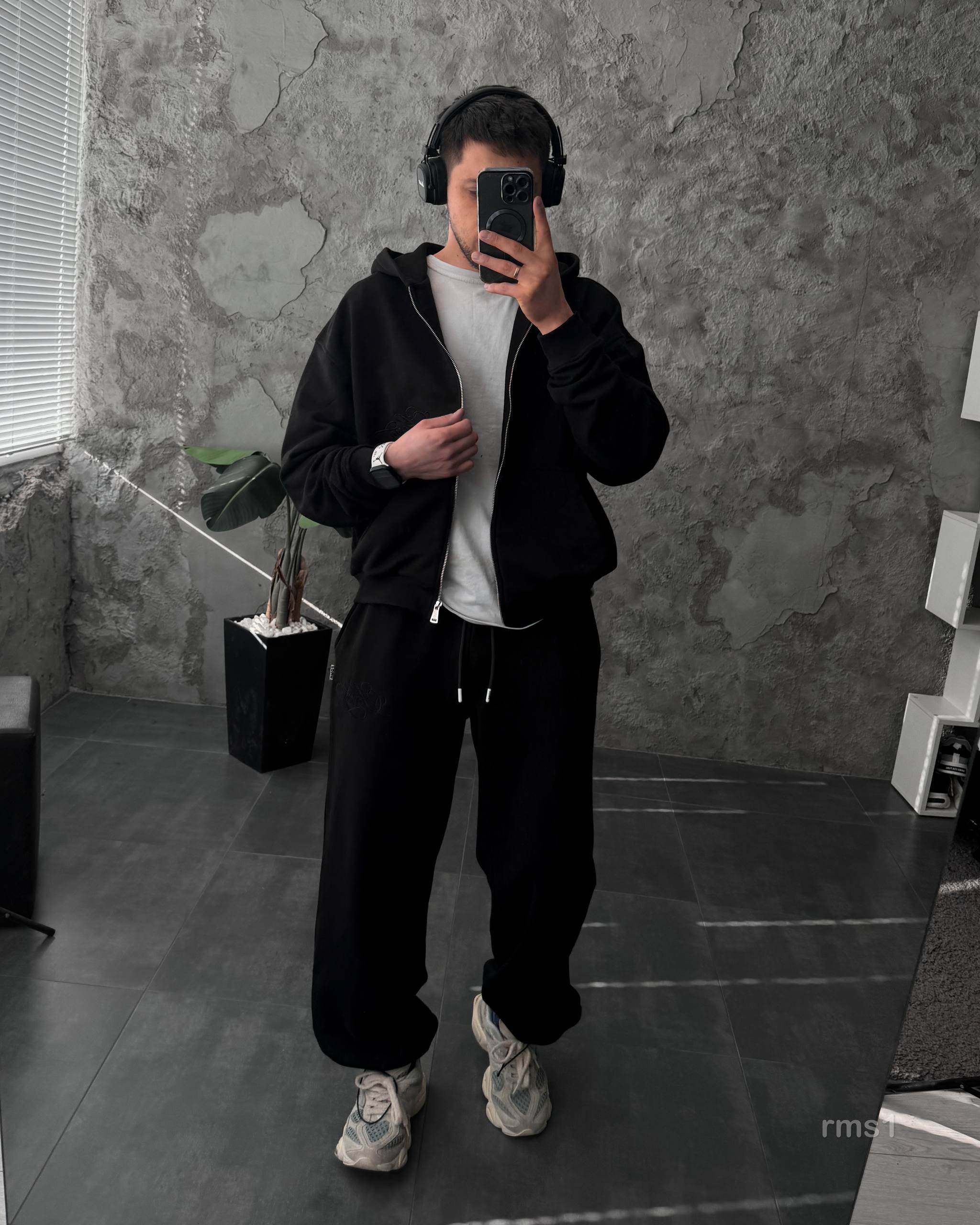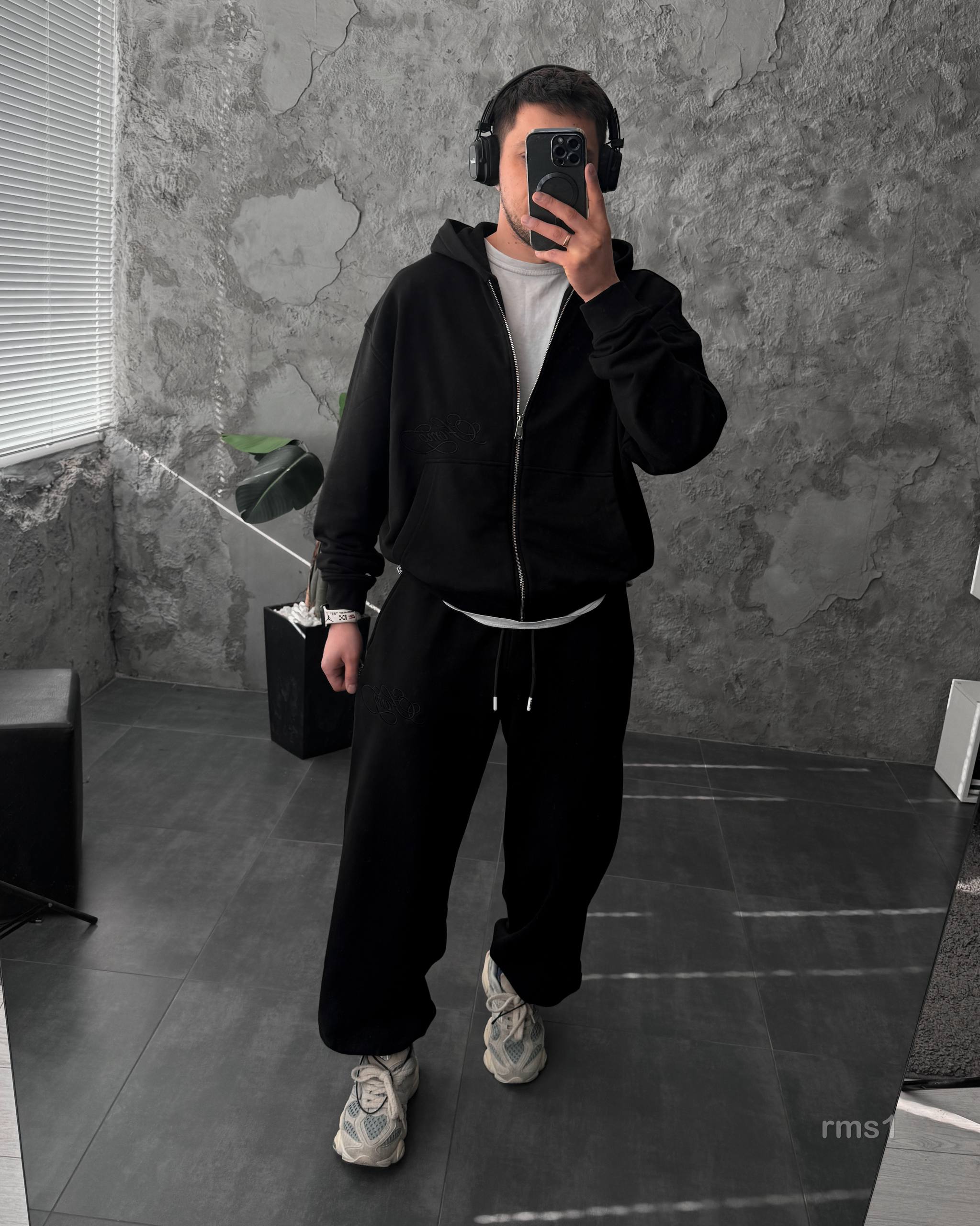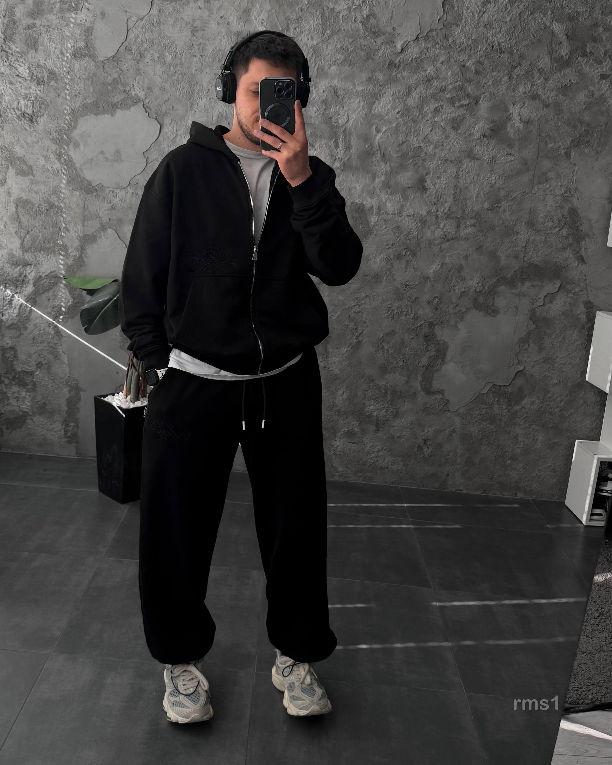 Мужской Черный Спортивный Костюм Оверсайз на Молнии с Вышивками – Трехнитка Петля