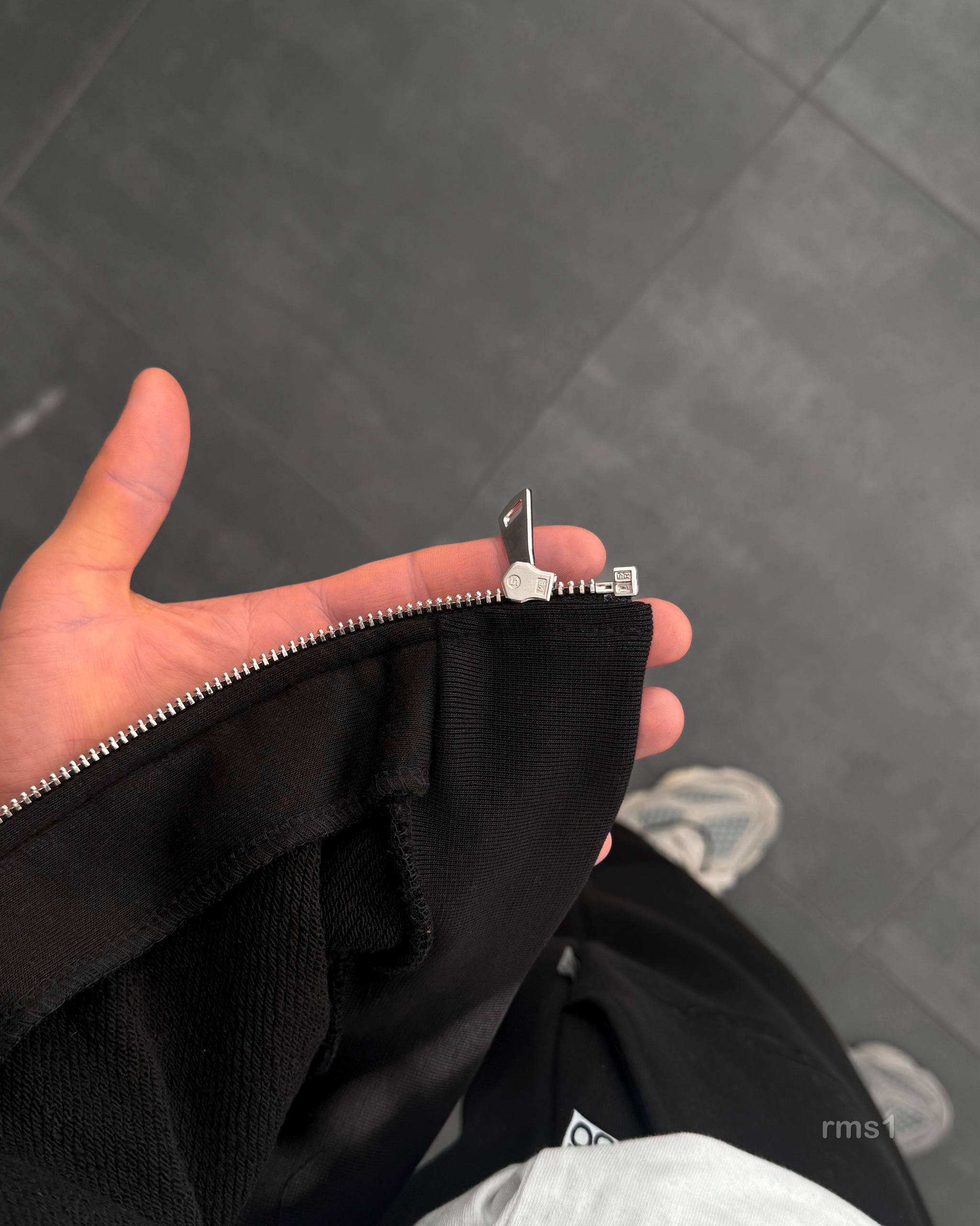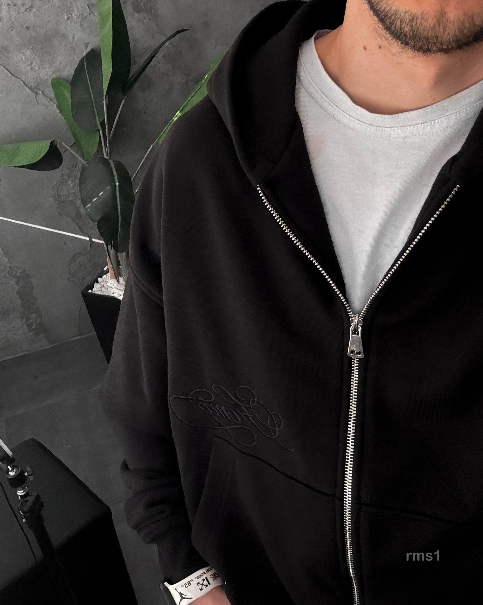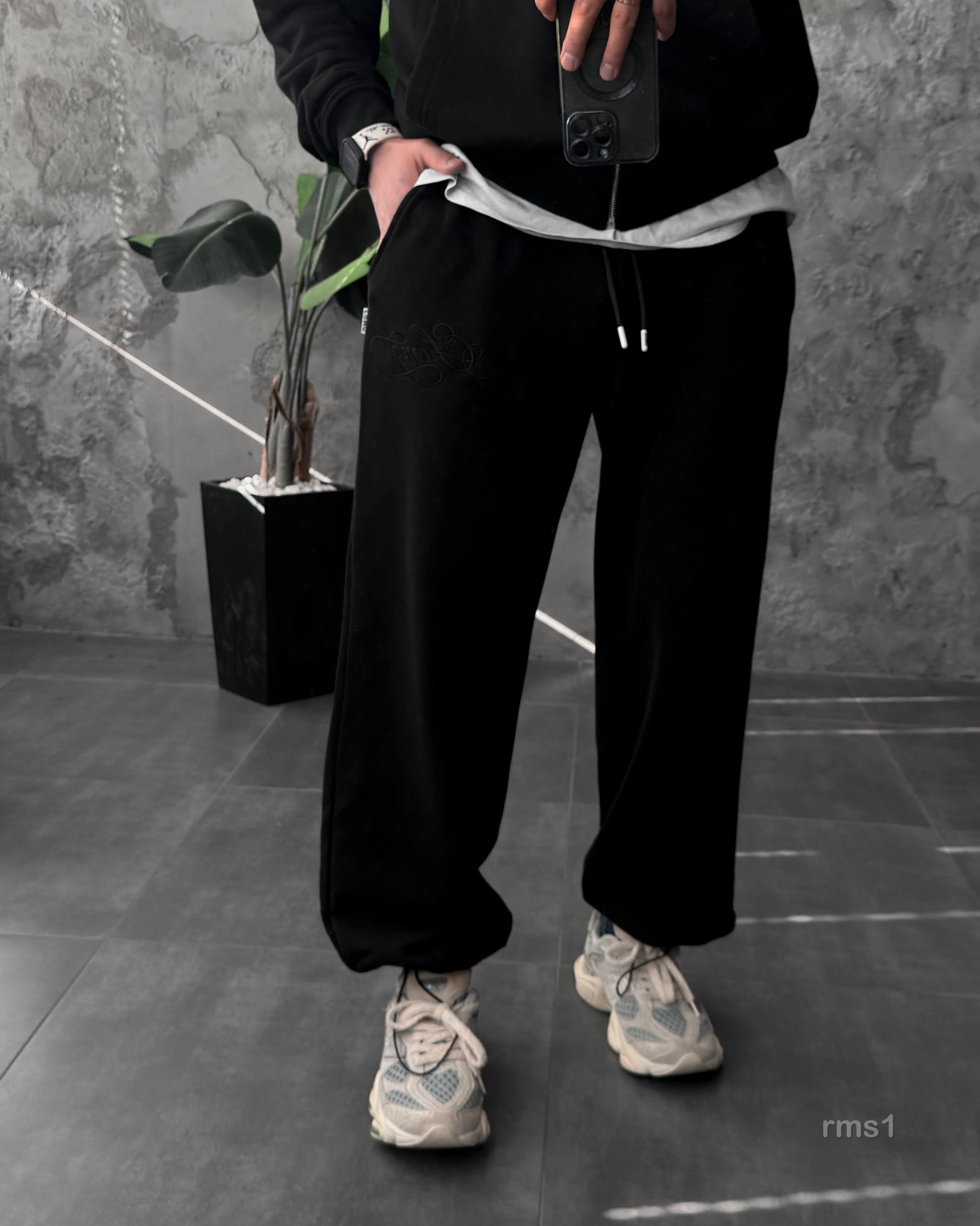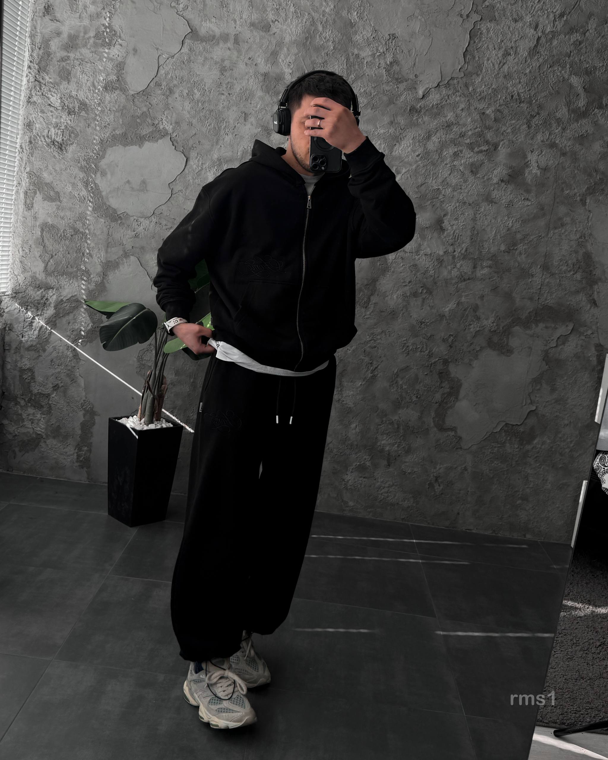 Мужской Черный Спортивный Костюм Оверсайз на Молнии с Вышивками – Трехнитка Петля