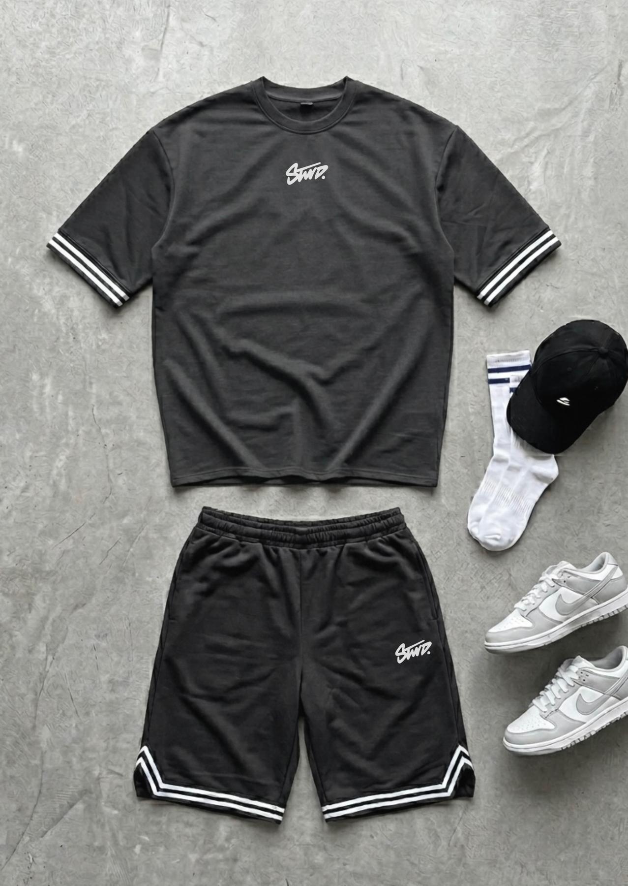 Мужской Графитовый Костюм Футболка Шорты – Базовый Оверсайз с Окантовкой