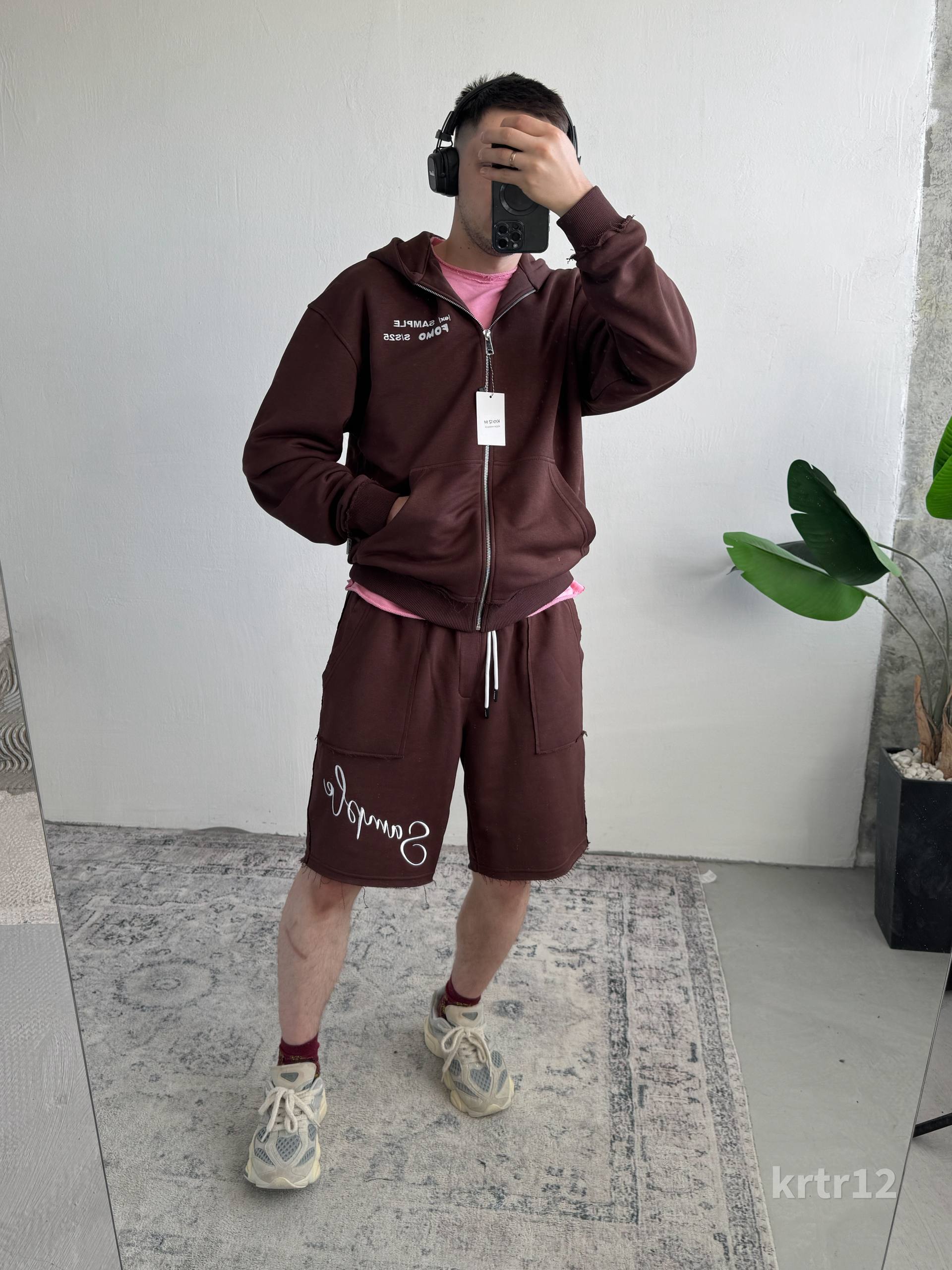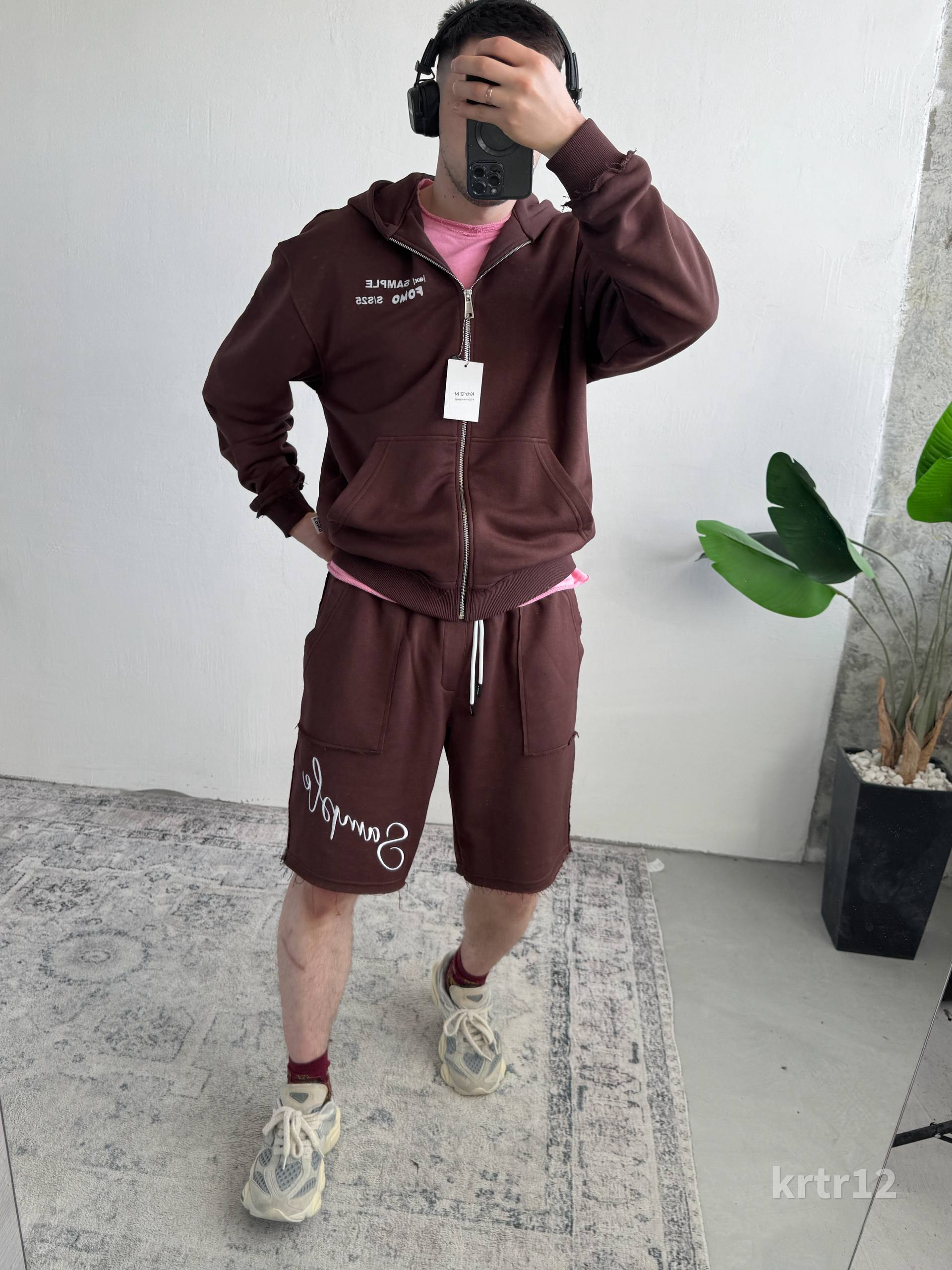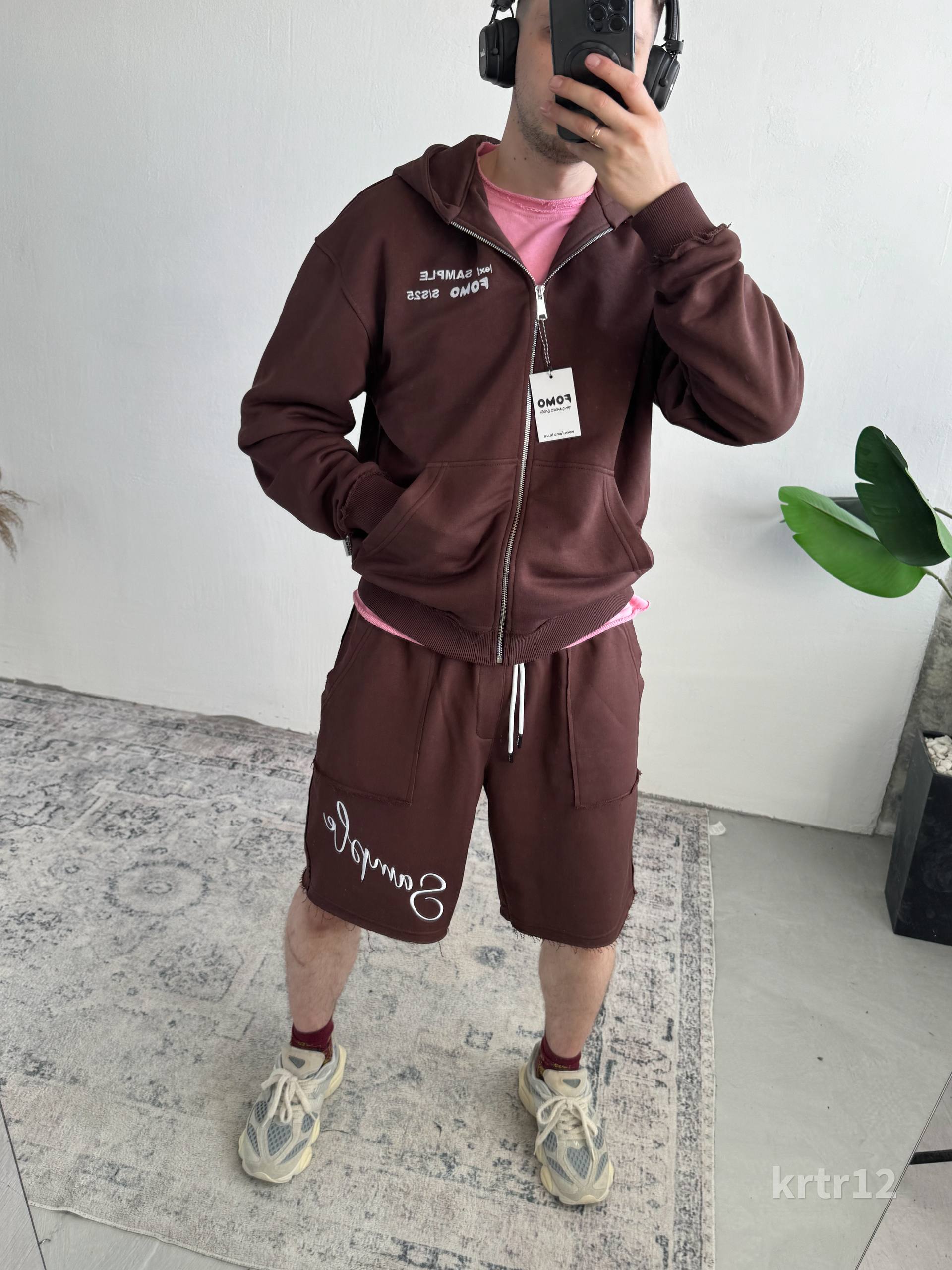 Мужской Коричневый Костюм на Молнии с Обрезаными Краями – Комплект Зип Худи и Шорты