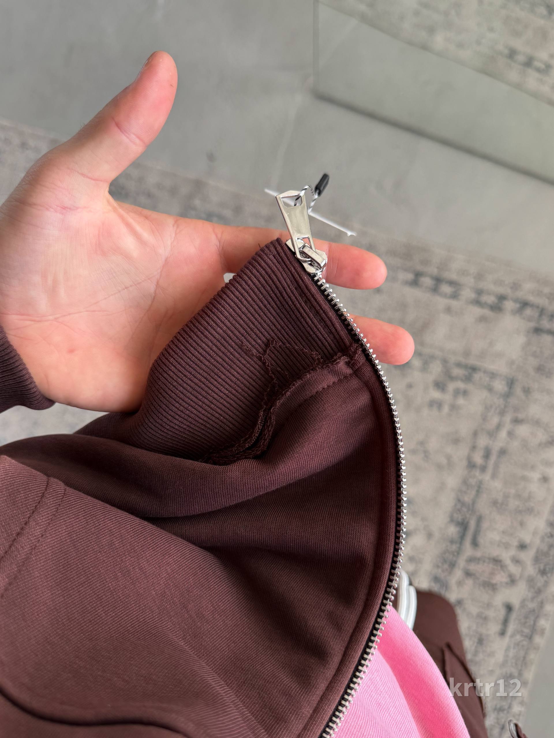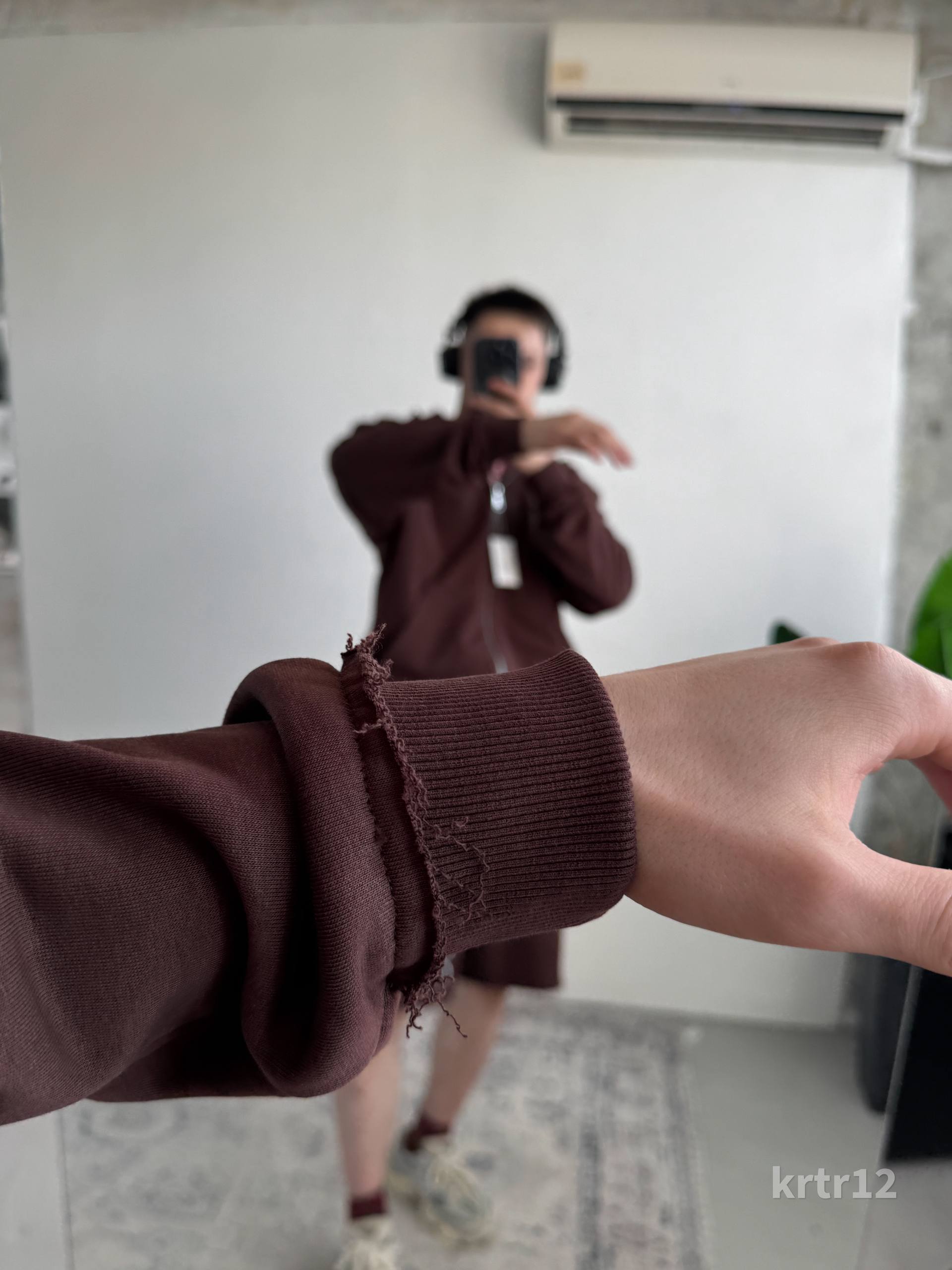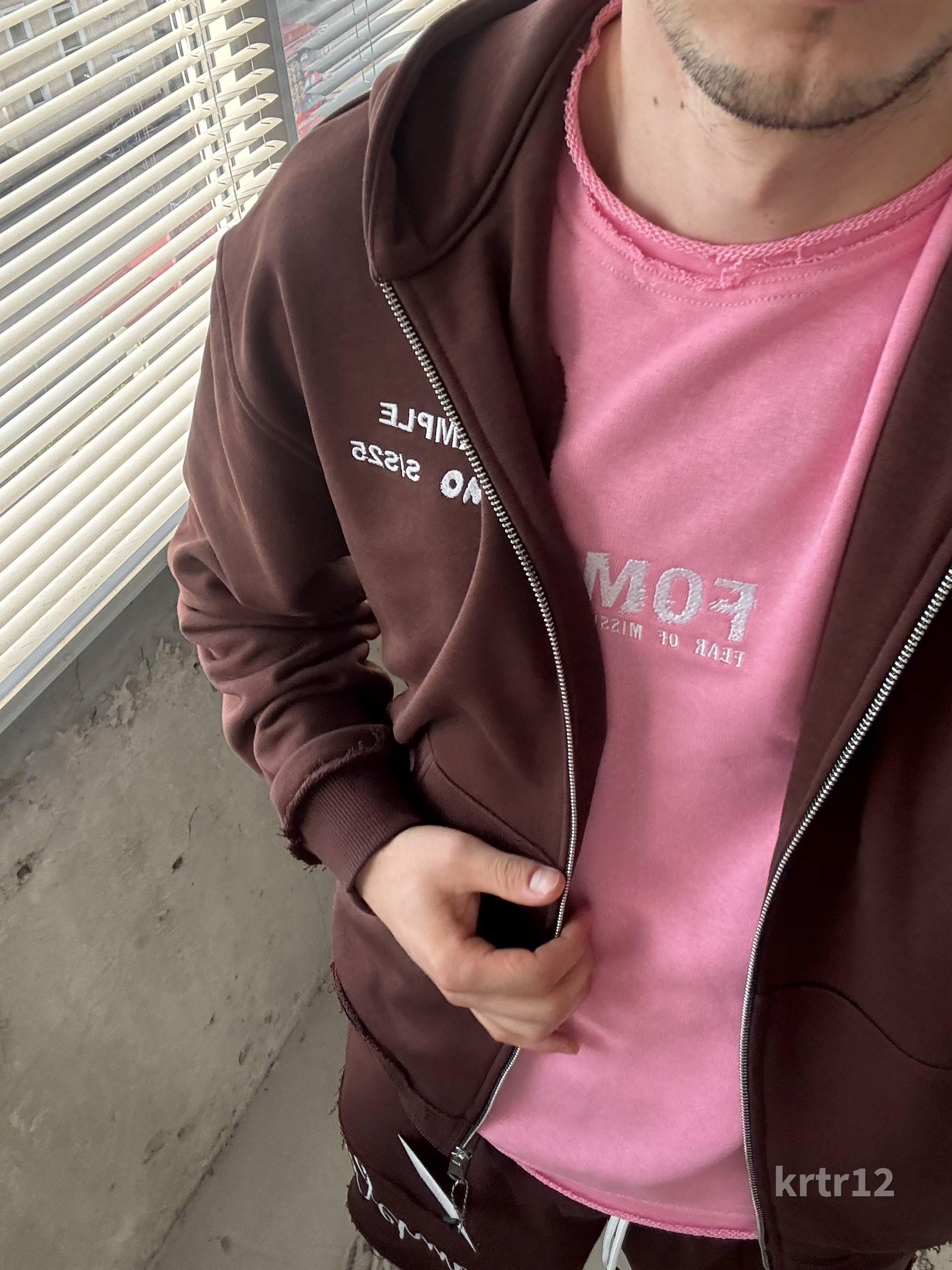 Мужской Коричневый Костюм на Молнии с Обрезаными Краями – Комплект Зип Худи и Шорты