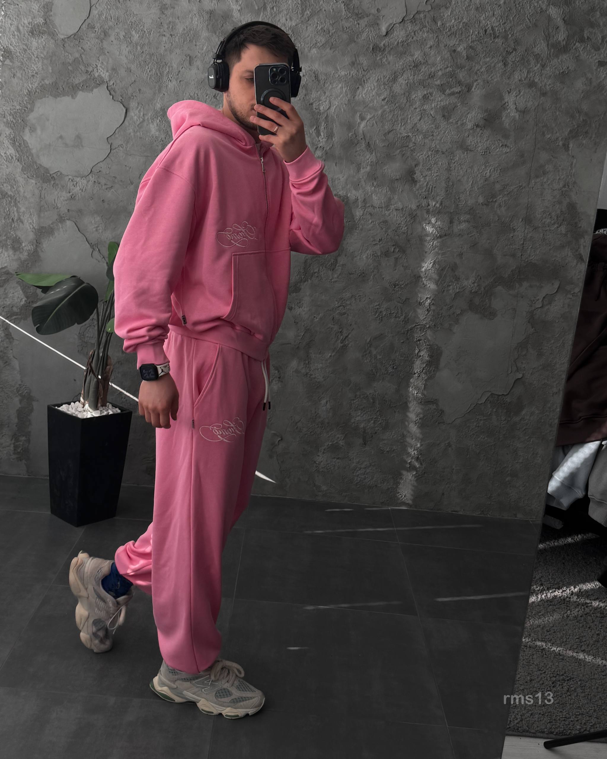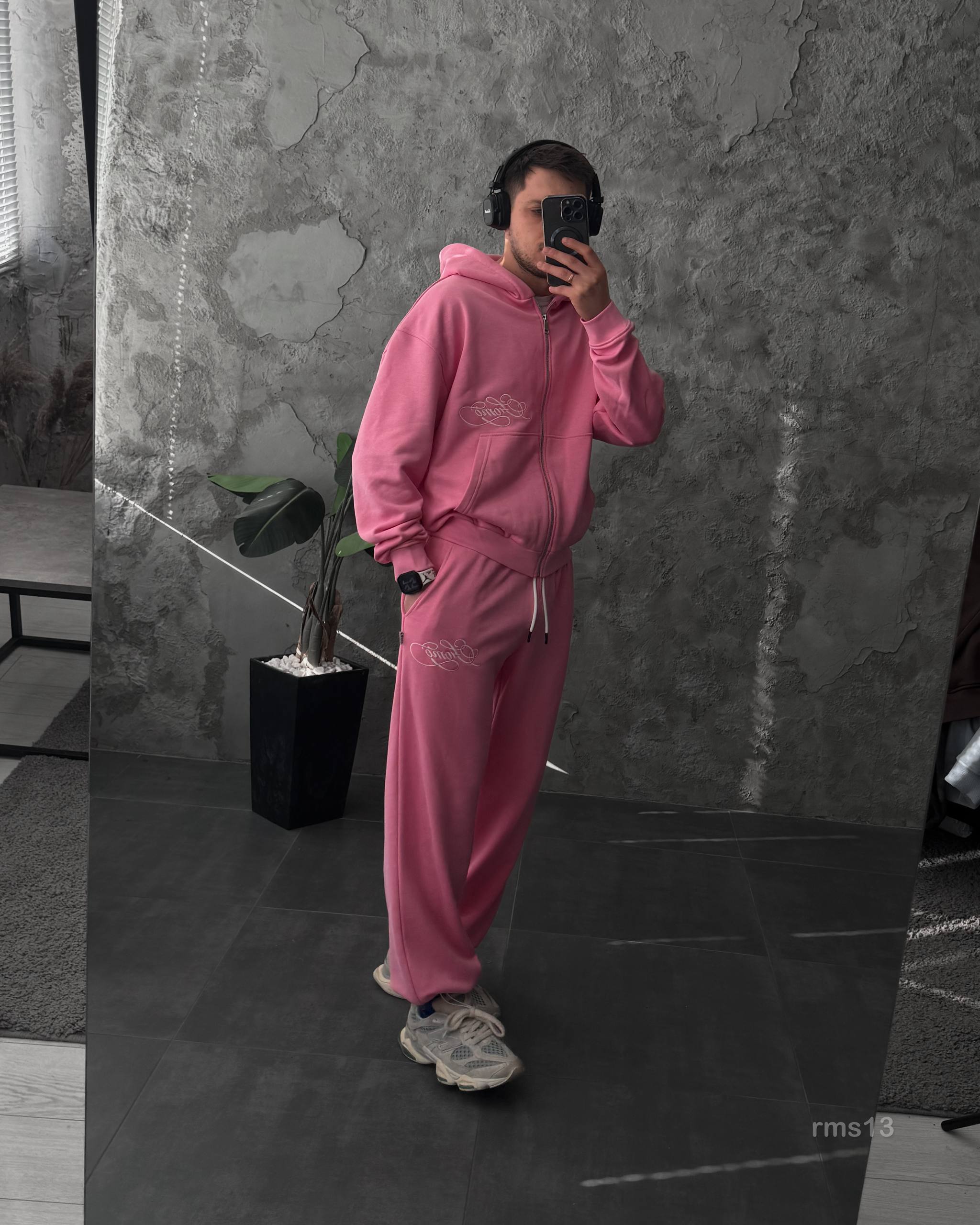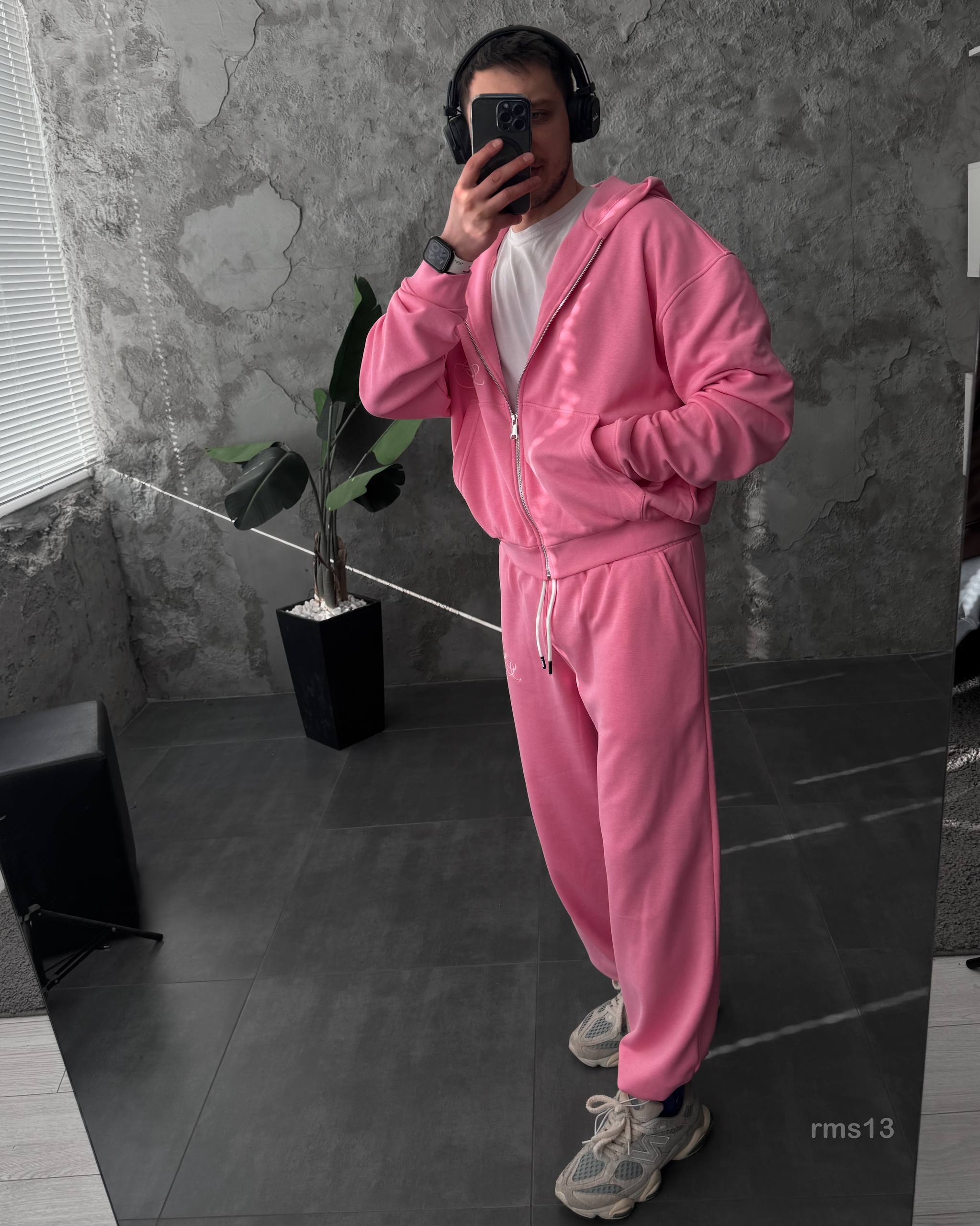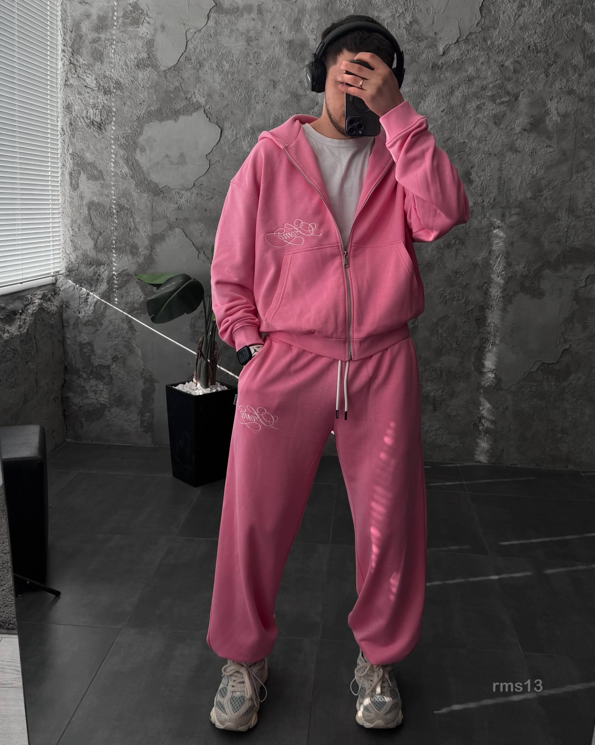Мужской Розовый Спортивный Костюм Оверсайз на Молнии с Вышивками – Трехнитка Петля