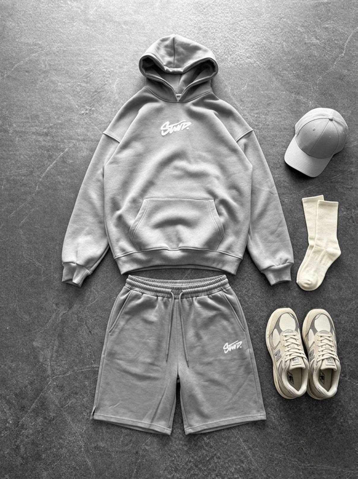 Мужской Серый Костюм Комплект Двойка Оверсайз (Худи + Шорты)