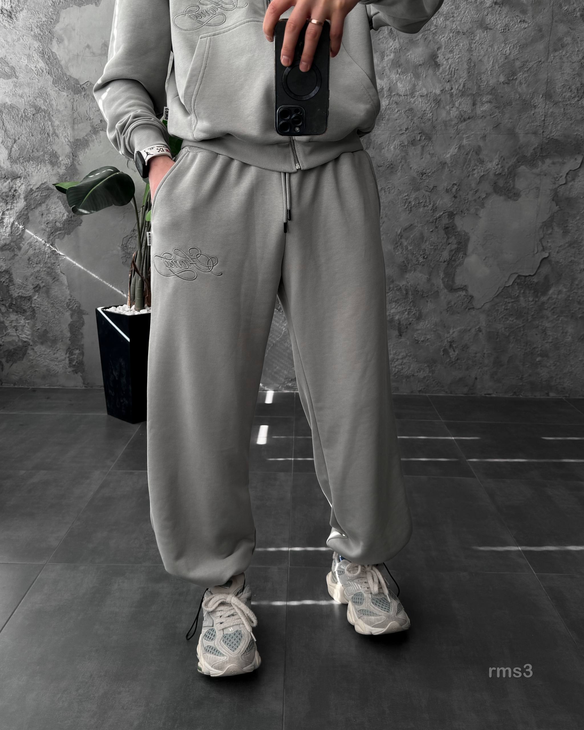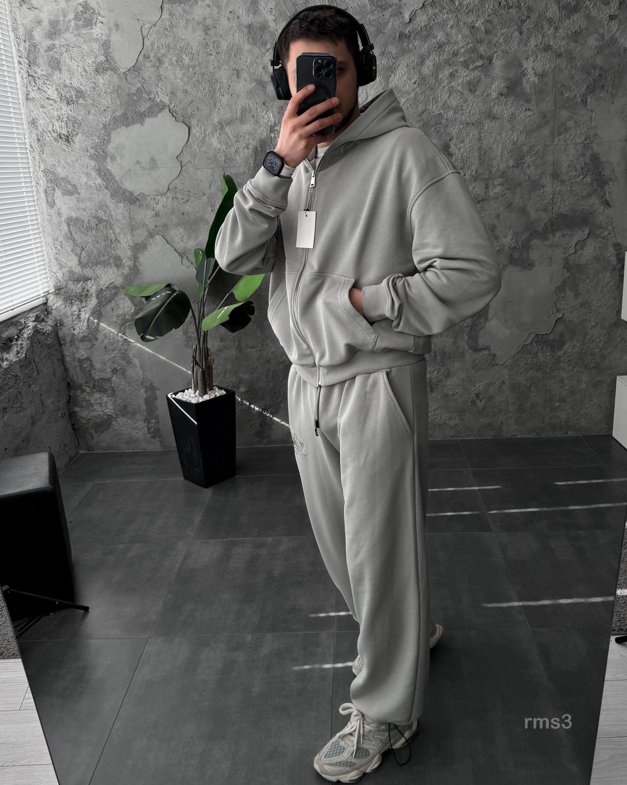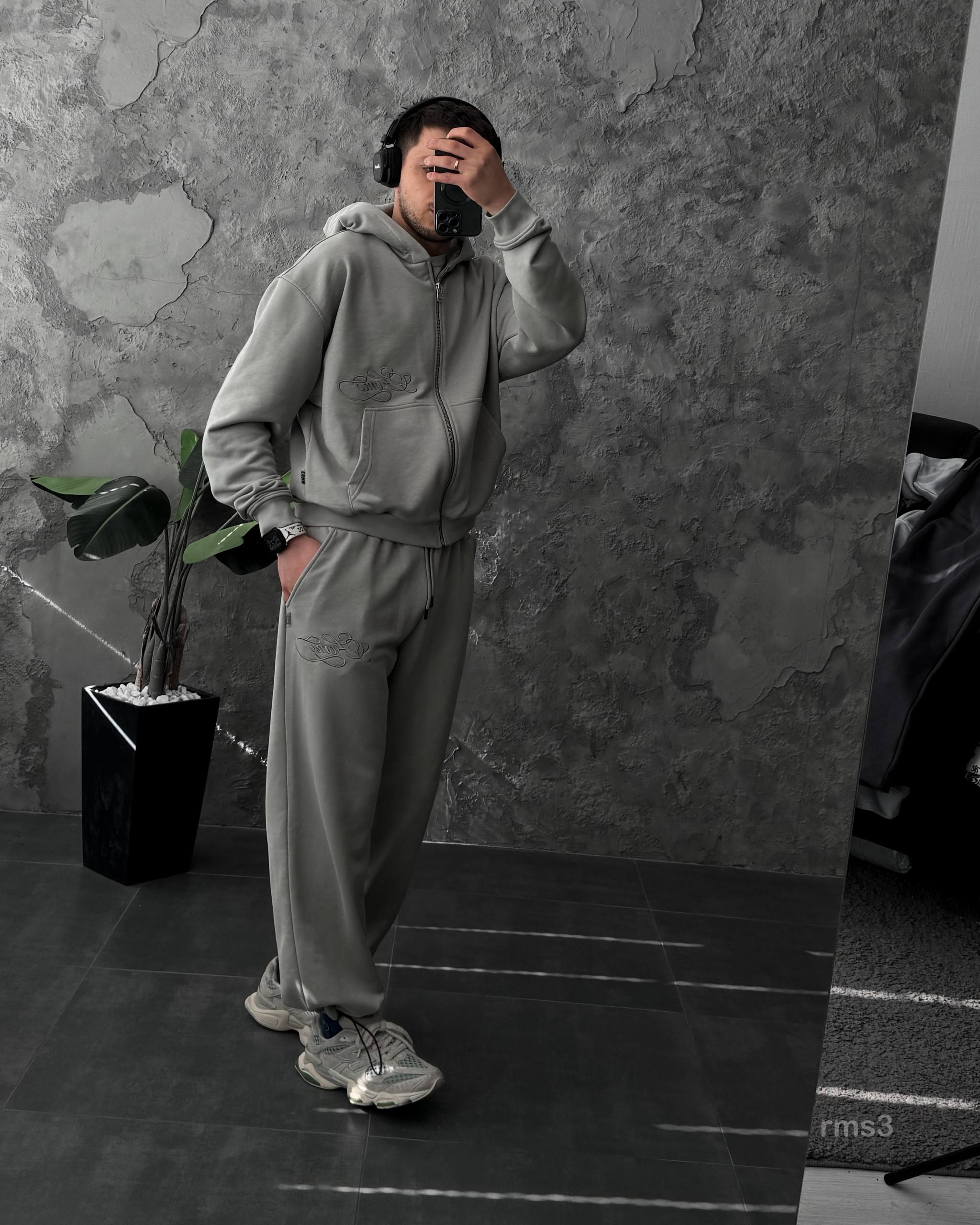 Мужской Серый Спортивный Костюм Оверсайз на Молнии с Вышивками – Трехнитка Петля