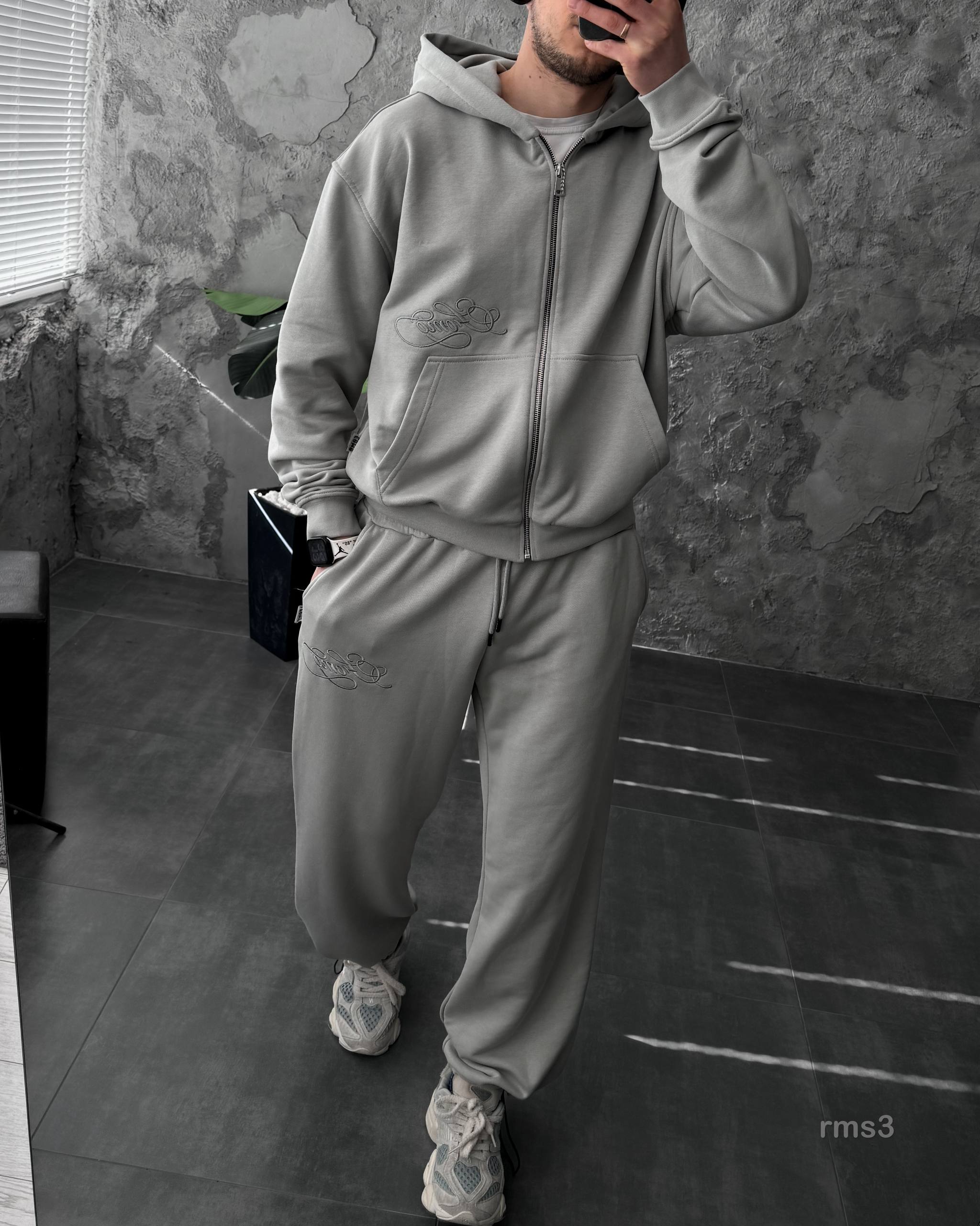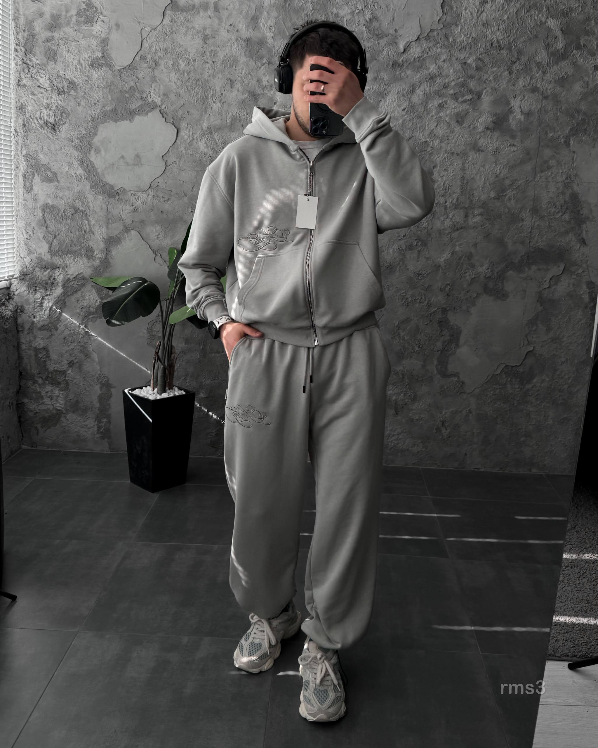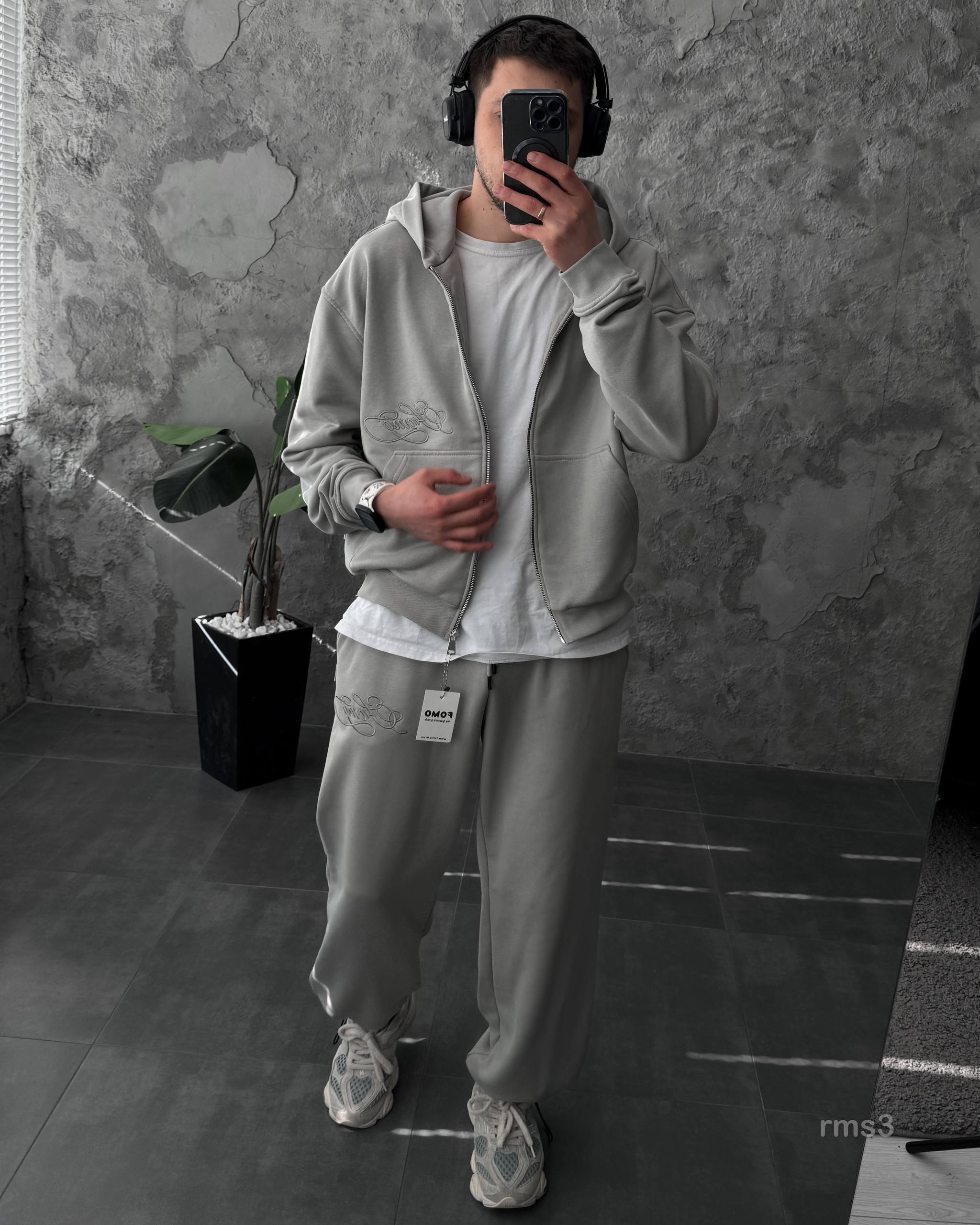 Мужской Серый Спортивный Костюм Оверсайз на Молнии с Вышивками – Трехнитка Петля