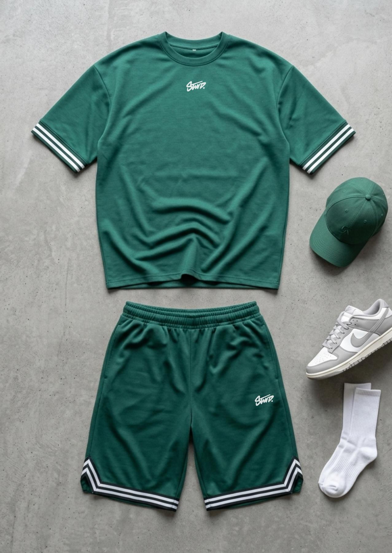 Мужской Зеленый Костюм Футболка Шорты – Базовый Оверсайз с Окантовкой