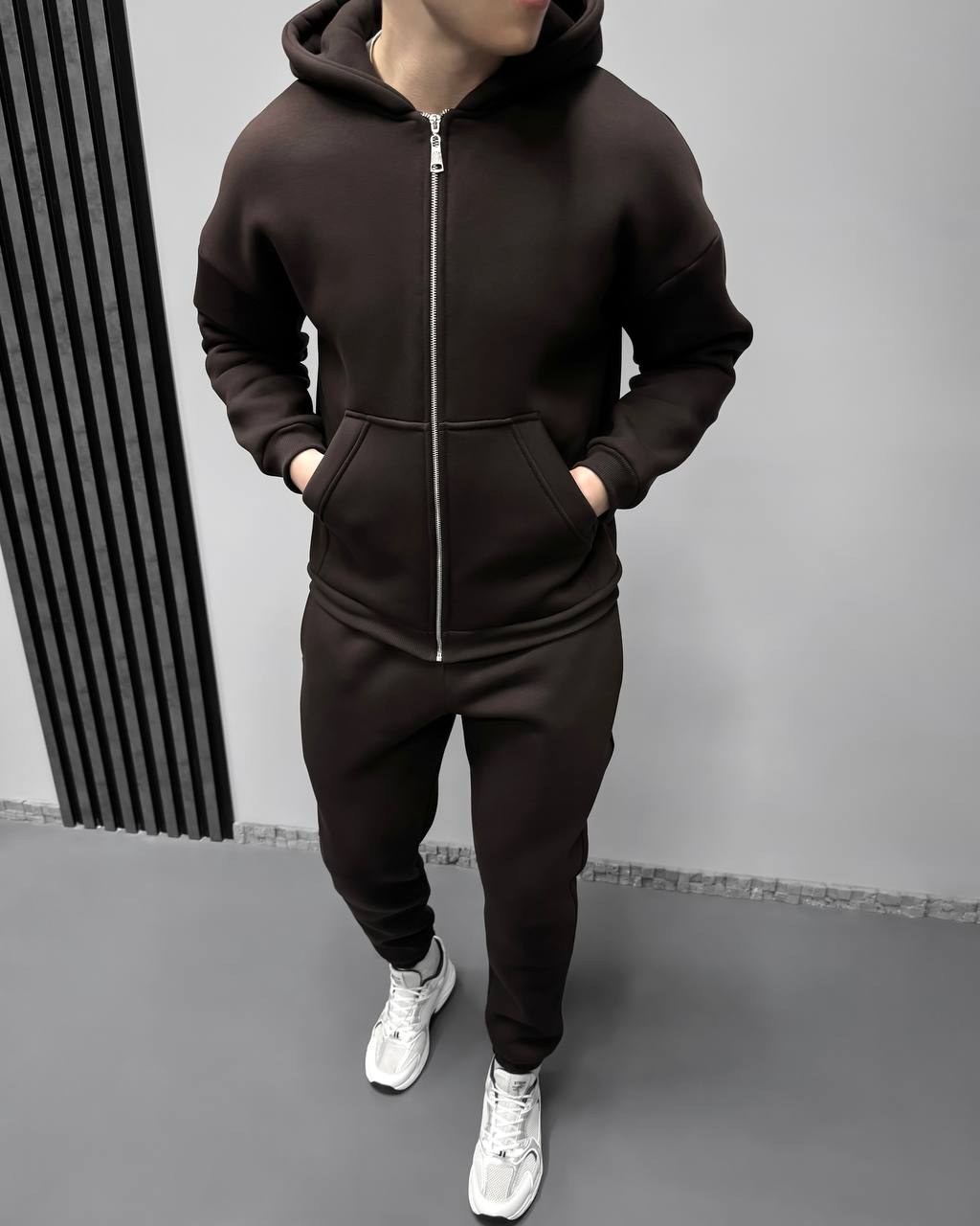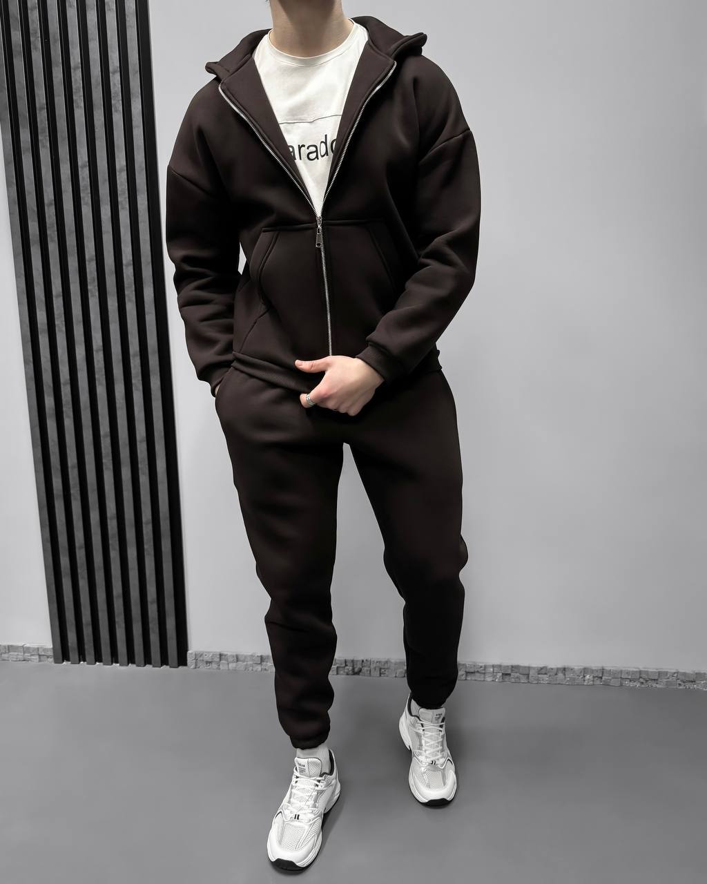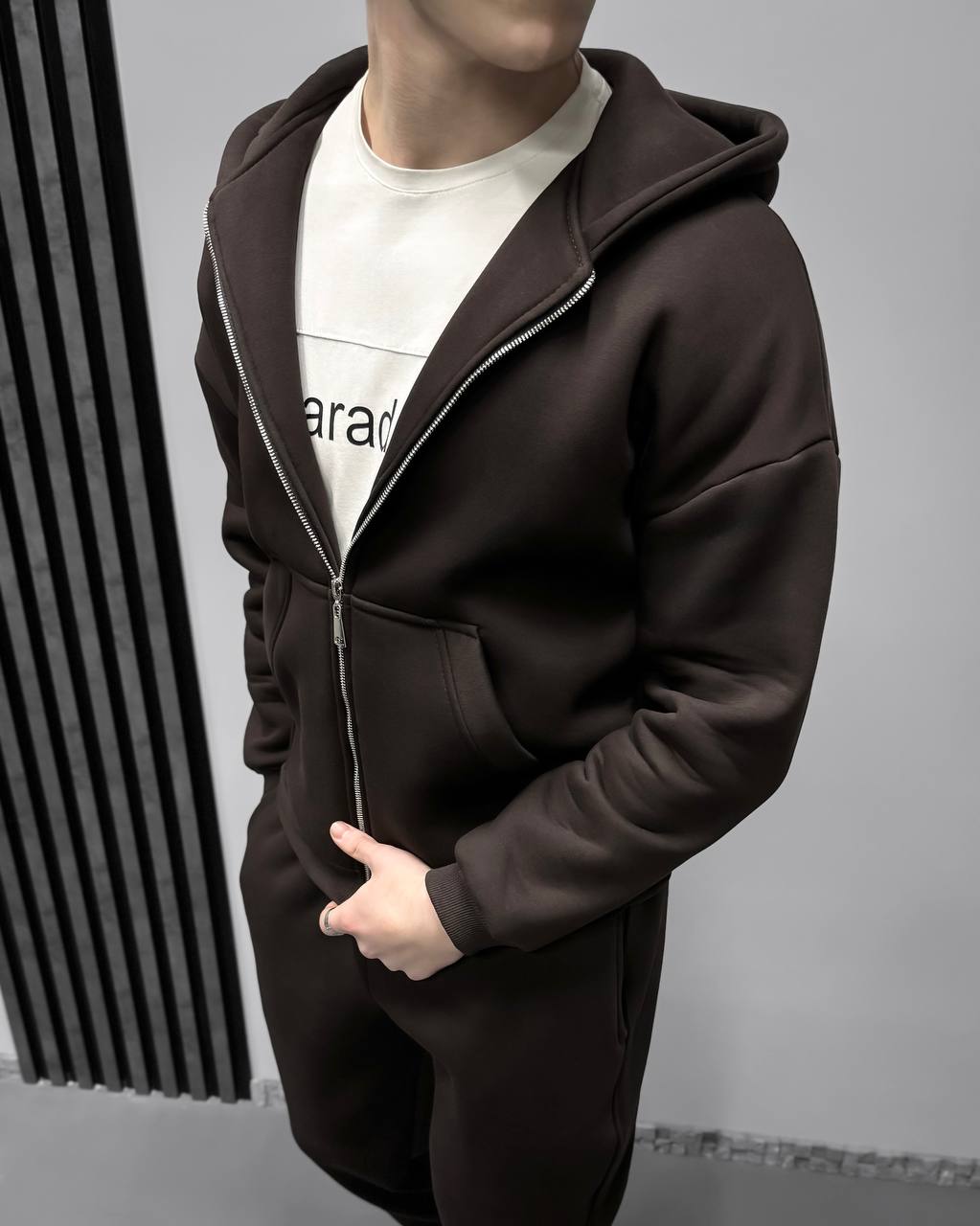 Мужской Базовый Коричневый Костюм Утепленный на Флисе – Зип Худи + Штаны Джоггеры