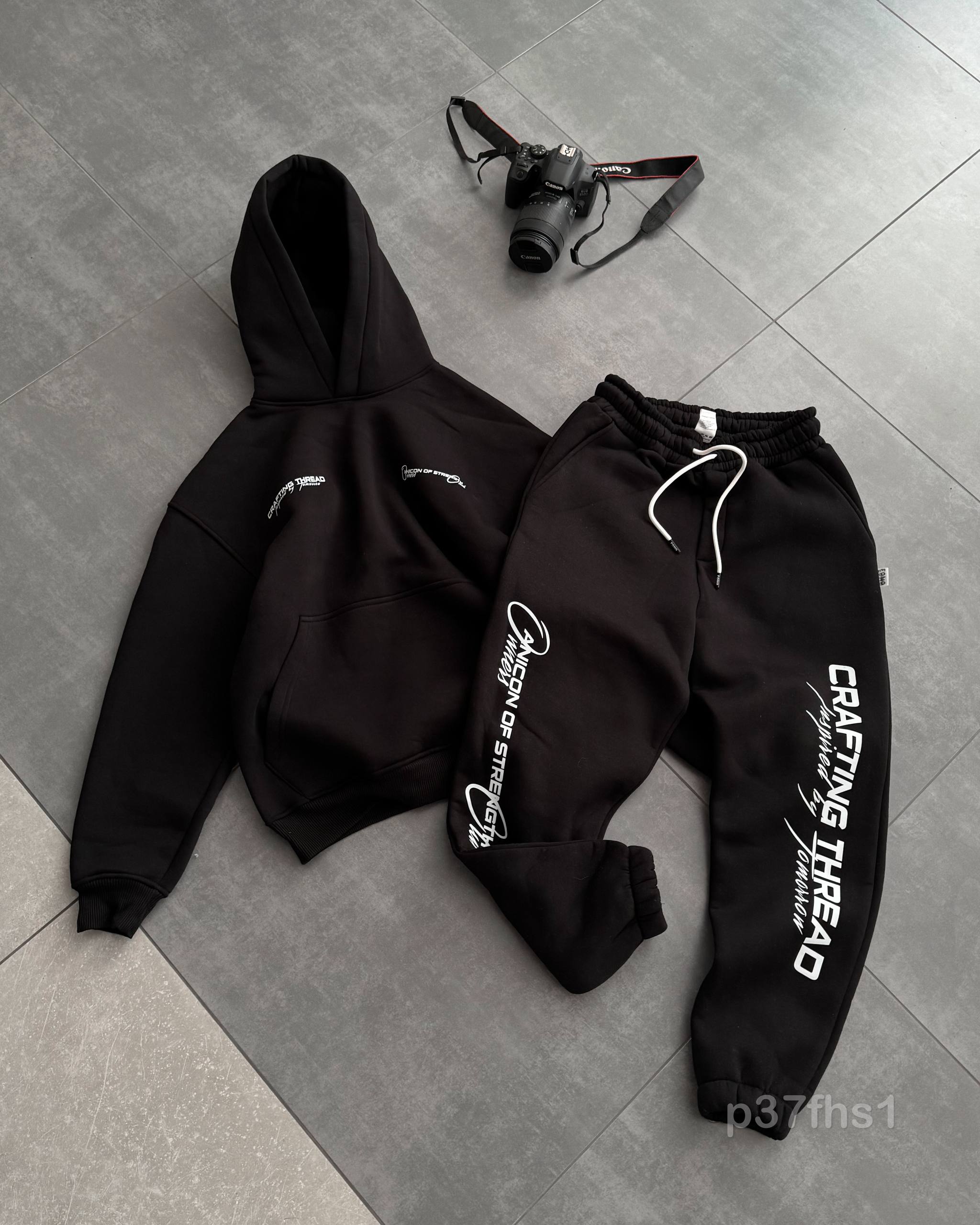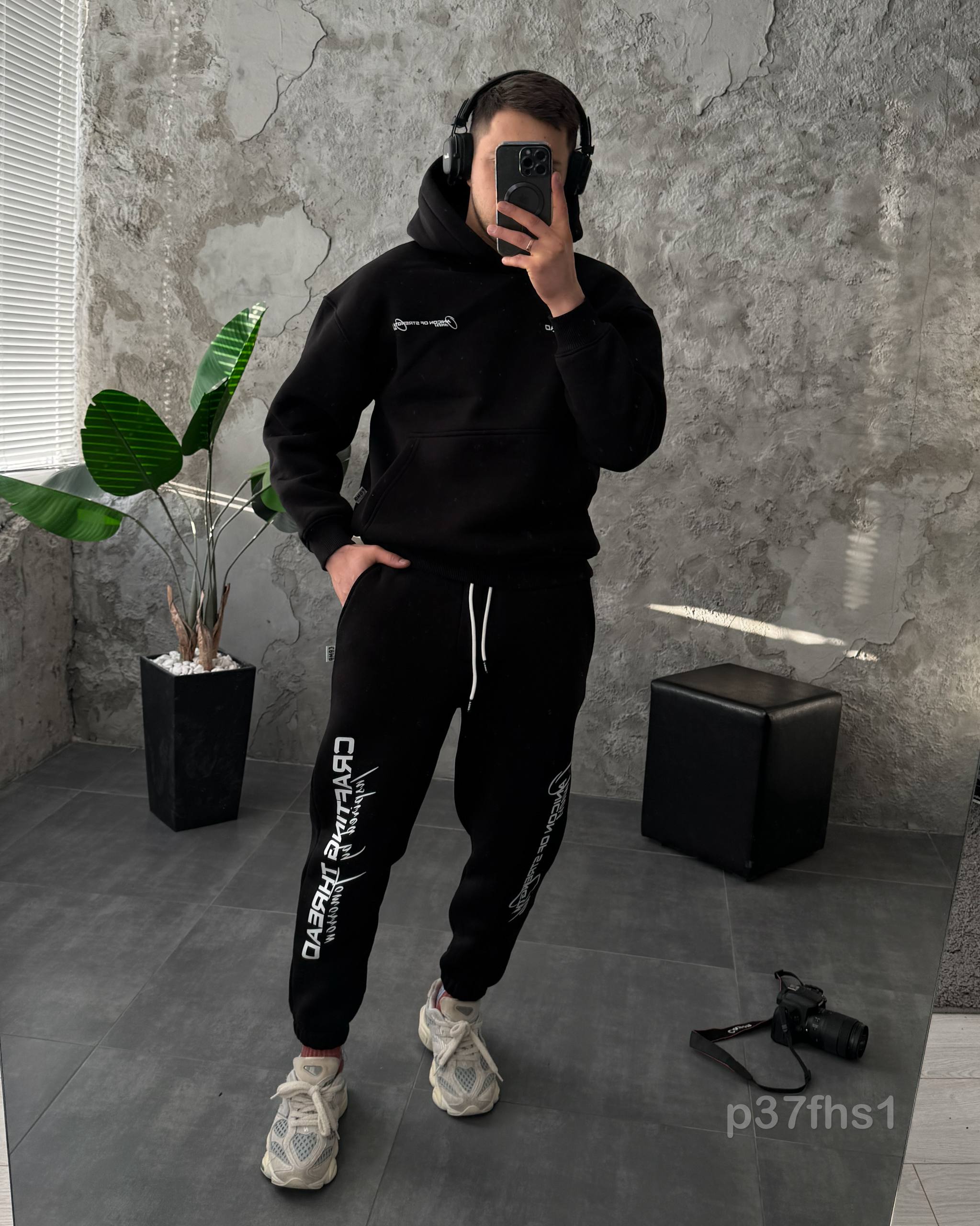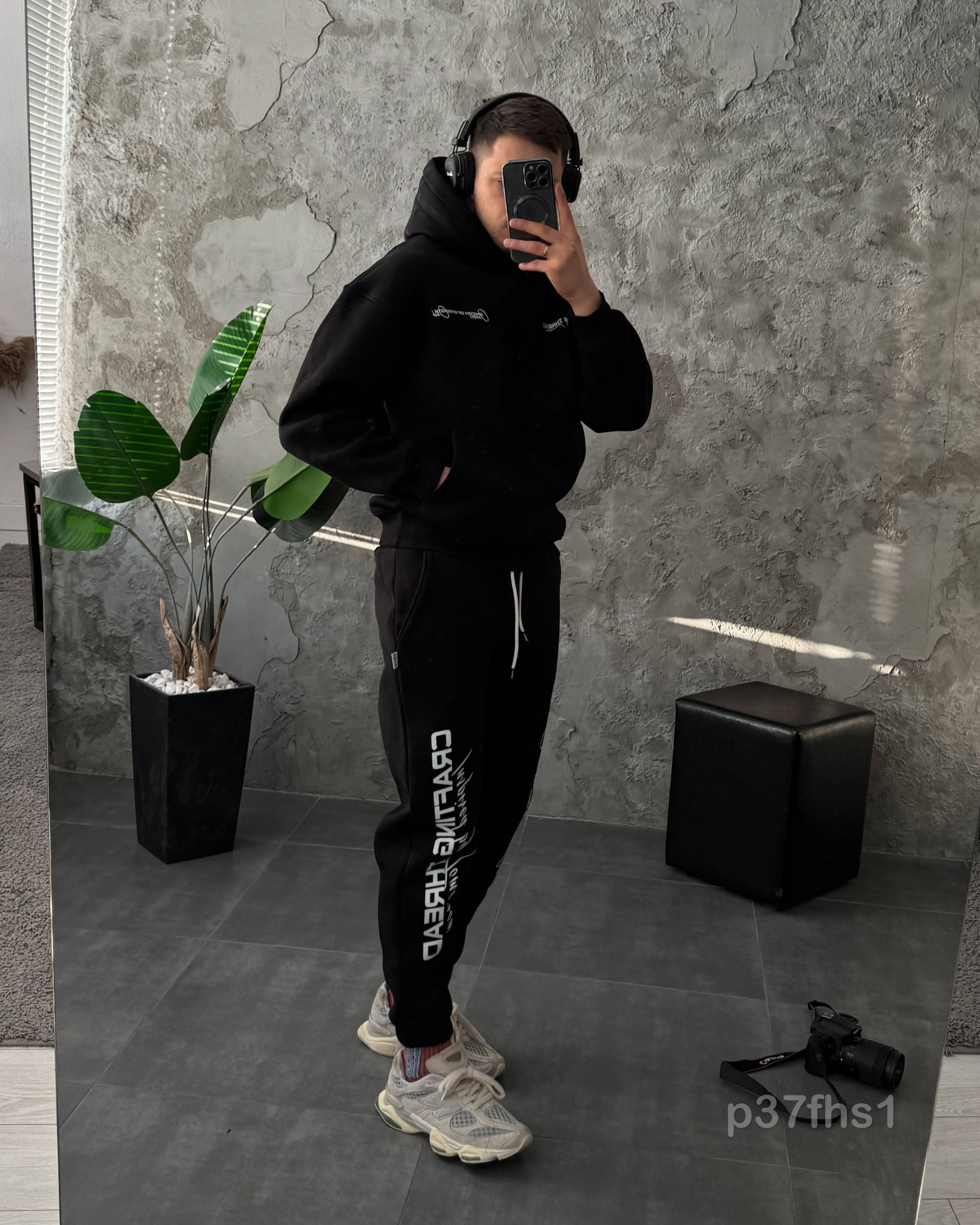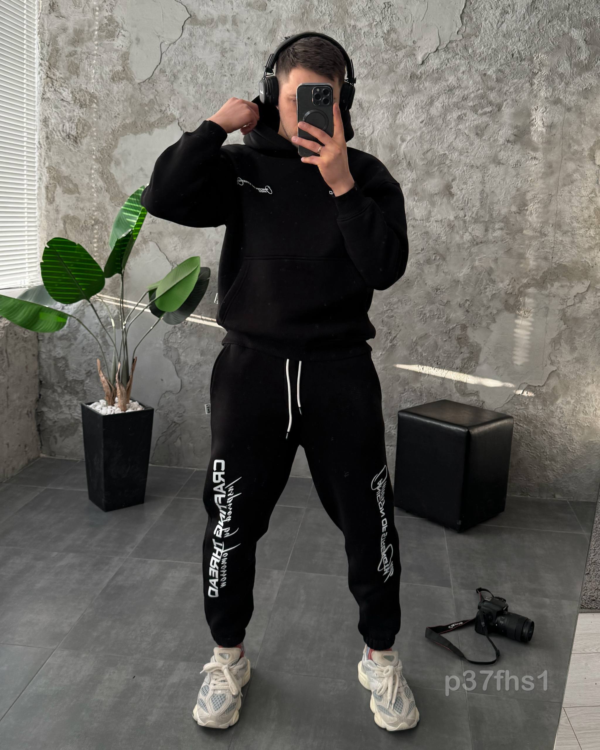 Мужской Базовый Черный Спортивный Костюм Худи Штаны на Флисе с Надписями