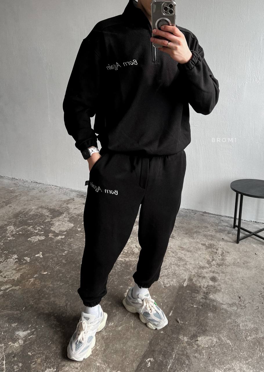 Мужской Базовый Черный Спортивный Костюм Оверсайз с Вышивкой Надпись (Кофта + Джоггеры)