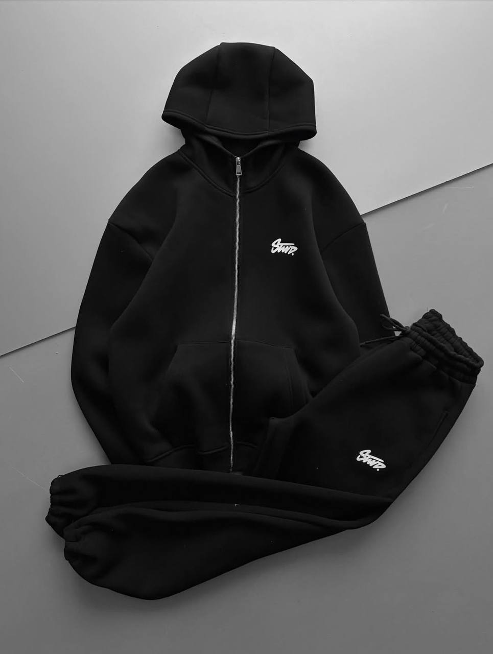 Мужской Базовый Черный Спортивный Костюм Овкрсайз – Зип Худи + Штаны с Фиксаторами