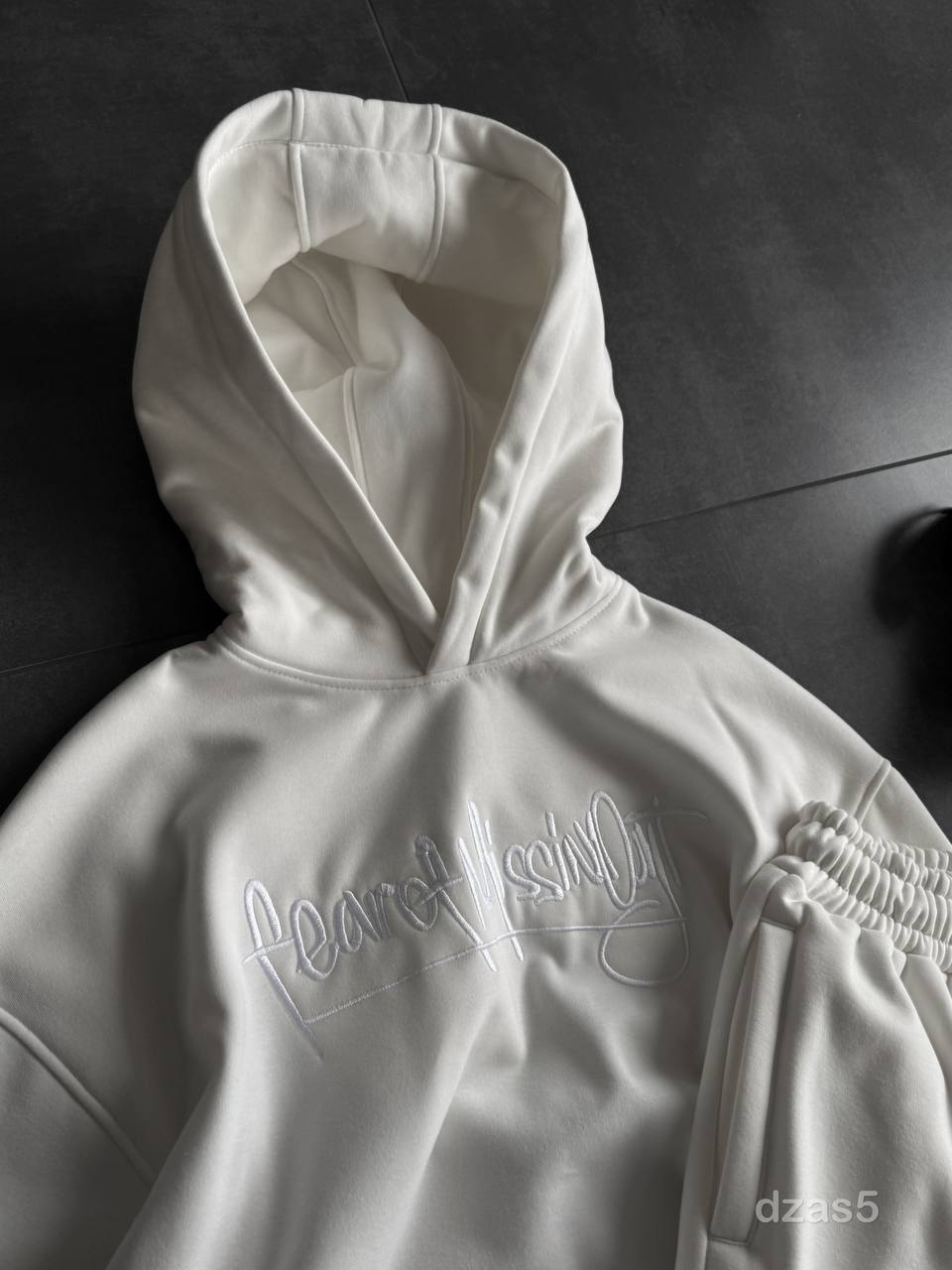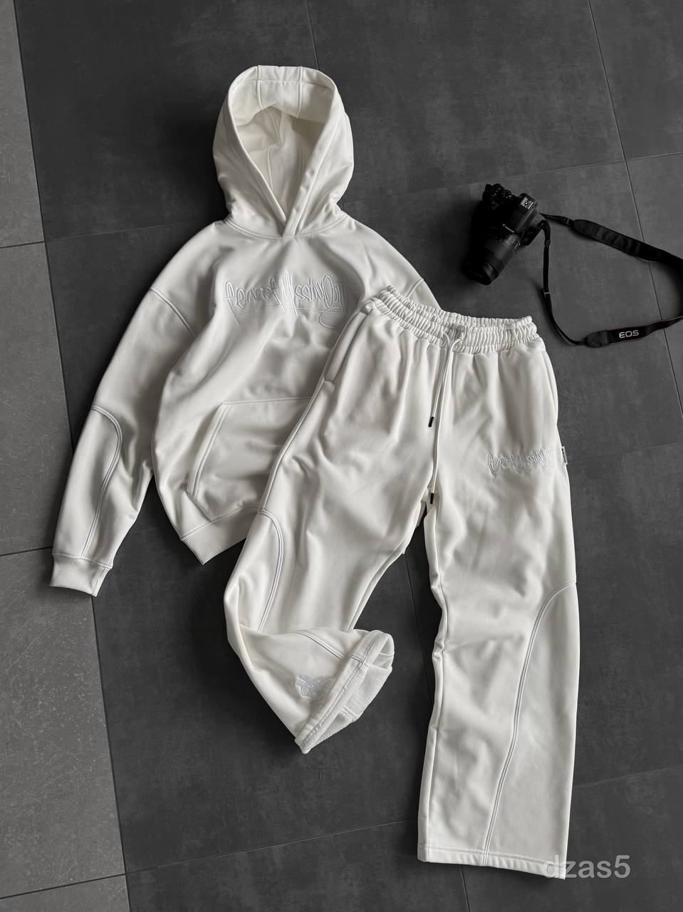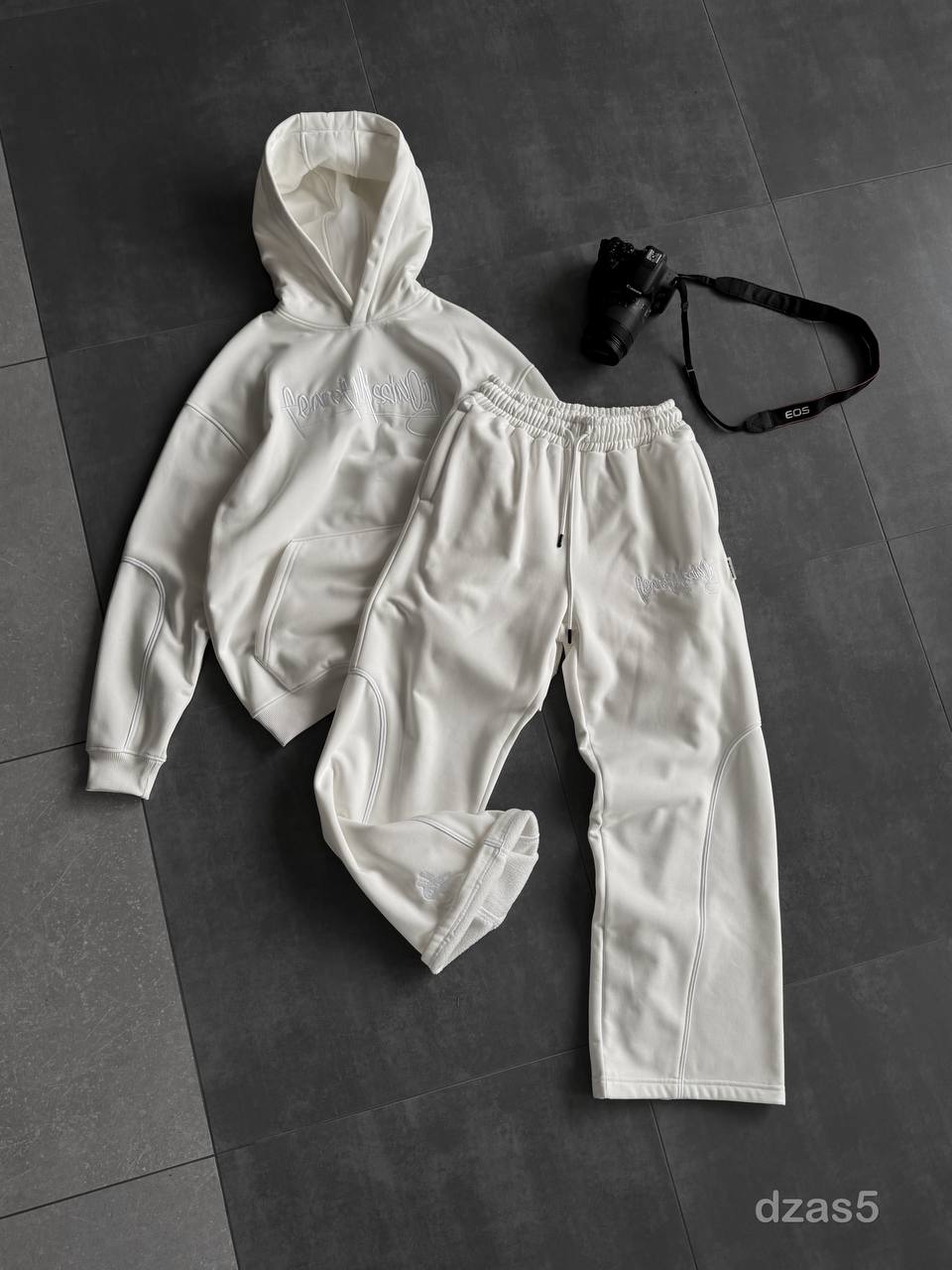 Мужской Белый Костюм Худи Штаны Оверсайз с Вышивкой и Кантом – Утепленный на Флисе