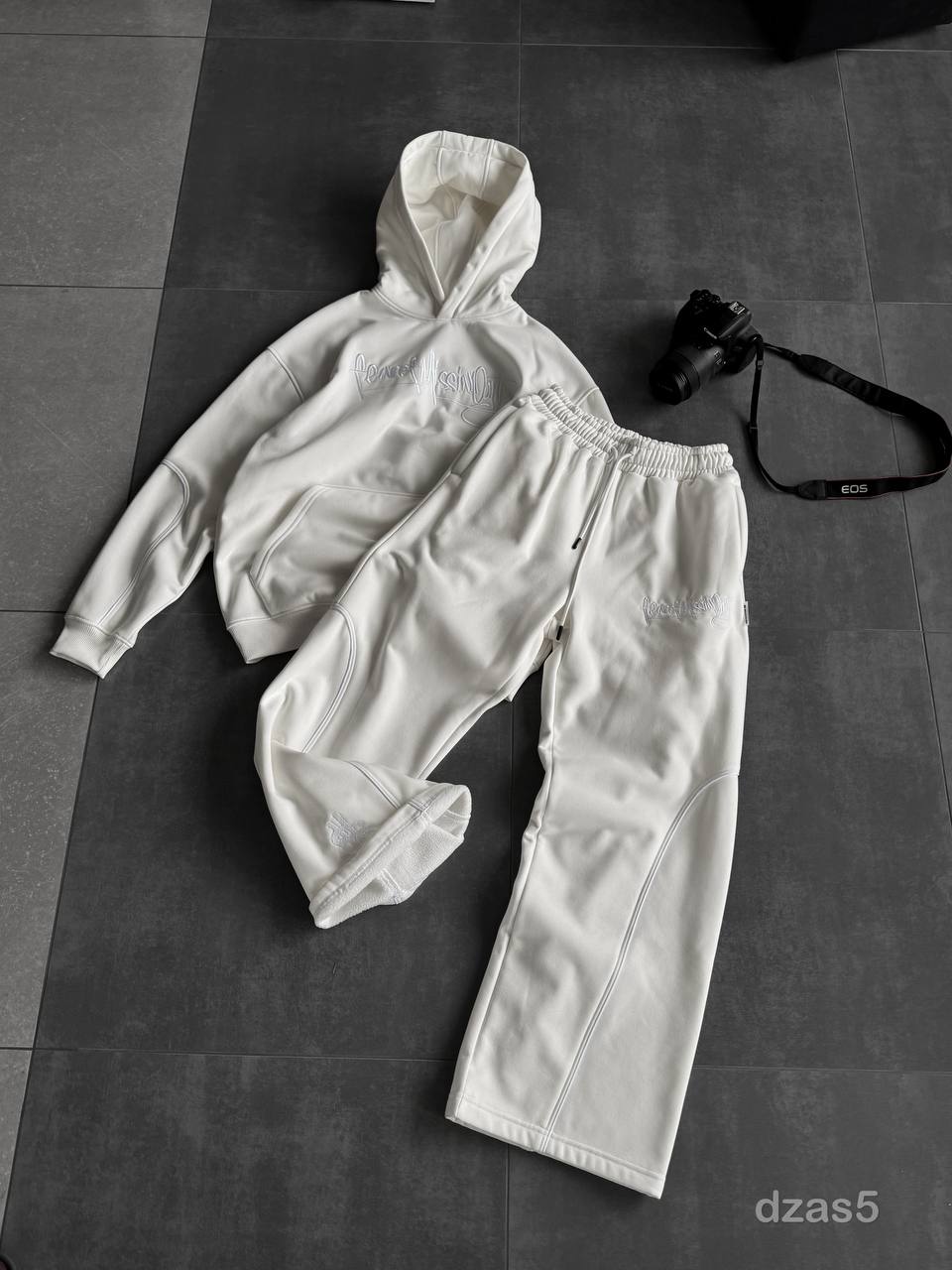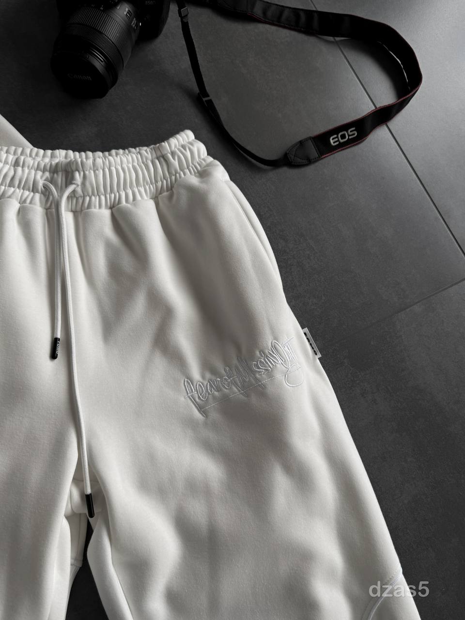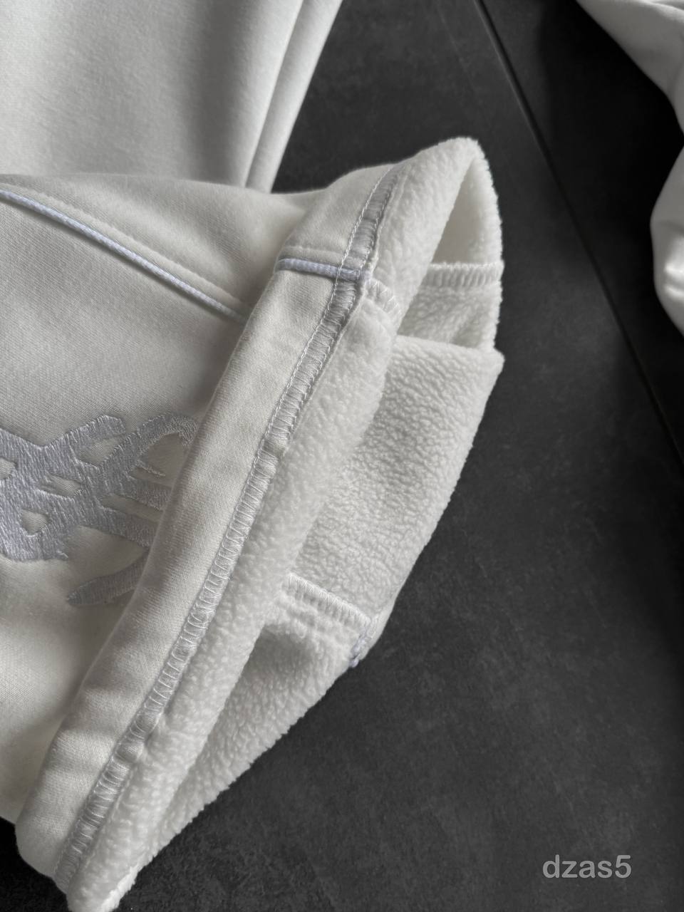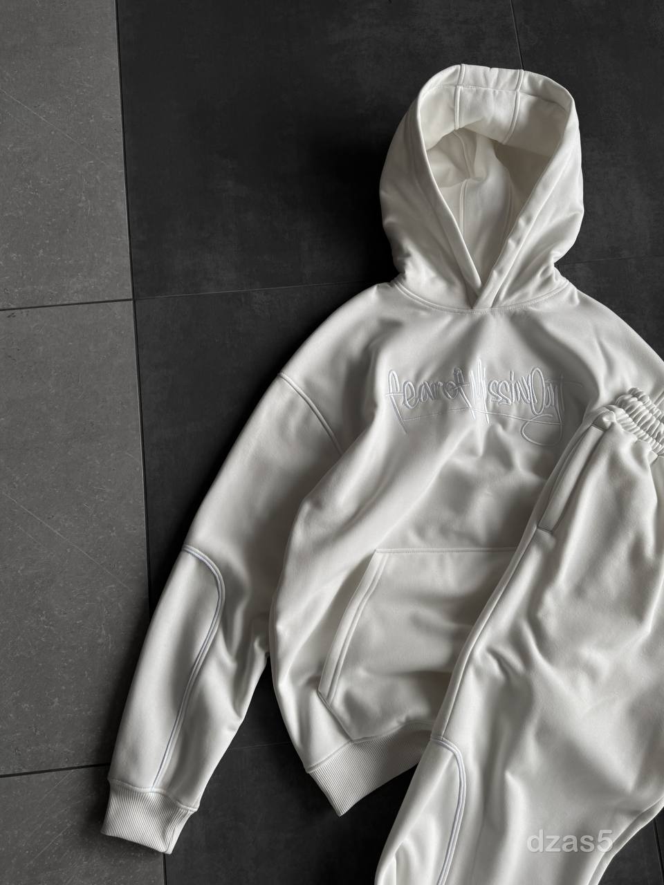 Мужской Белый Костюм Худи Штаны Оверсайз с Вышивкой и Кантом – Утепленный на Флисе
