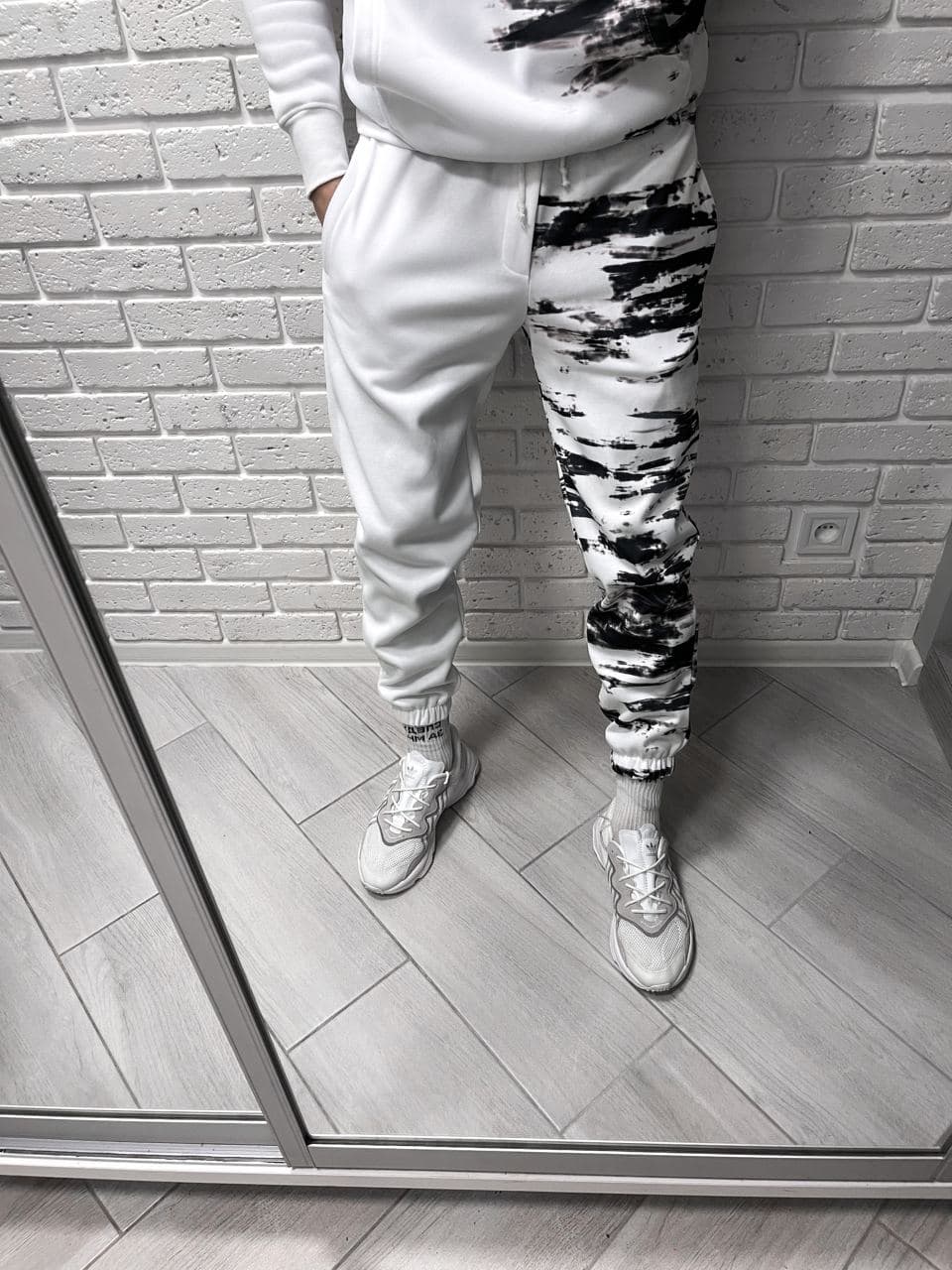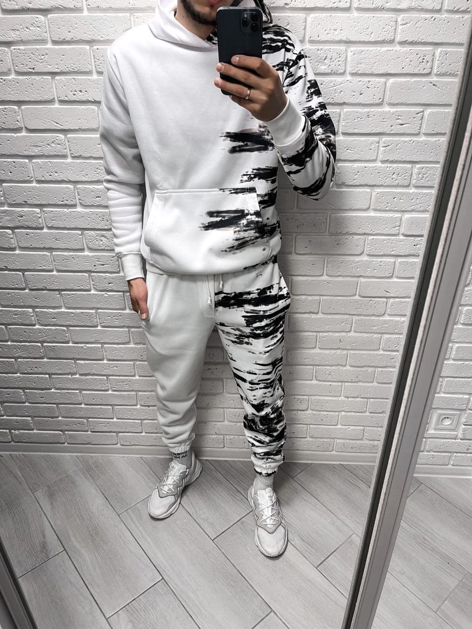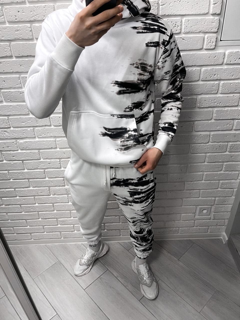 Мужской Белый Спортивный Костюм Оверсайз – на Манжетах с Принтом Узором (Худи + Штаны)
