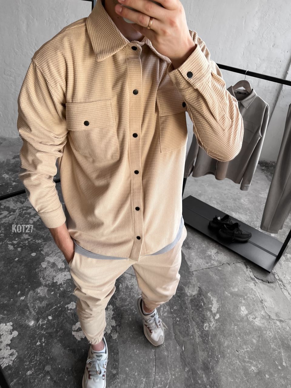 Мужской Бежевый Костюм из Вафельной Ткани – Рубашка на Кнопках + Штаны Джоггеры