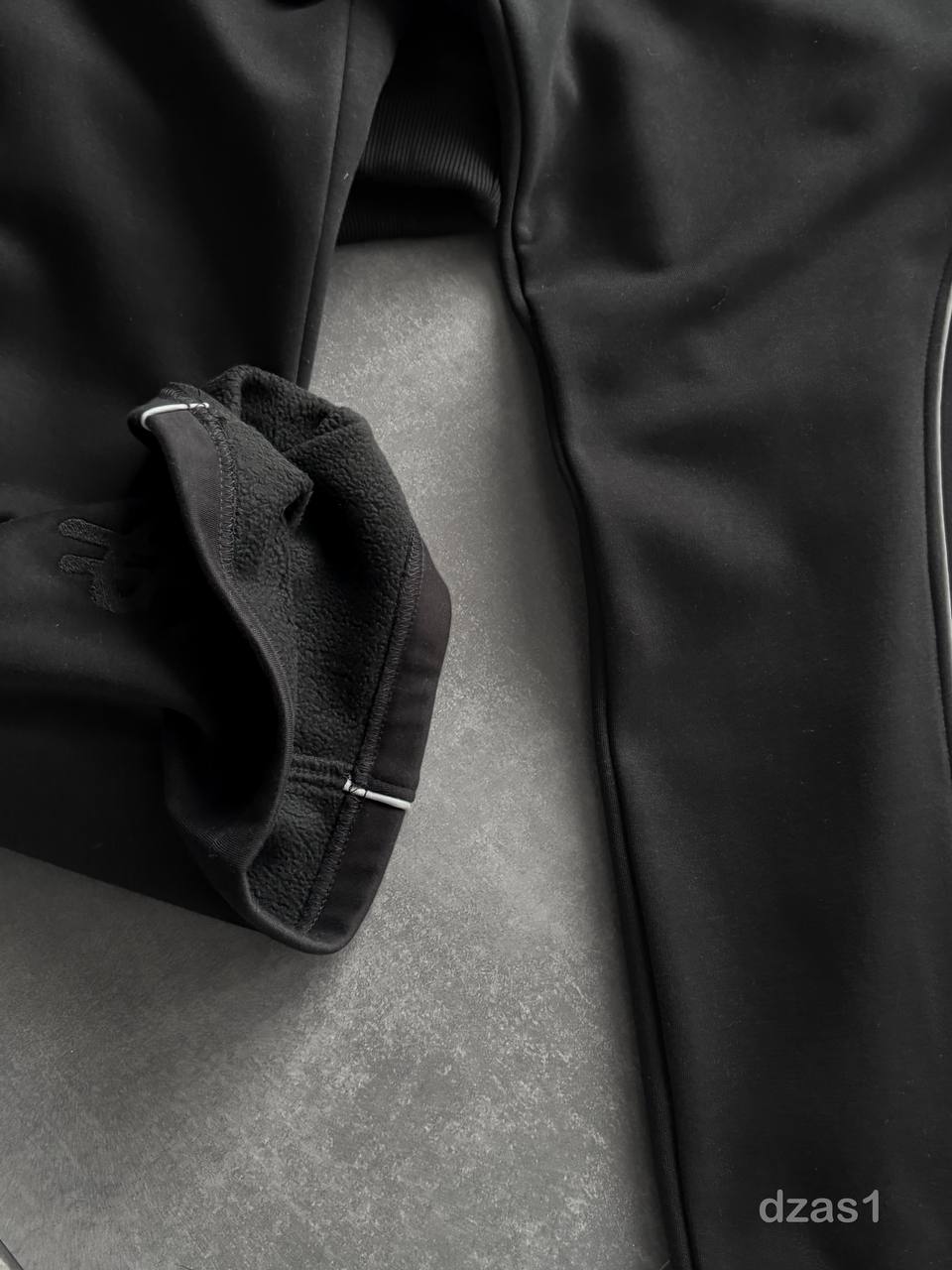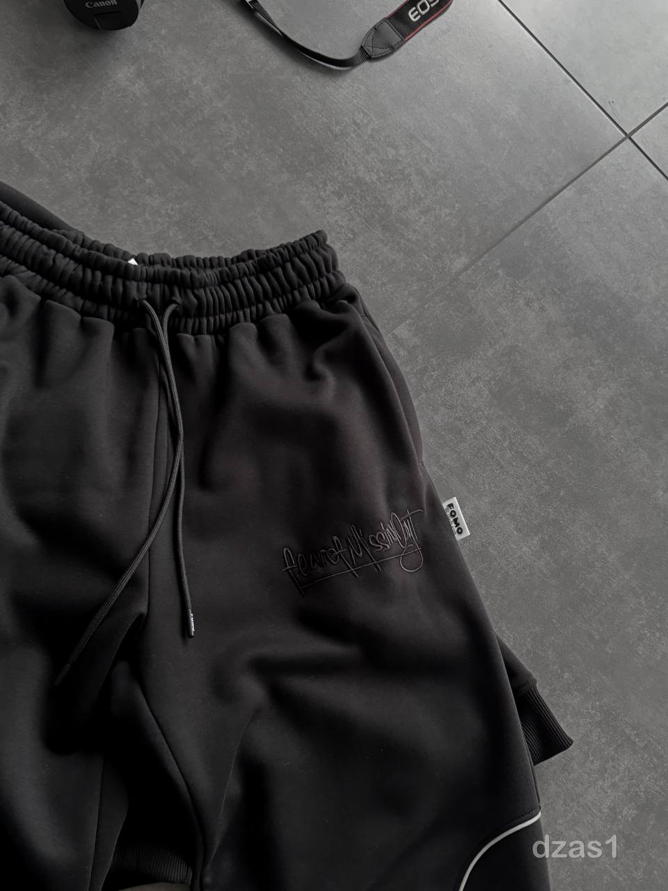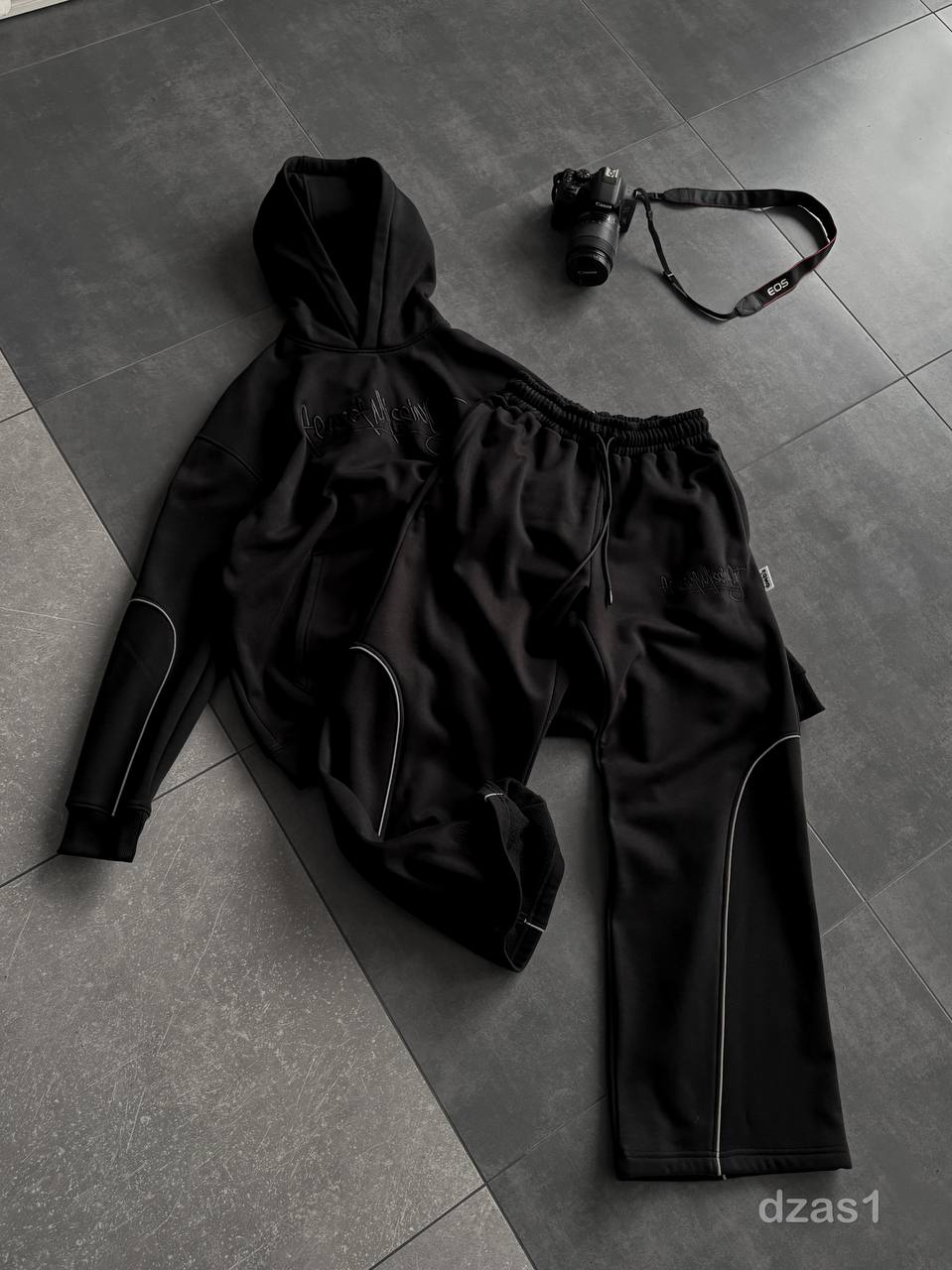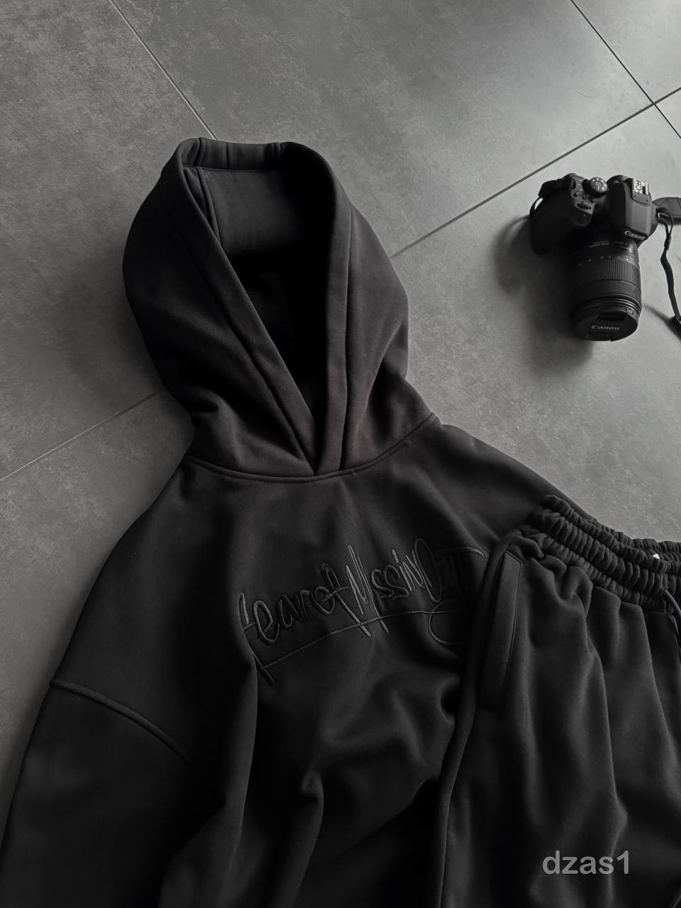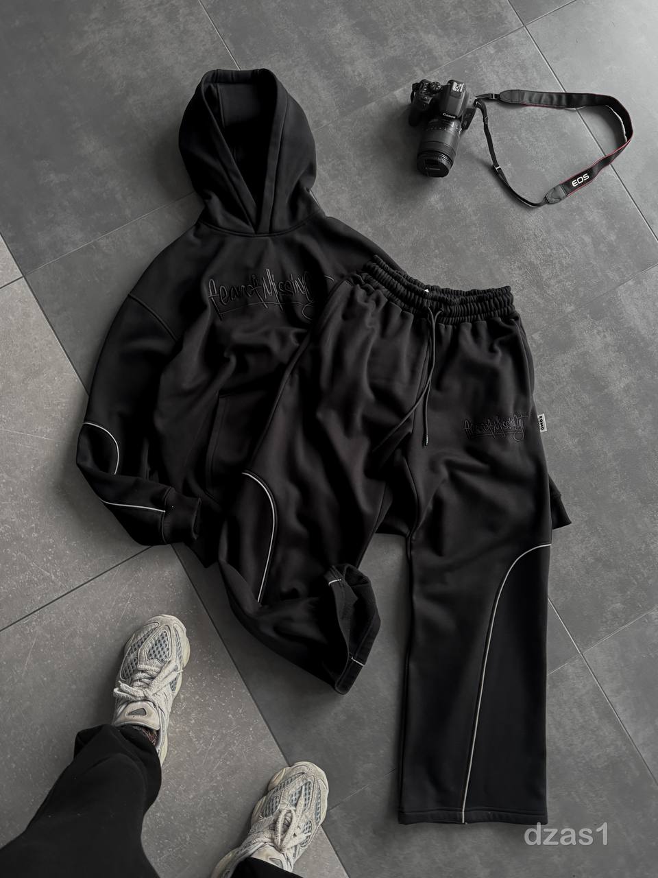 Мужской Черный Костюм Худи Штаны Оверсайз с Вышивкой и Кантом – Утепленный на Флисе
