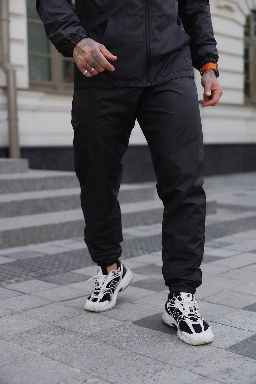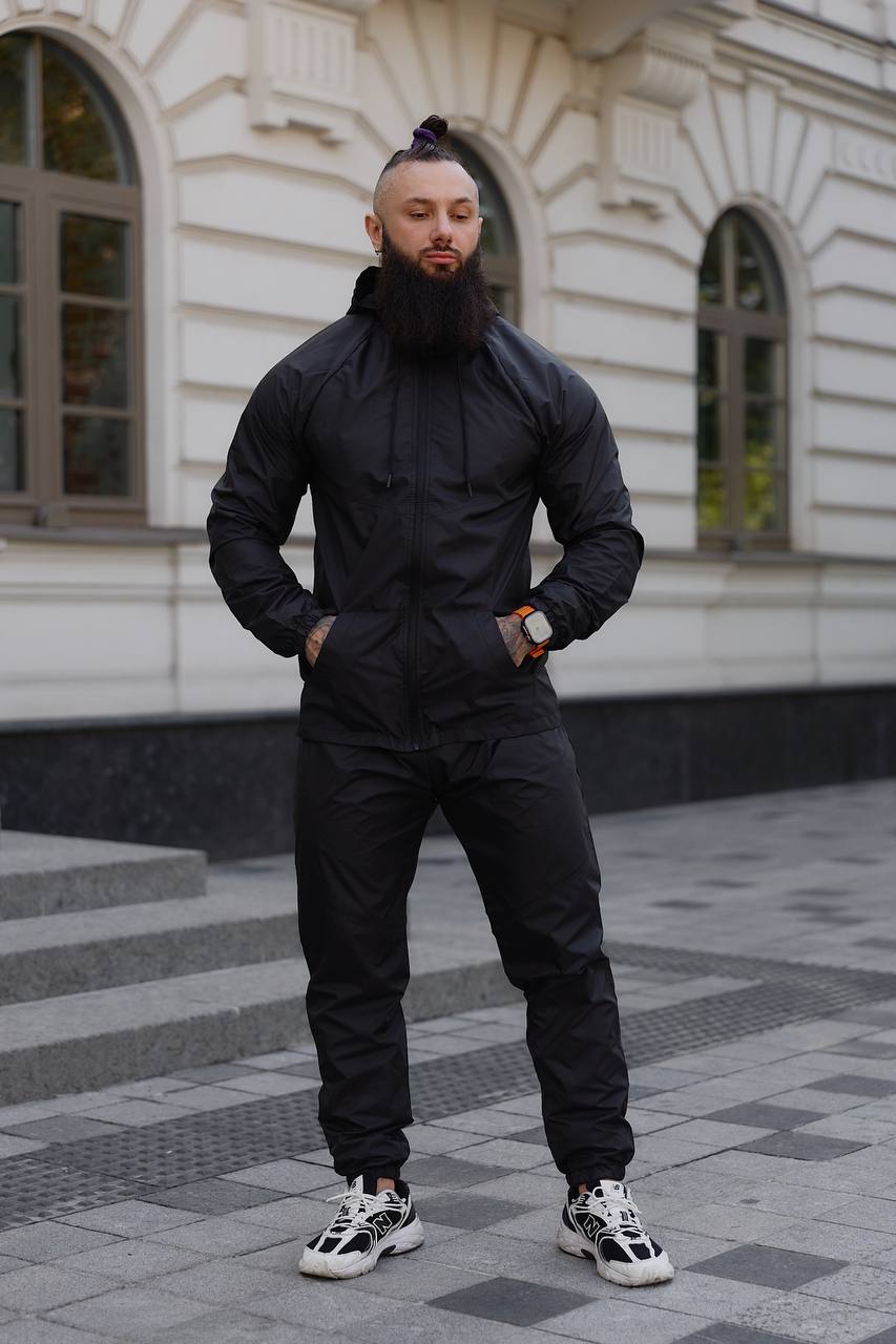 Мужской Черный Костюм Плащевка – Олимпийка с Капюшоном + Штаны с Манжетами