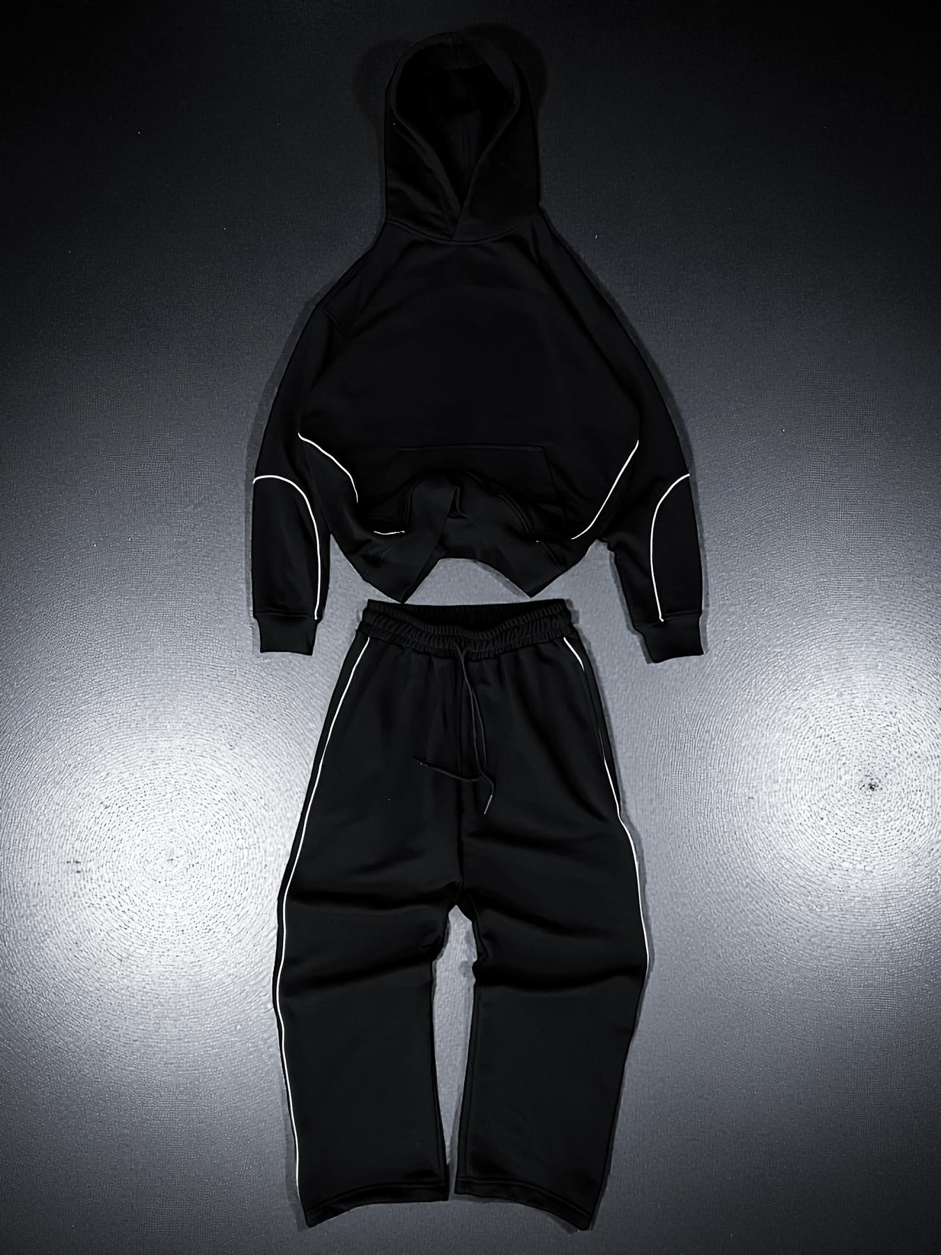 Мужской Черный Спортивный Костюм Оверсайз с Фиксаторами и Кантом (Худи + Штаны)