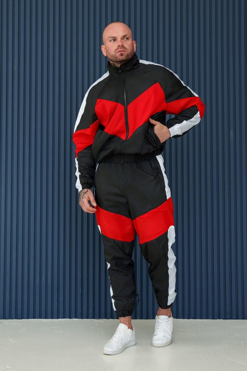 Мужской Черный Спортивный Костюм Плащевка с Красными Вставками – Олимпийка + Джоггеры