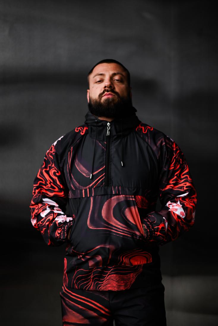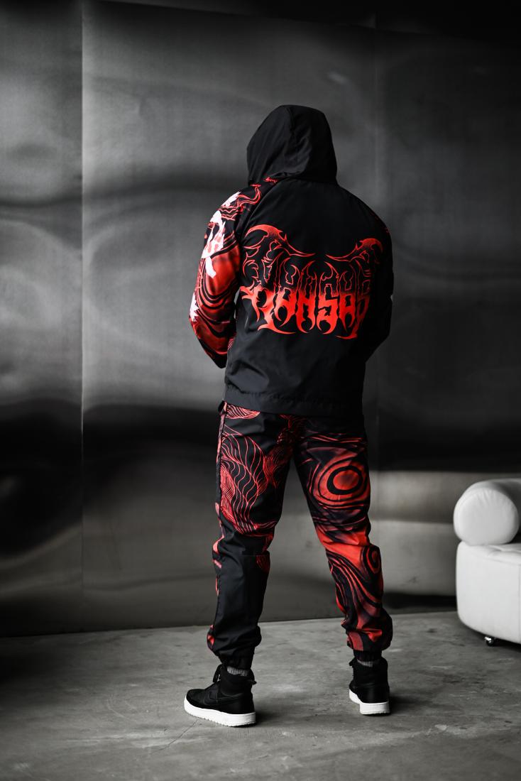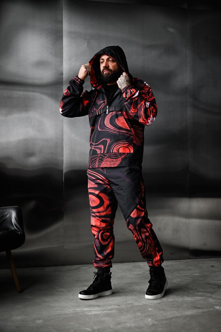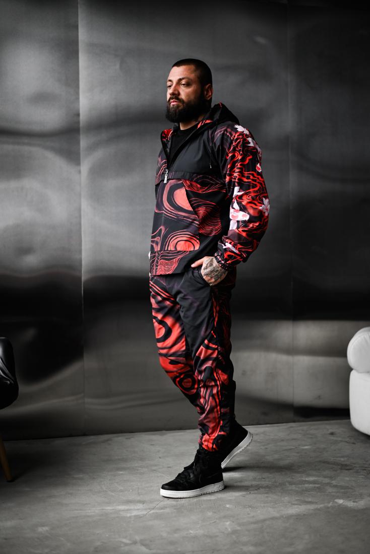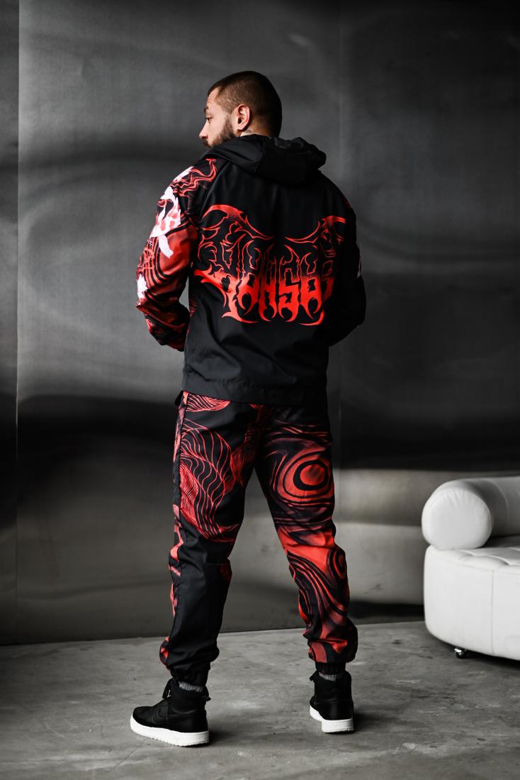 Мужской Черный Спортивный Костюм Плащевка в Красный Принт (Анорак + Джоггеры)