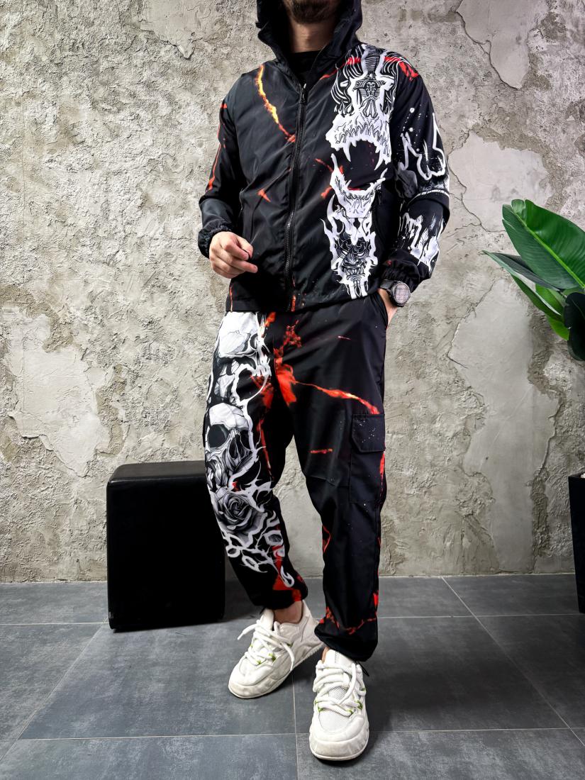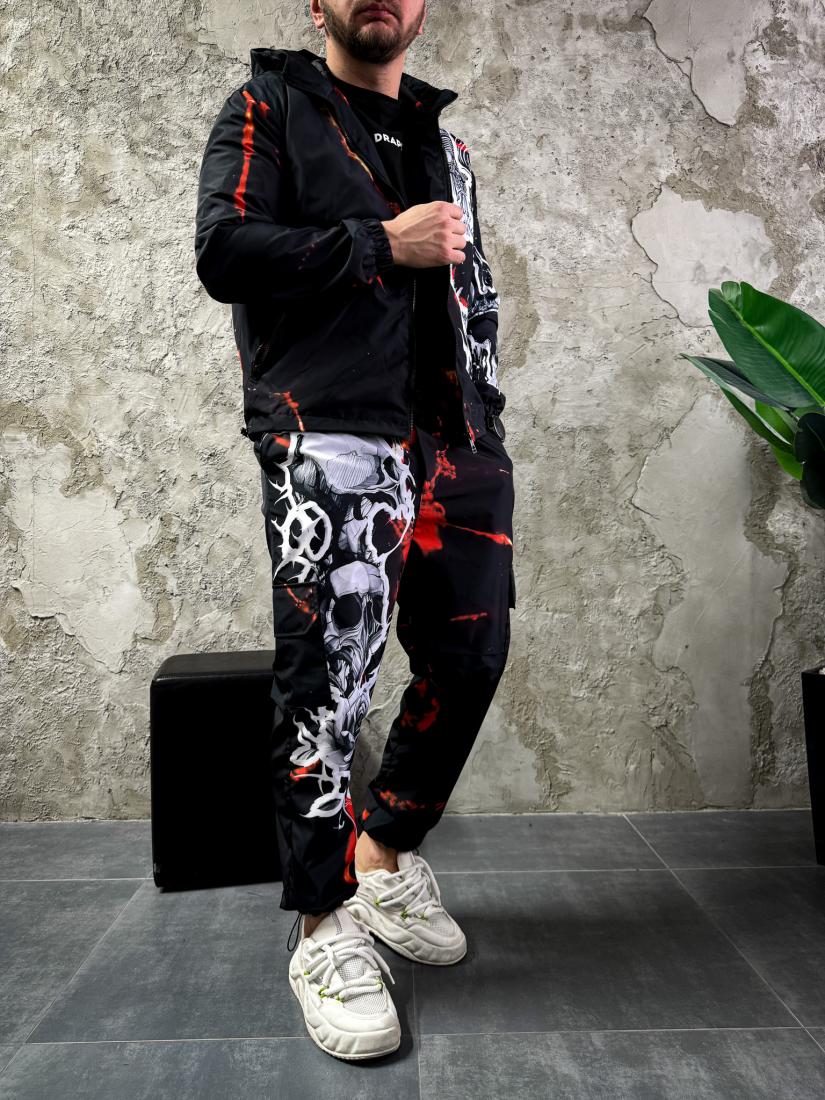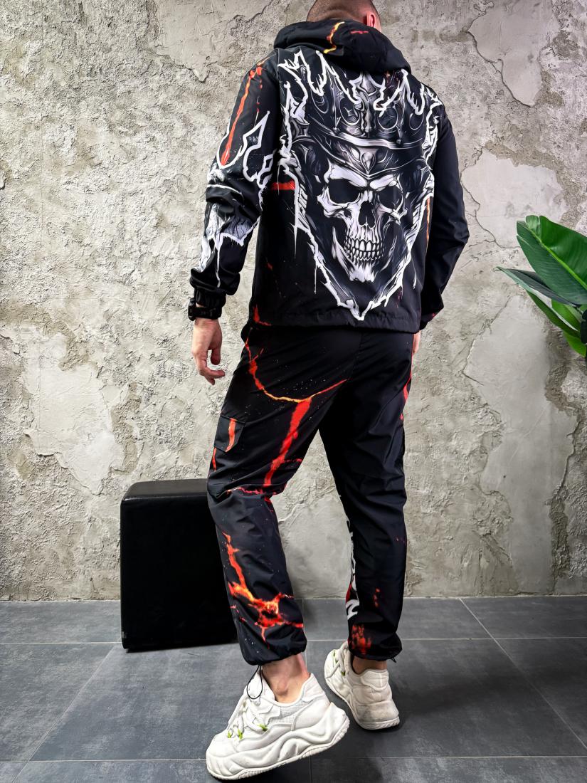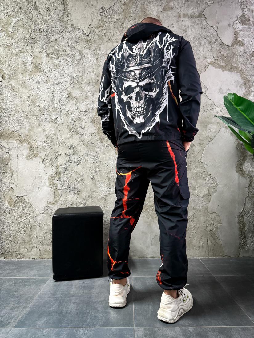 Мужской Черный Спортивный Костюм Плащевка в Принт Череп (Анорак + Джоггеры)
