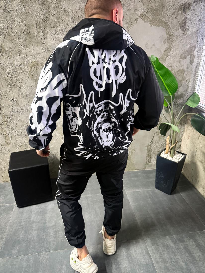 Мужской Черный Спортивный Костюм Плащевка в Принт Доберманы (Анорак + Джоггеры)