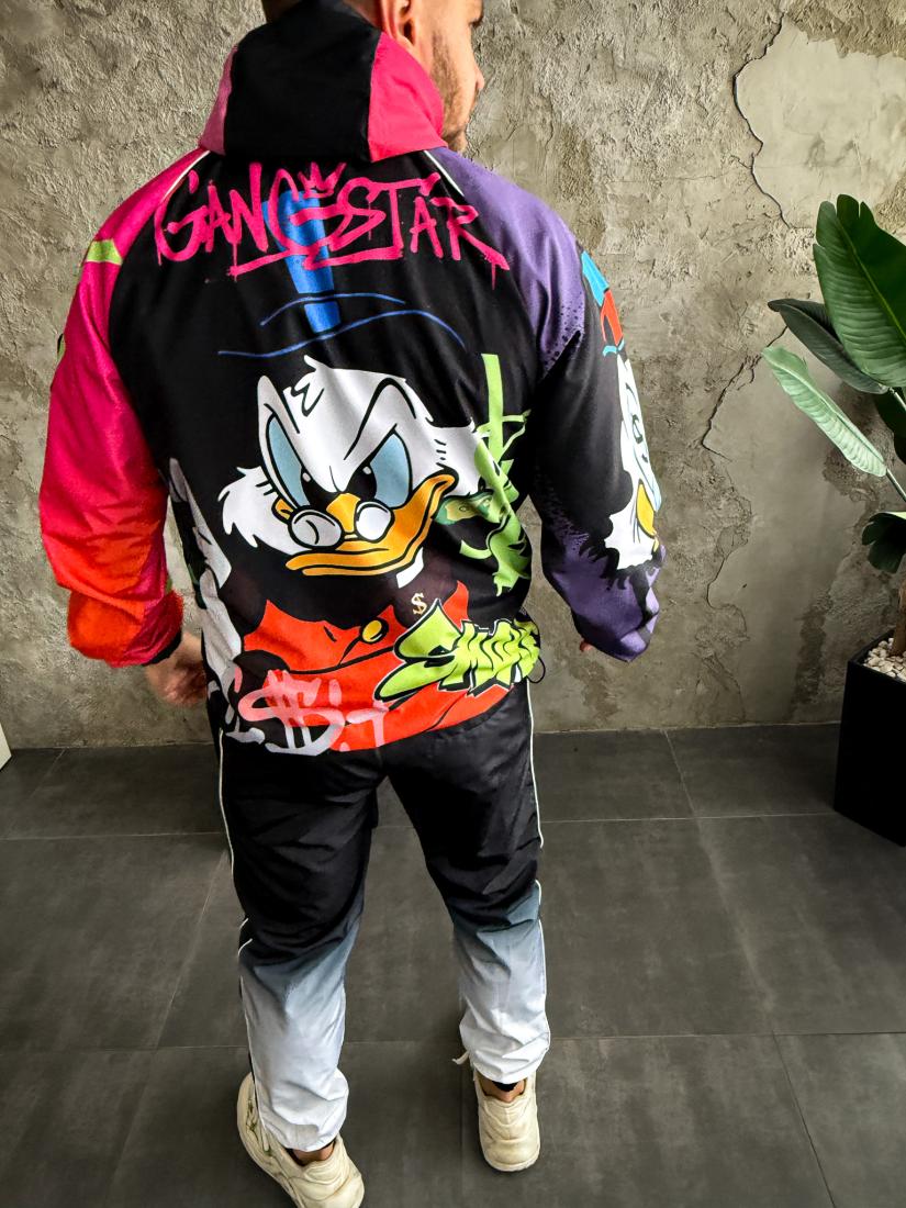 Мужской Черный Спортивный Костюм Плащевка в Принт Скрудж МакДак (Анорак + Джоггеры)
