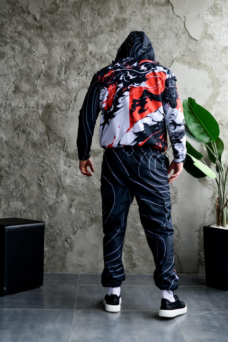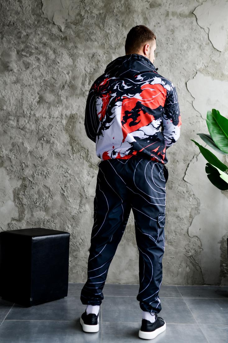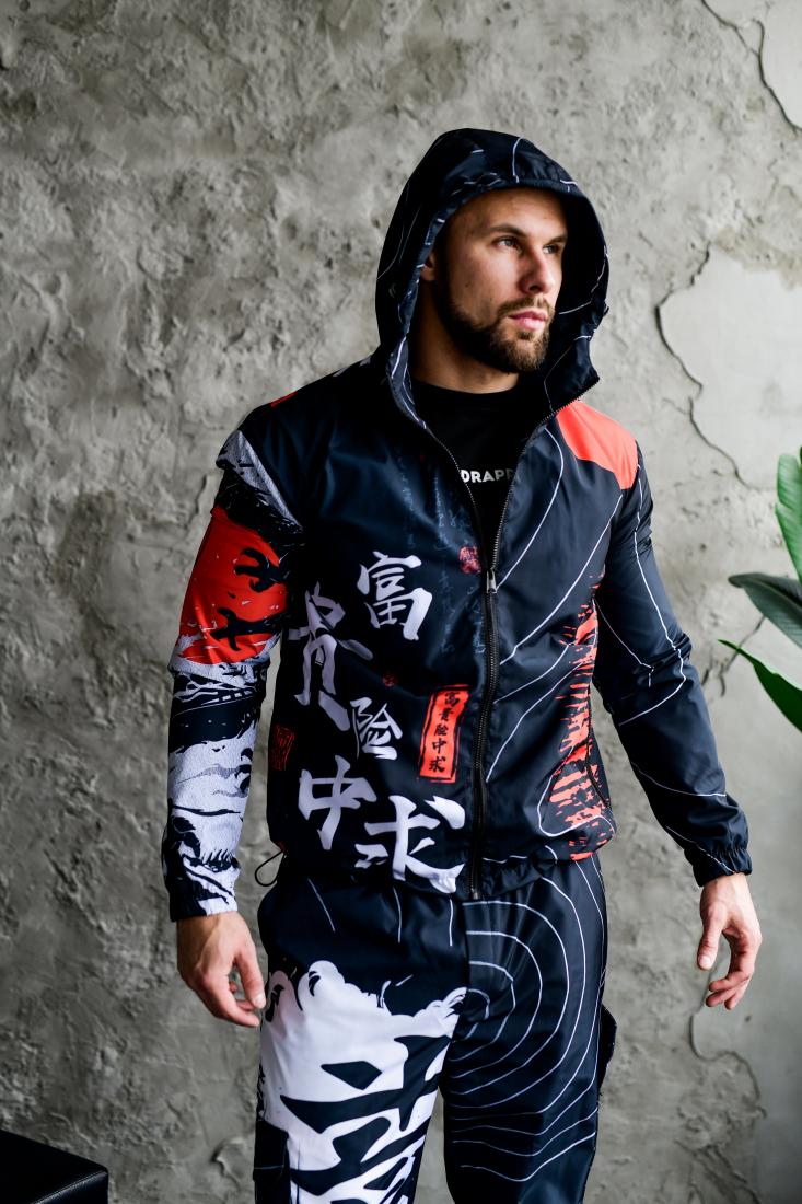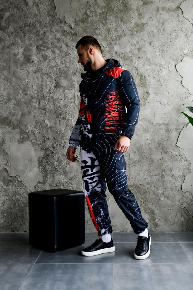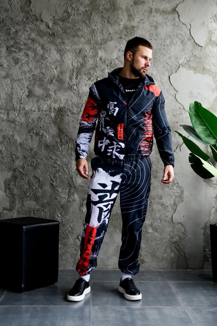 Мужской Черный Спортивный Костюм Плащевка в Принт Япония (Анорак + Джоггеры)