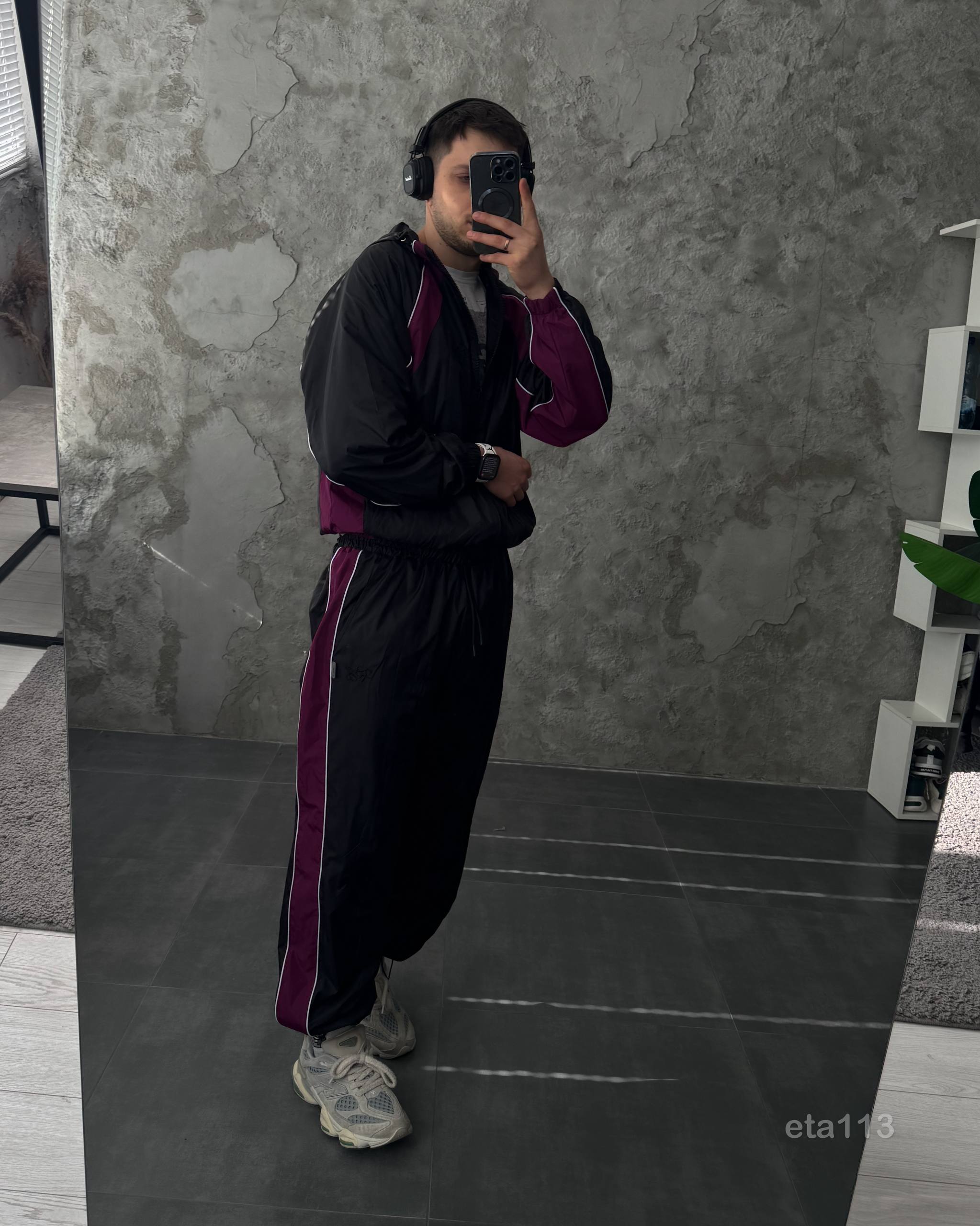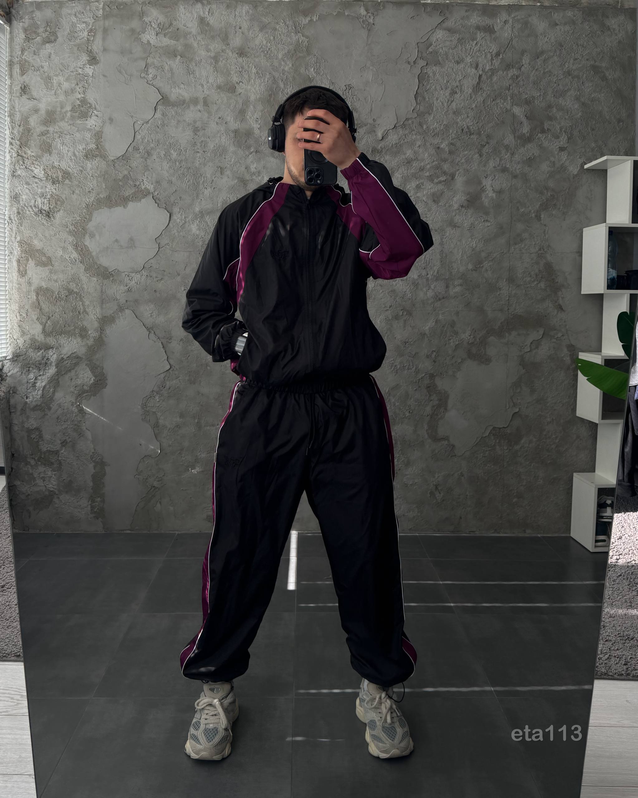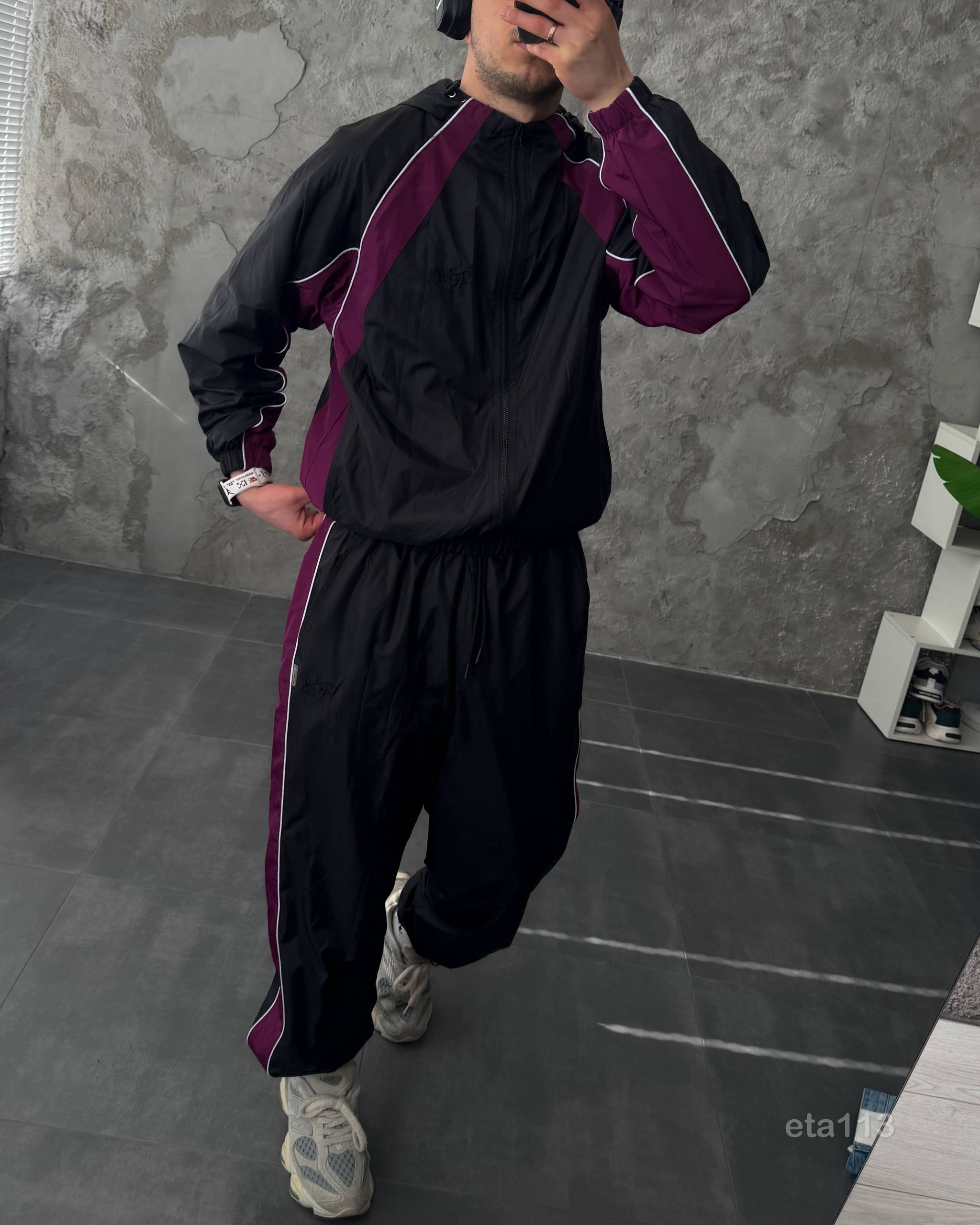 Мужской Черный Спортивный Костюм с Фиолетовыми Вставками Лампасами – Свободного Кроя Плащевка на Змейке