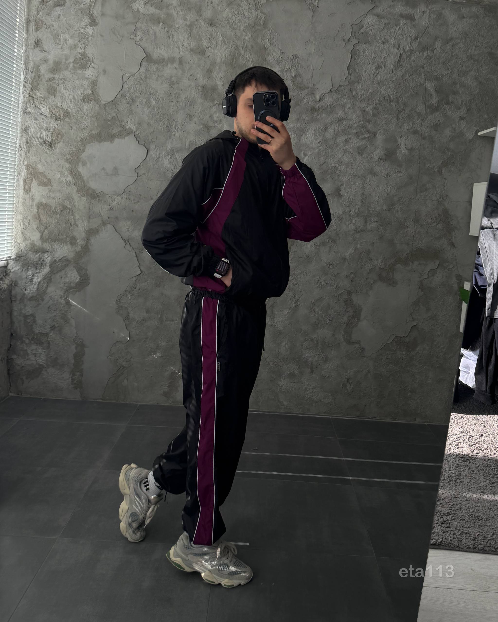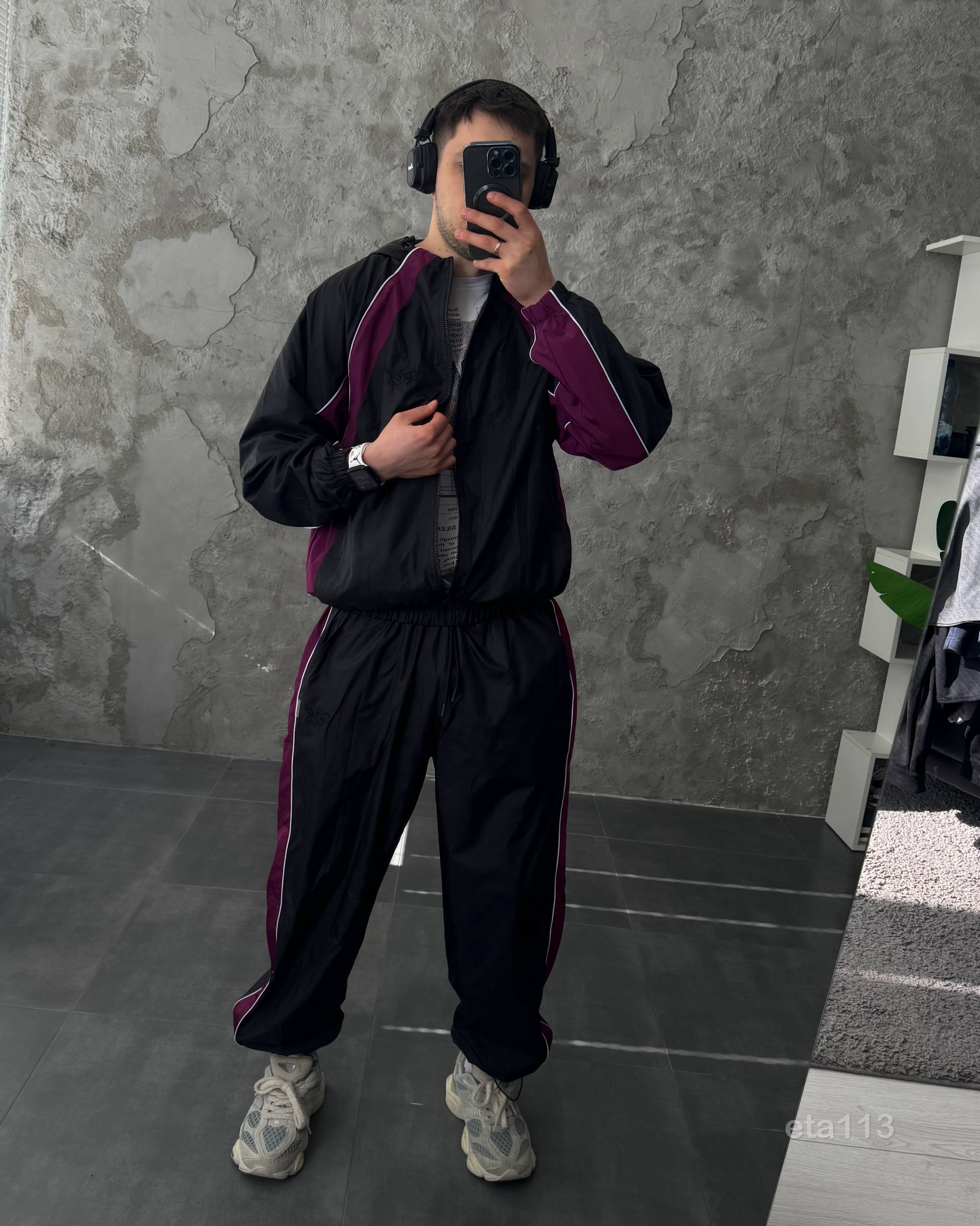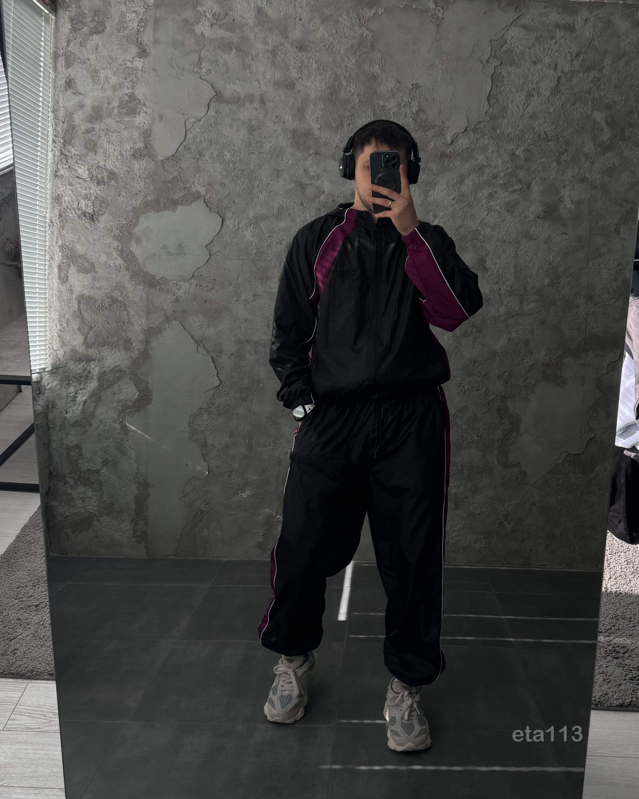 Мужской Черный Спортивный Костюм с Фиолетовыми Вставками Лампасами – Свободного Кроя Плащевка на Змейке